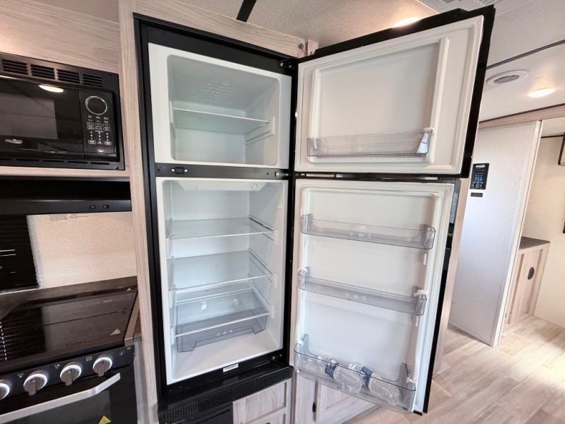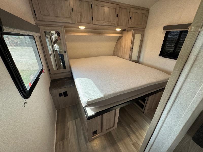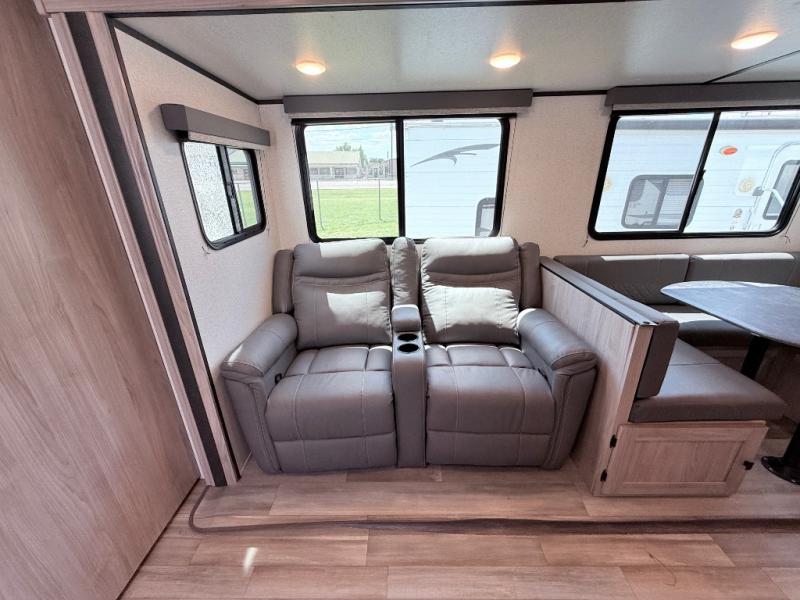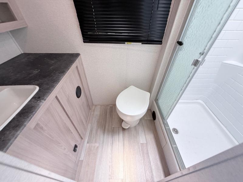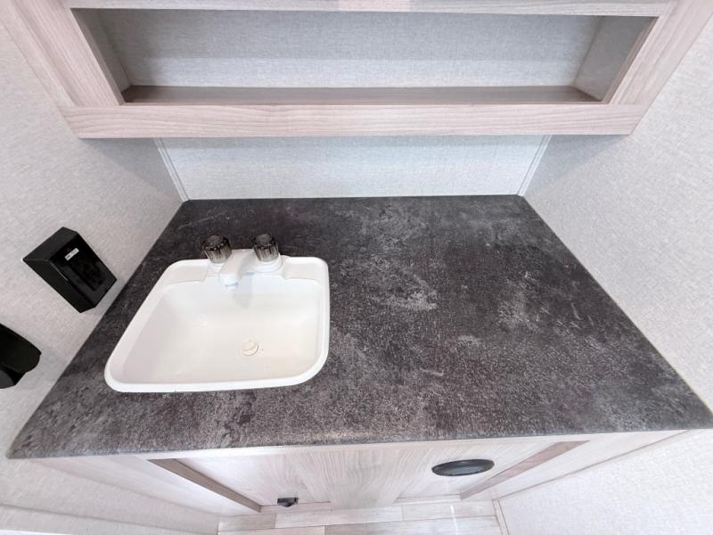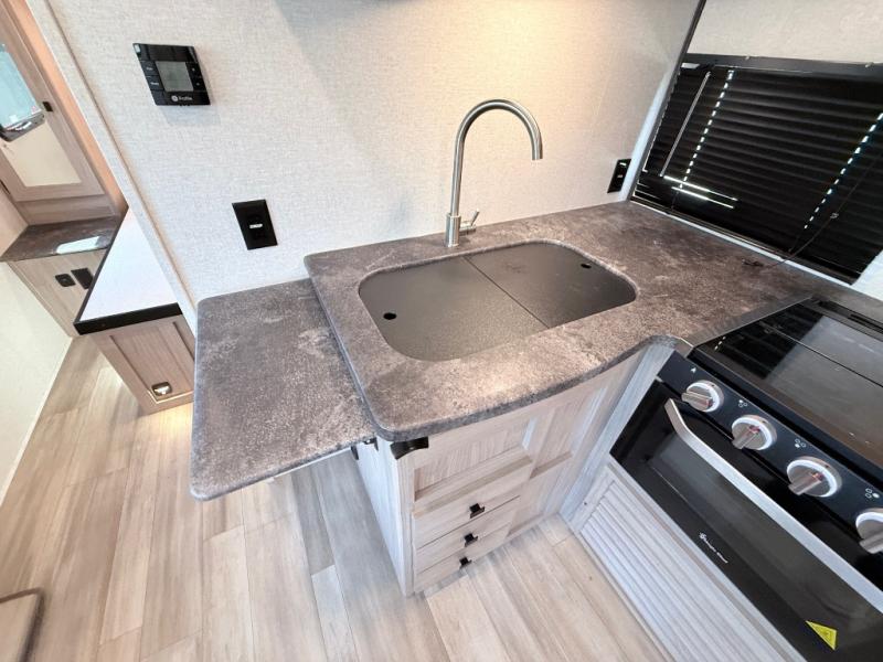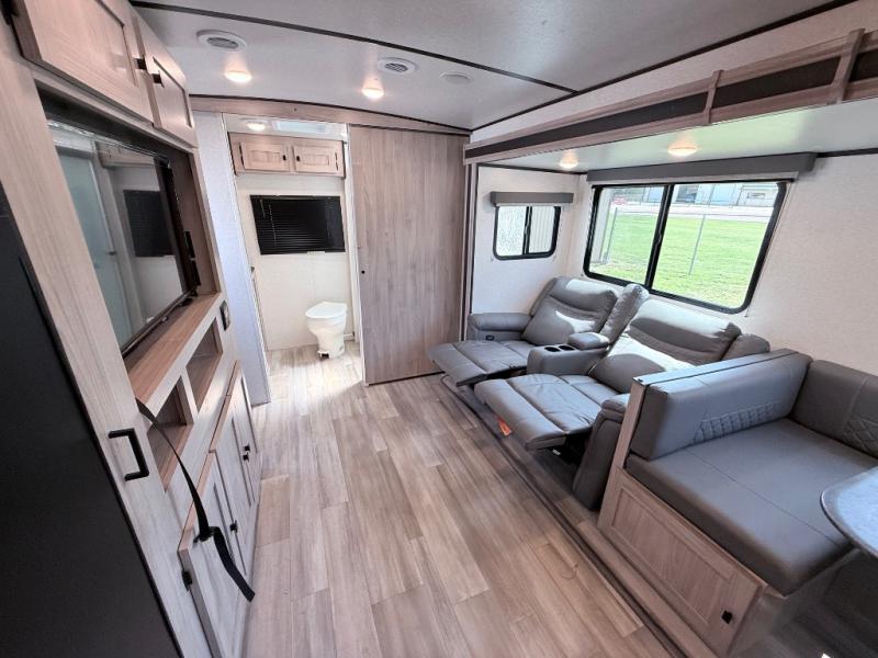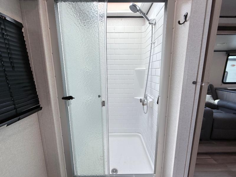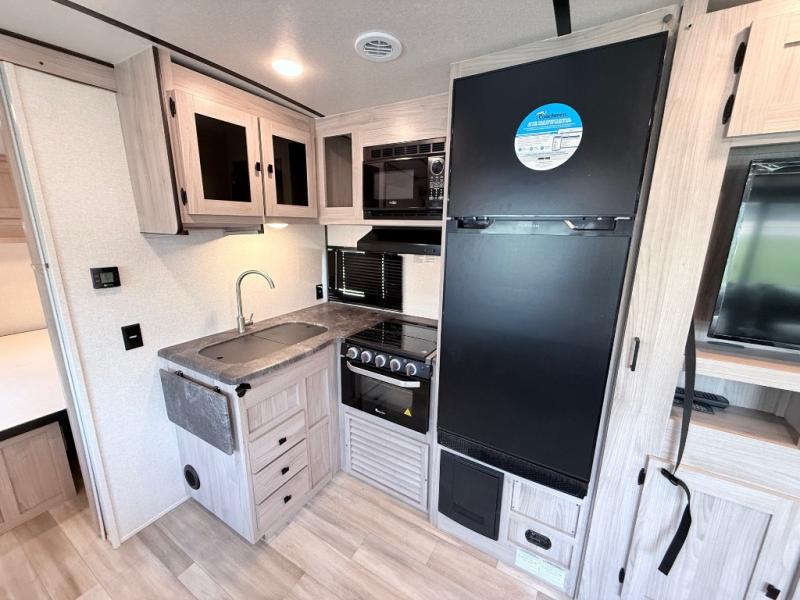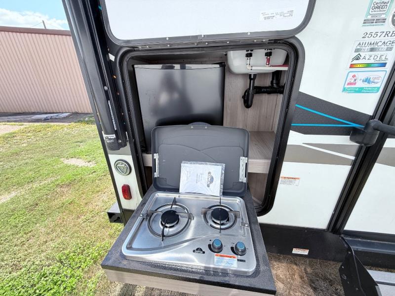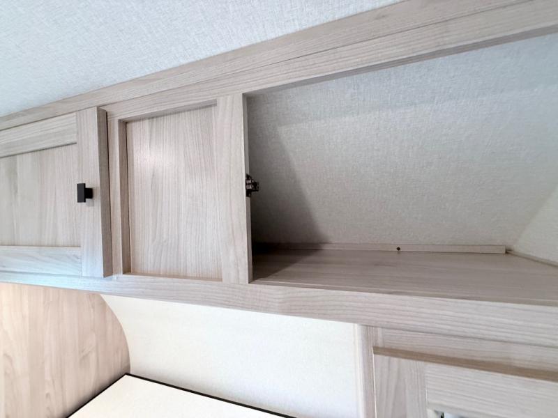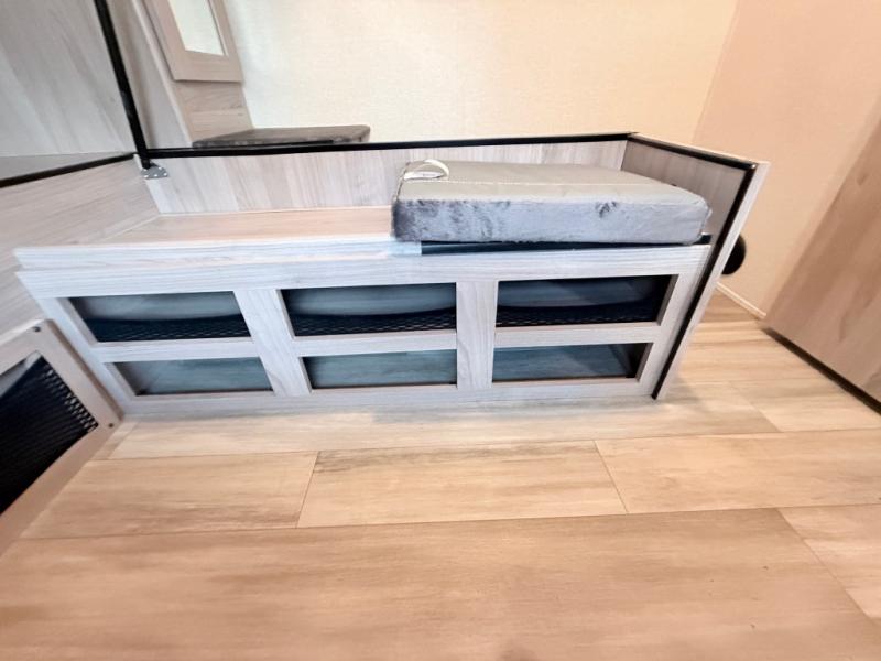 Looking for plenty of storage in your next RV? This trailer has a hidden swing-out pantry behind the entertainment center, a closet, overhead cabinets and a pet center for your dog's food and water. You will also find storage in the front bedroom that includes a space savings sliding door for privacy, MAX bed storage underneath with drawers and places for your shoes, plus you will have wardrobes for hanging clothes and nightstands for your cellphone and keys. The rear full bathroom is spacious and includes overhead cabinets, a counter for toiletries and a shower. The cook will love the L-shaped kitchen corner with everything nearby to whip up meals, plus there is a flip-up counter extension. And don't forget about the outside kitchen, the power awning, and the pass-through compartment.