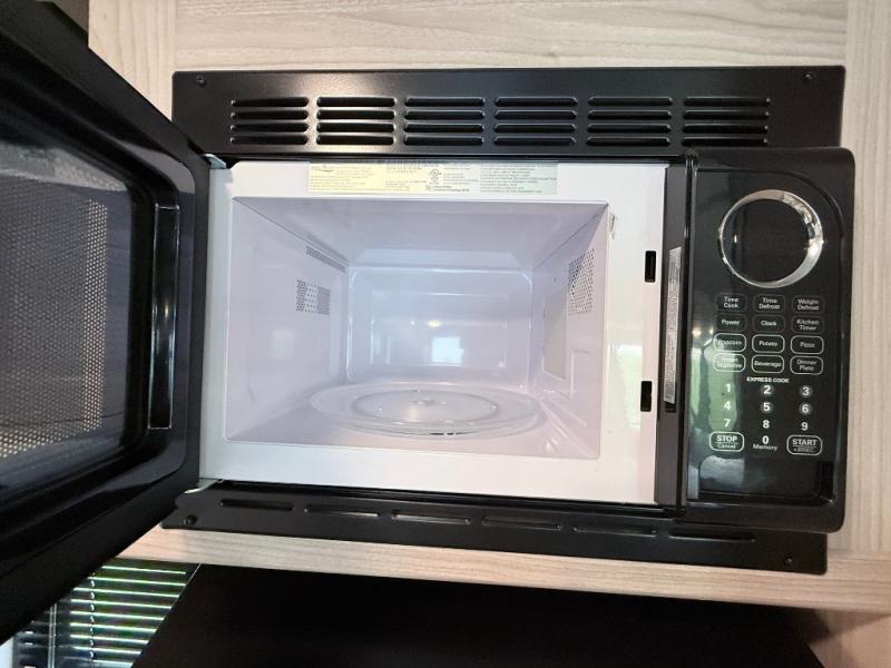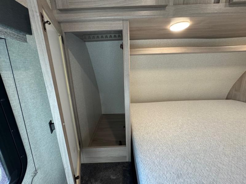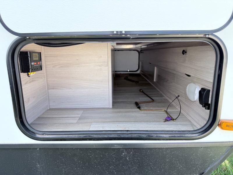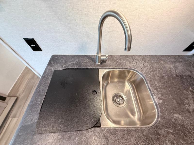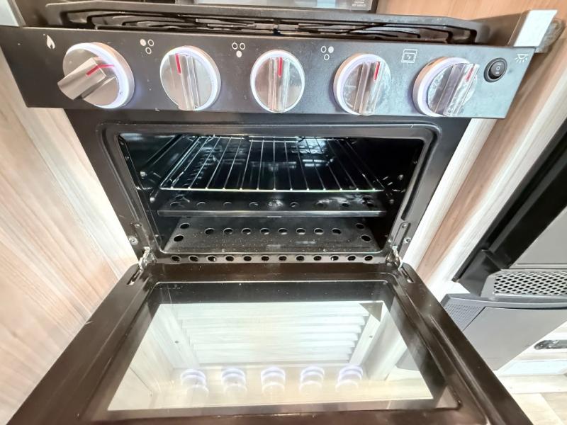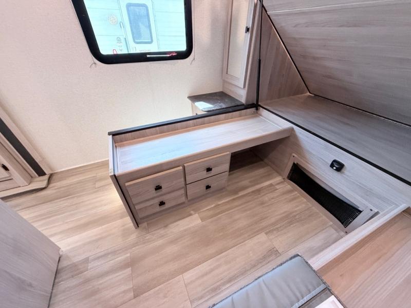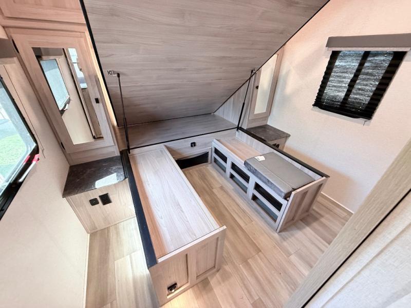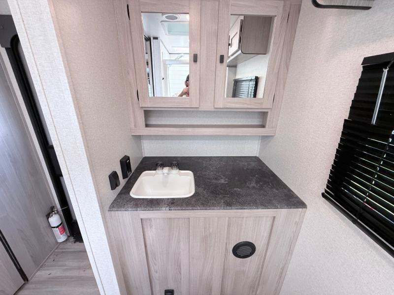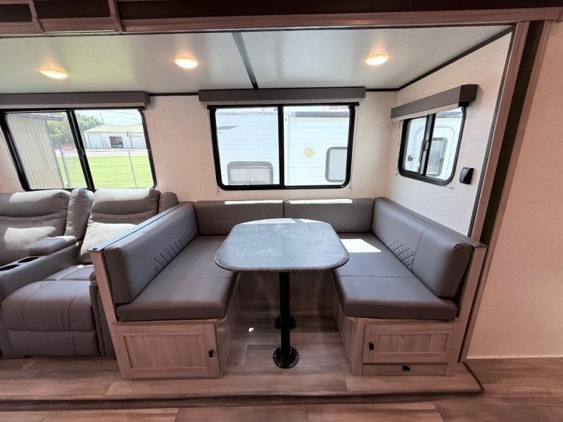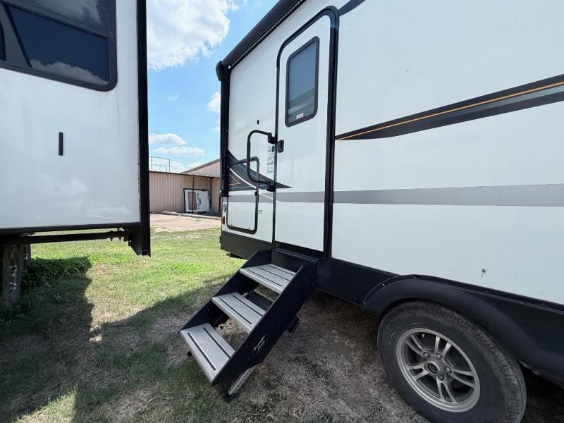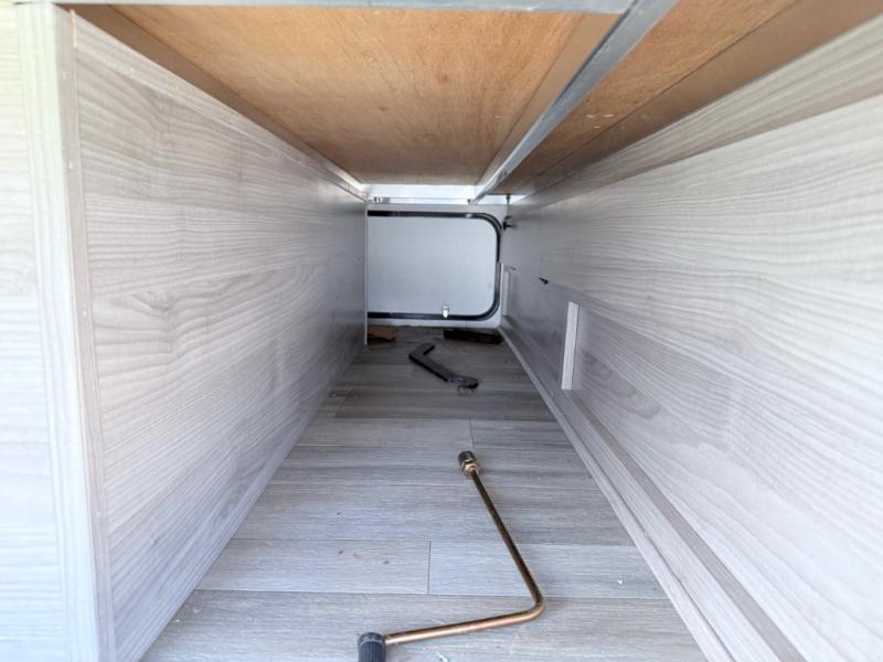 Looking for plenty of storage in your next RV? This trailer has a hidden swing-out pantry behind the entertainment center, a closet, overhead cabinets and a pet center for your dog's food and water. You will also find storage in the front bedroom that includes a space savings sliding door for privacy, MAX bed storage underneath with drawers and places for your shoes, plus you will have wardrobes for hanging clothes and nightstands for your cellphone and keys. The rear full bathroom is spacious and includes overhead cabinets, a counter for toiletries and a shower. The cook will love the L-shaped kitchen corner with everything nearby to whip up meals, plus there is a flip-up counter extension. And don't forget about the outside kitchen, the power awning, and the pass-through compartment.