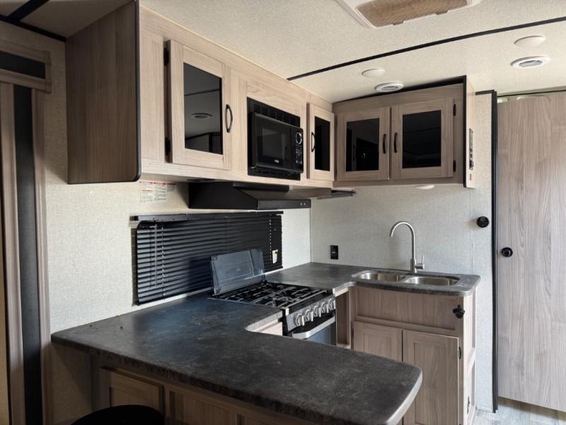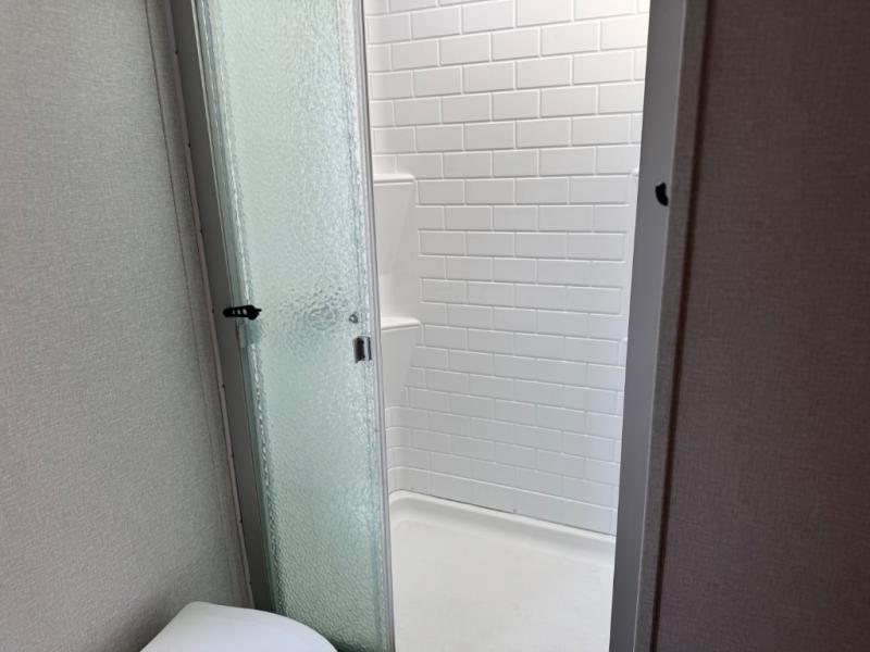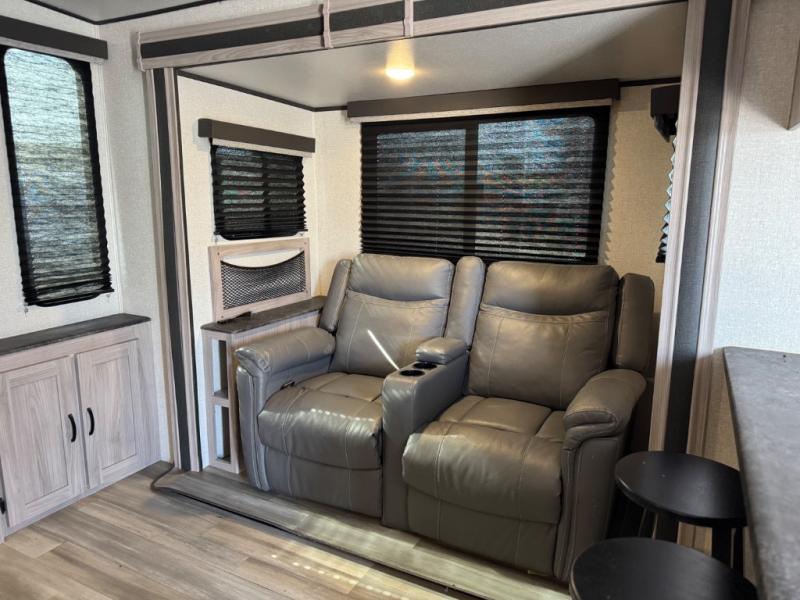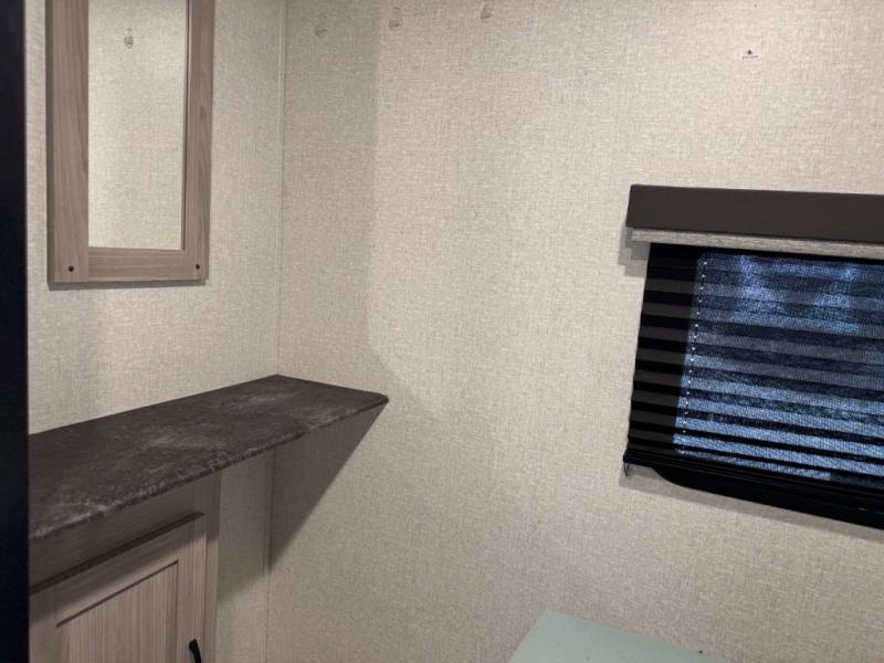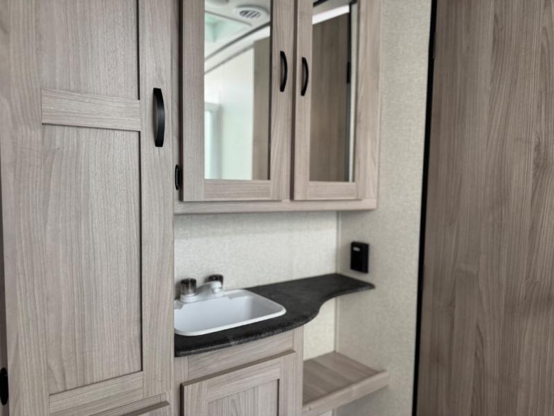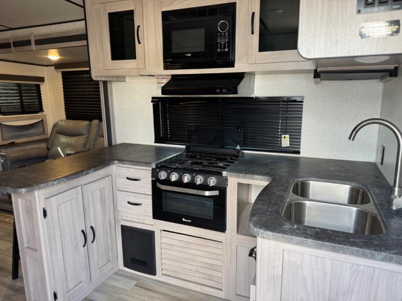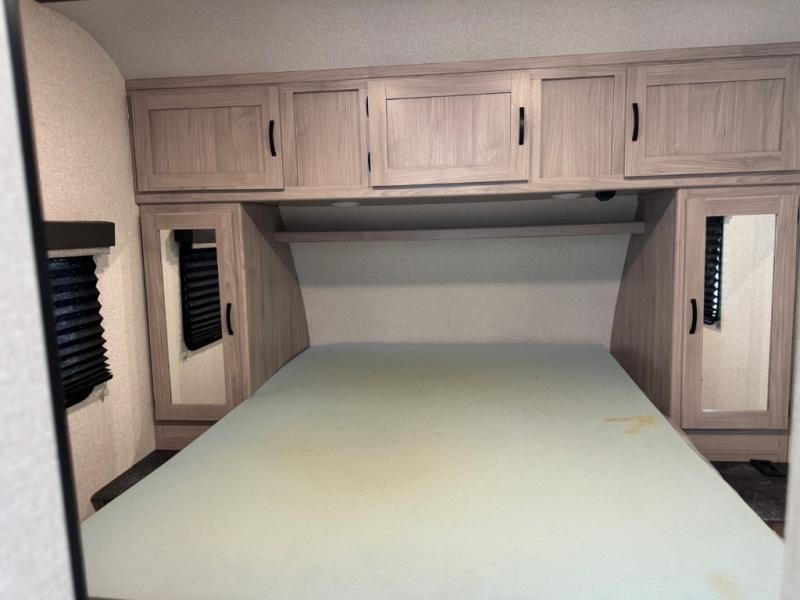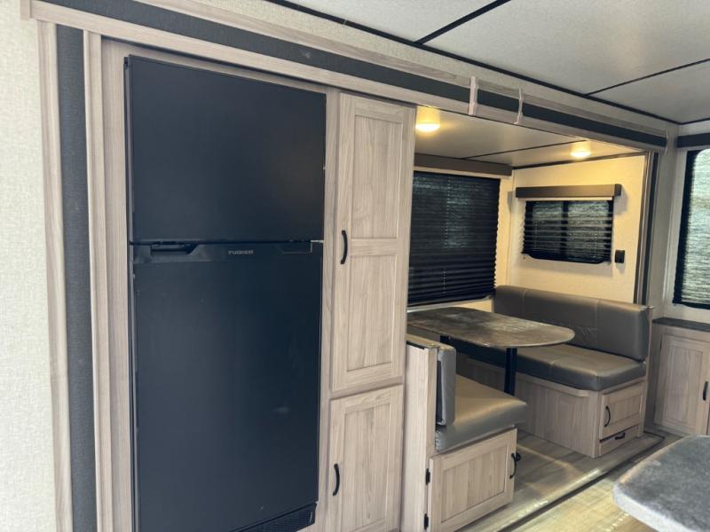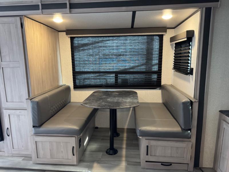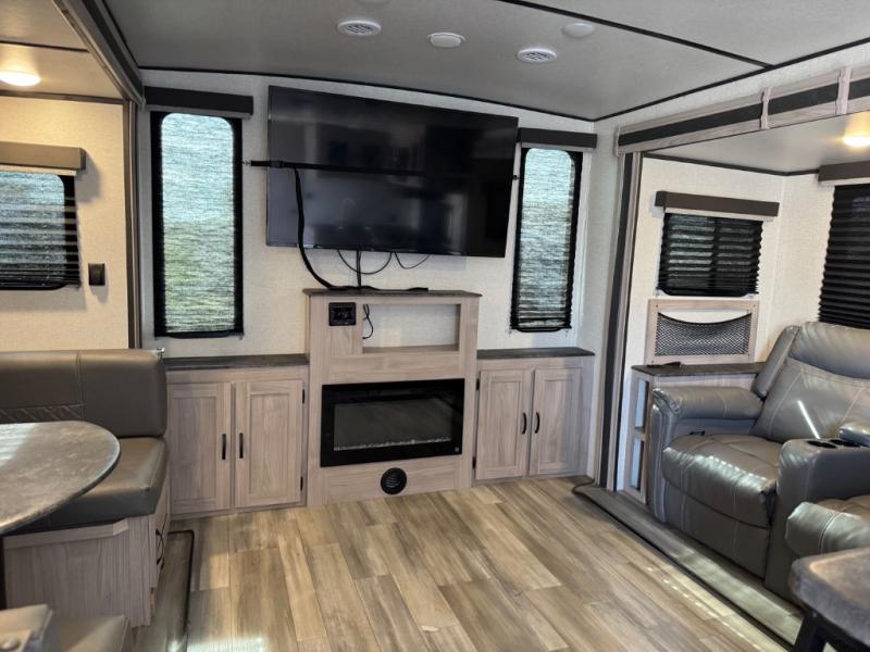 Get out and explore the campgrounds, the local cafes or the fishery. This trailer will give you plenty of comfort when you are done for the day. You can relax on the tri-fold sofa slide while watching the LED TV with a fireplace below, sit at the booth dinette with a pet center, or whip up a meal in the kitchen with the U-shaped counter, the full amenities, plus a pantry and 10 cu. ft. refrigerator. The walk-through bathroom has access from the main area near the entry or the front private bedroom with three wardrobes, a queen bed with MAX bed storage, and windows for views and air circulation.