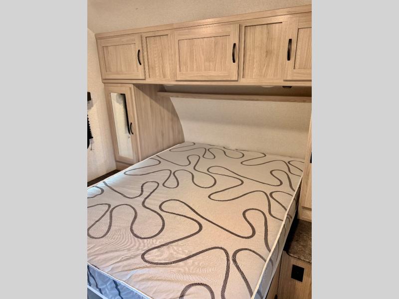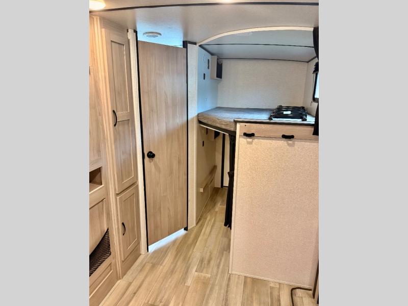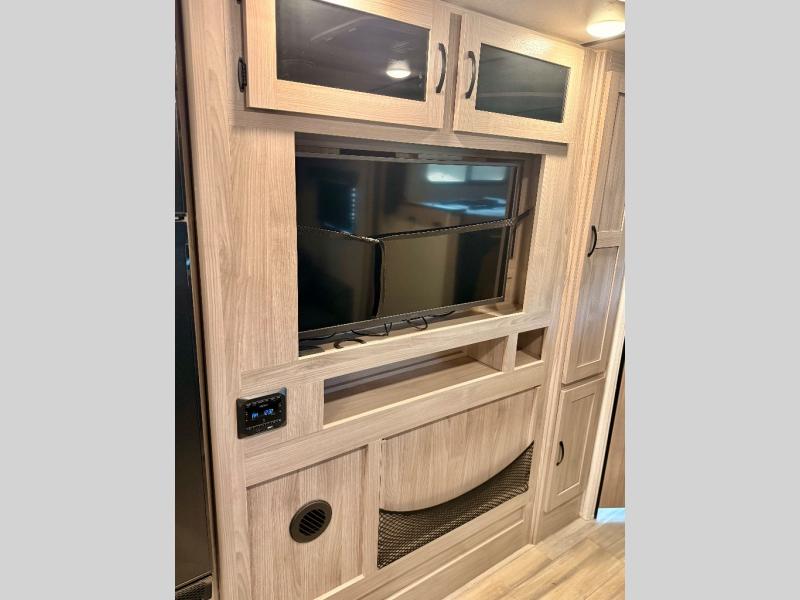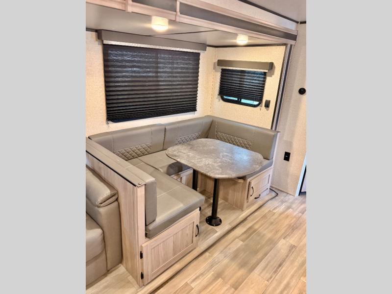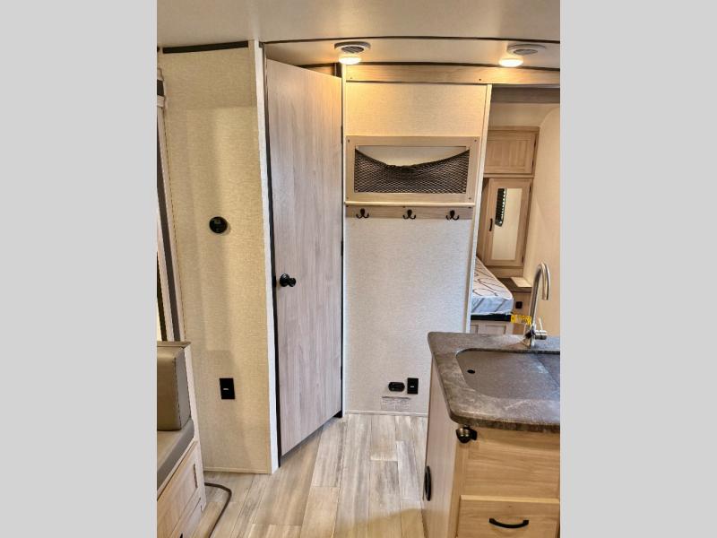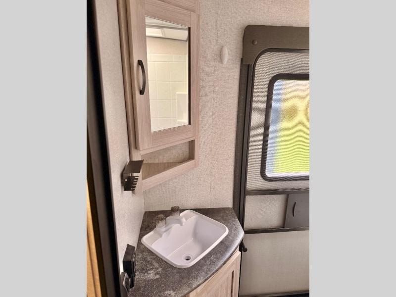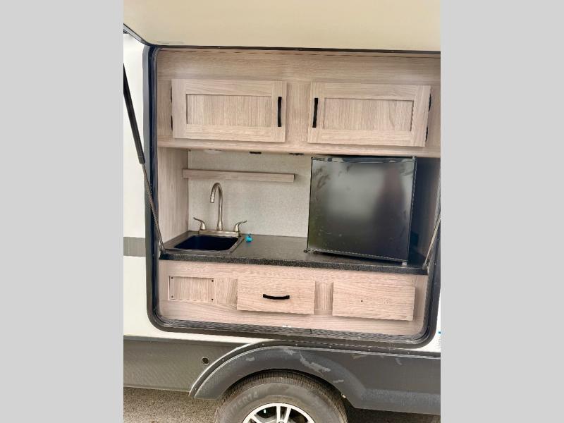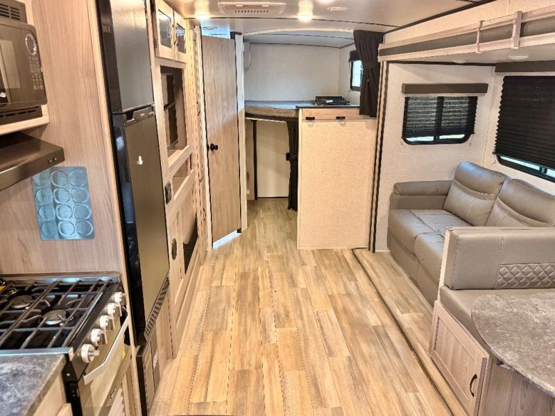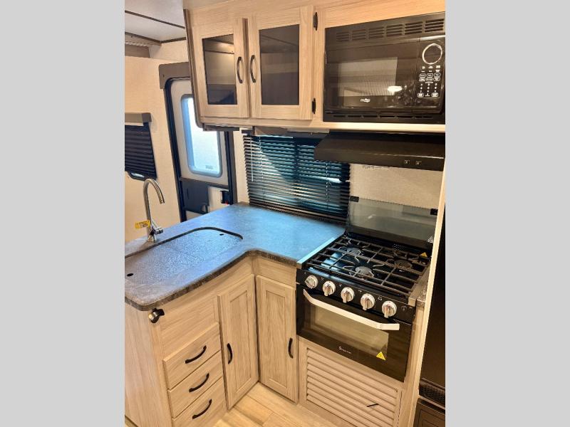 This is a popular bunk trailer for a larger family thanks to having the convenience of dual entry doors allowing access to the main living and kitchen area and near the front bedroom, and into the full bathroom for a quick in and out when playing outside. The bathroom also includes a hamper for convenience. The Stor-More cargo door allows you to place items from the exterior to the interior under the lower flip bunk for safe travels to your destinations and back home. The kids will surely love the convenience centers when playing or sleeping in a bunk. There is a sofa and U-shaped slide including a pet center for relaxing and feeding your pet. The kitchen includes full amenities plus a pantry to store lots of goodies for everyone. Along the exterior, the outside camp kitchen will come in handy when you have everyone at the campsite for dinner and the power awning offers some protection from the elements.