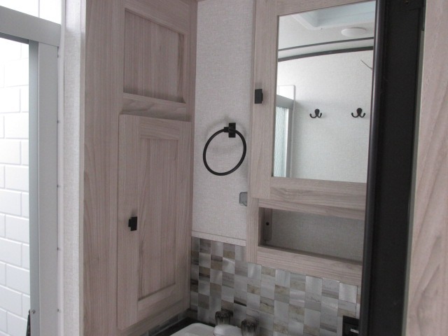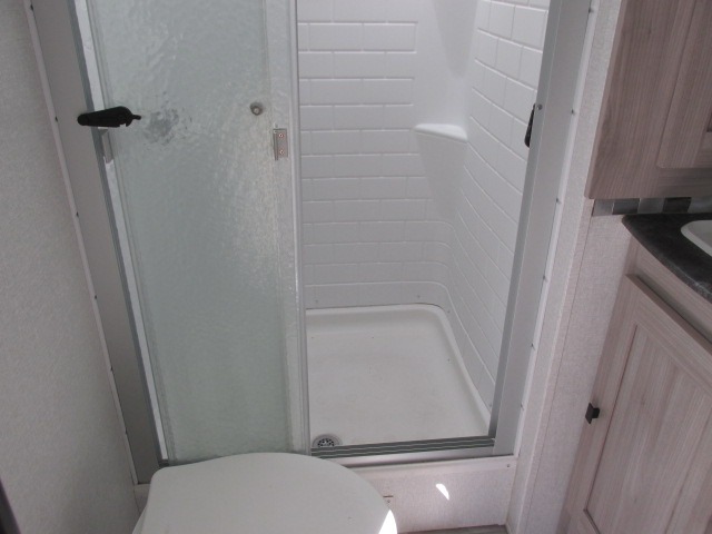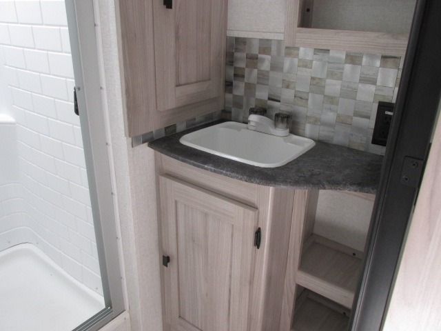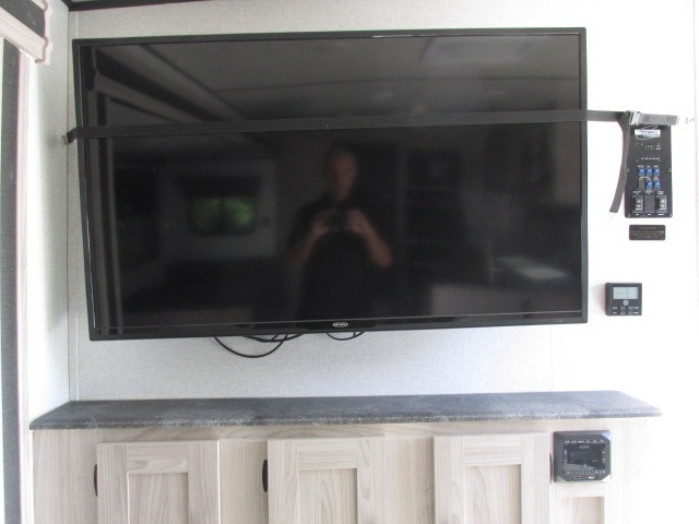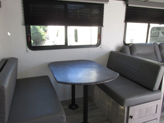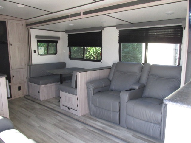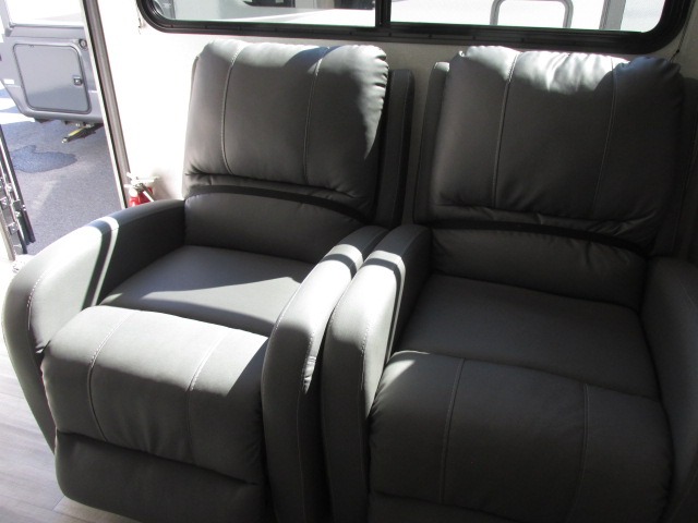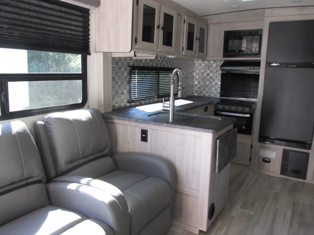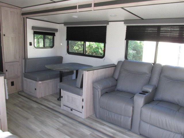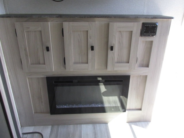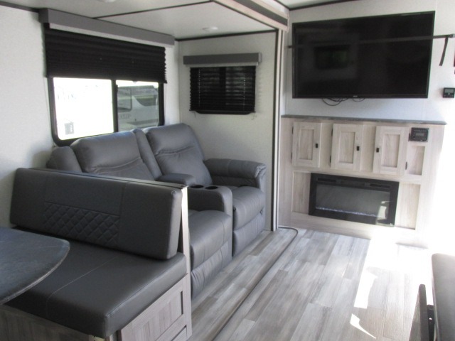 You'll love the space you have in this travel trailer thanks to the large slide out, spacious full bath, and front private bedroom. The booth dinette and tri-fold sofa within the slide out will provide a place to relax and sleep additional guests, and the two recliners are close to the fireplace to make this area feel more like home. The chef will love the rear kitchen with ample counter space and a pantry, plus there is an exterior camp kitchen to make breakfast at. You'll also find a 20' power awning outdoors, a pass-through storage, plus a dog wash that will come in handy after hiking.