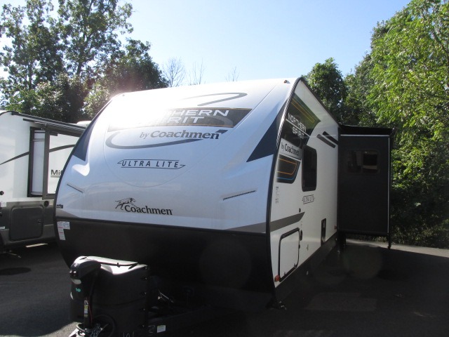 With any Northern Spirit Ultra Lite travel trailer by Coachmen, the "Twice Cool" dual ducted air conditioning system, the motion activated floor lights in the bedroom and bathroom, the lighted USB ports, the digital level, and the motion activated pass-through storage light plus fishing pole storage, will make your camping experience simplified. The heated and enclosed underbelly provides protection on the road and allows you to camp during any season, the 100W solar panel with 10 amp controller provides off-grid camping, and the power tongue jack makes setup easier. Each is built with a painted fiberglass front cap with LED strip lights, a laminated, aluminum framed floor, rear wall, and sidewalls, plus 5" trusses with interior vault. Make your decision today, and camp with everything in its place!