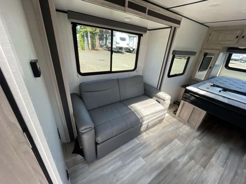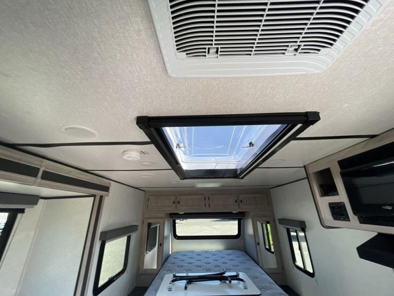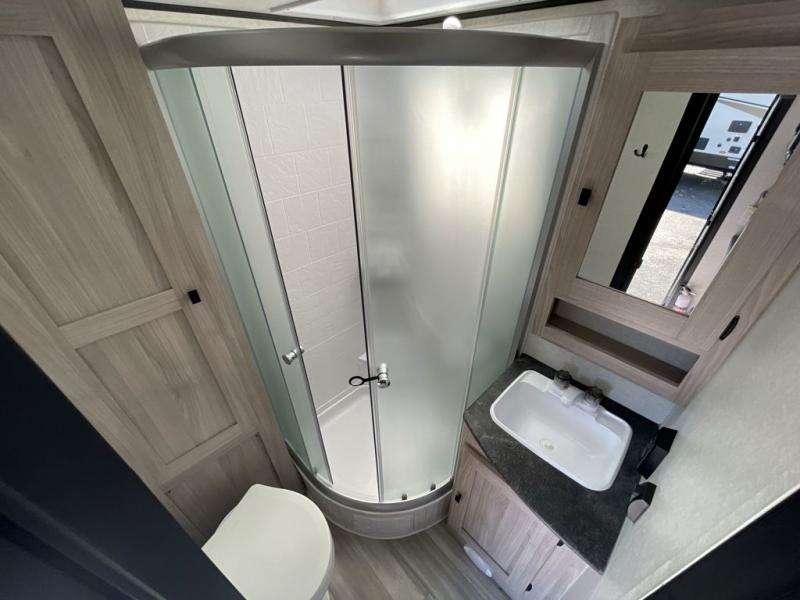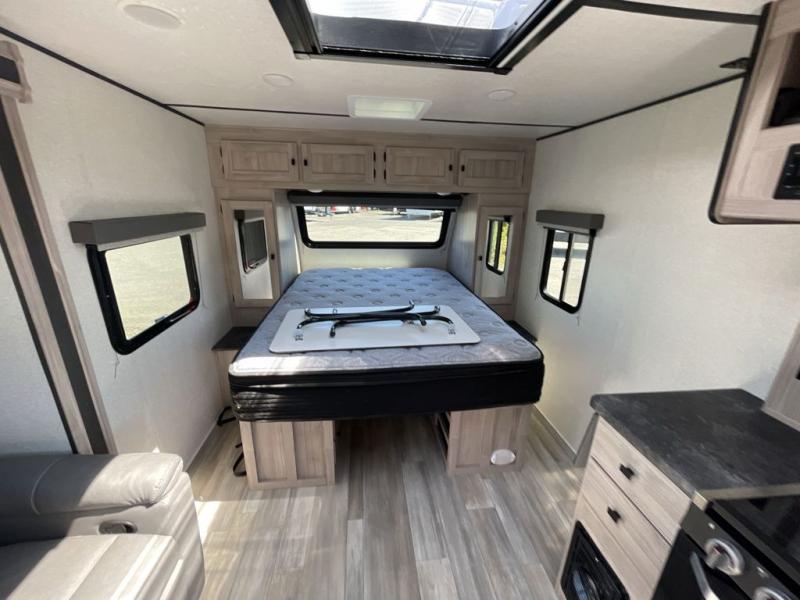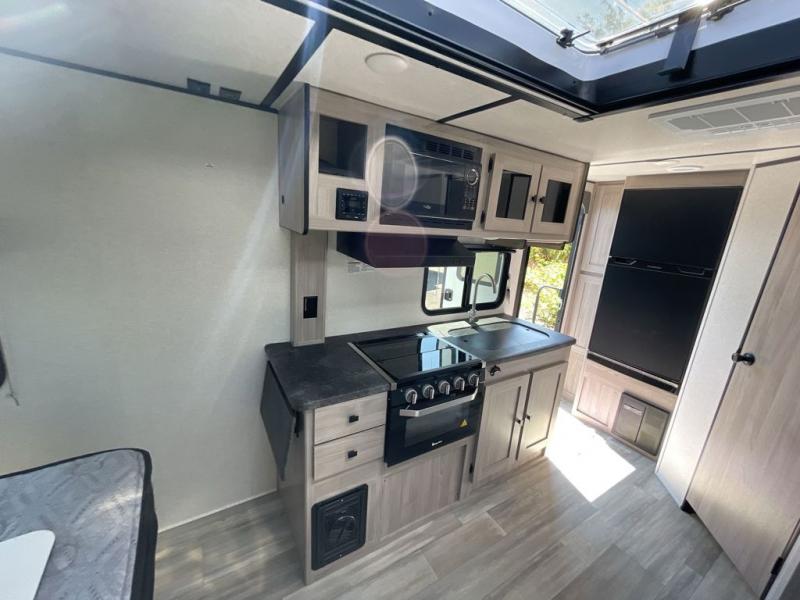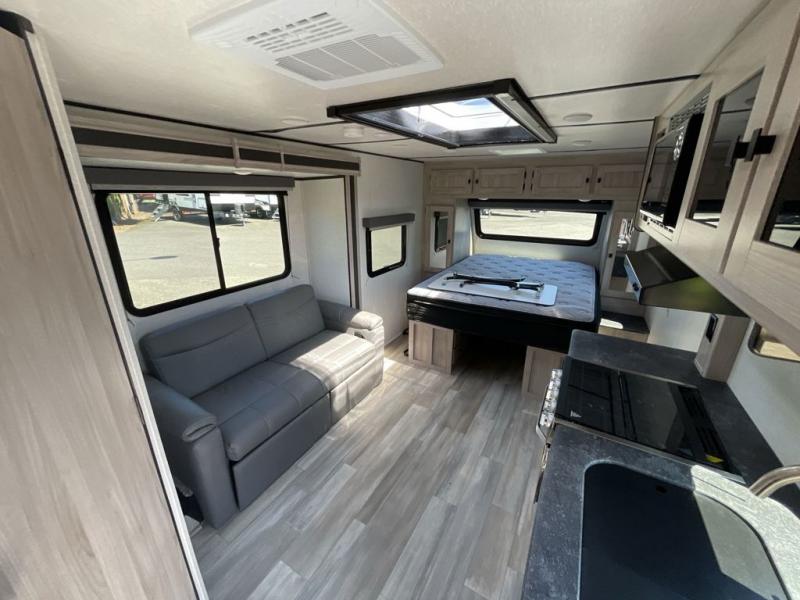 Easily hook up this lightweight travel trailer and head to your local state park for fun! The front bedroom includes a queen bed with Max Bed Storage, and dual bedroom wardrobes for all of your things. The free-standing table and sofa will provide a place to dine after lunch is prepared on the three burner cooktop. After a day outdoors you can clean up in the full bath that includes a radius shower, a linen closet, plus a shower skylight to let natural light in. This model also includes a two door refrigerator for your perishables, a hutch for more storage, plus an exterior pass-through storage for fishing poles!