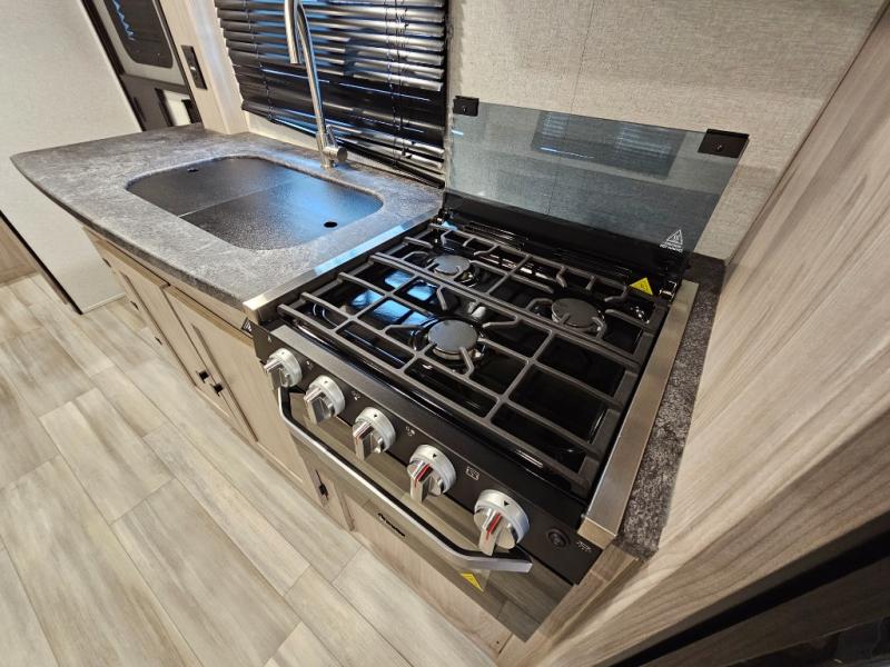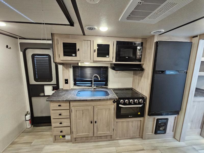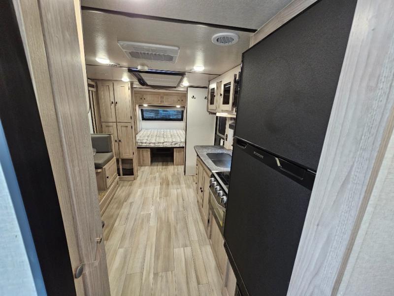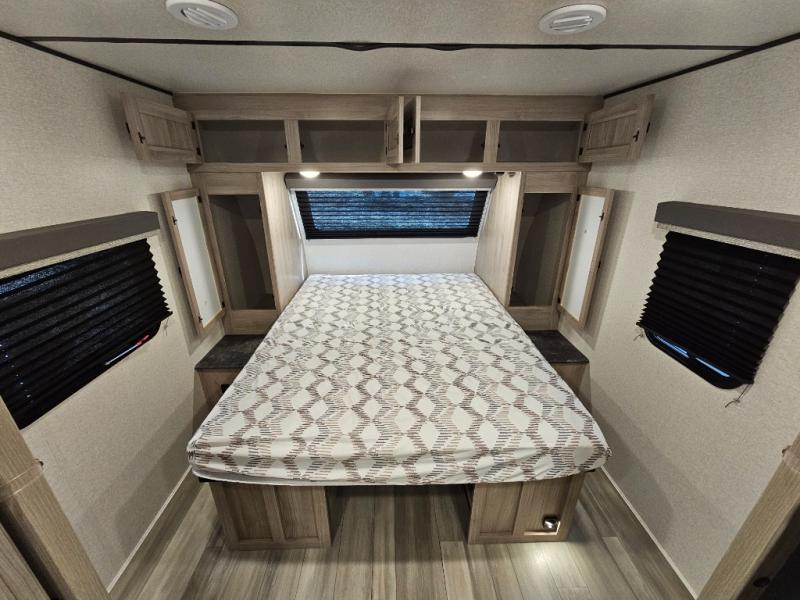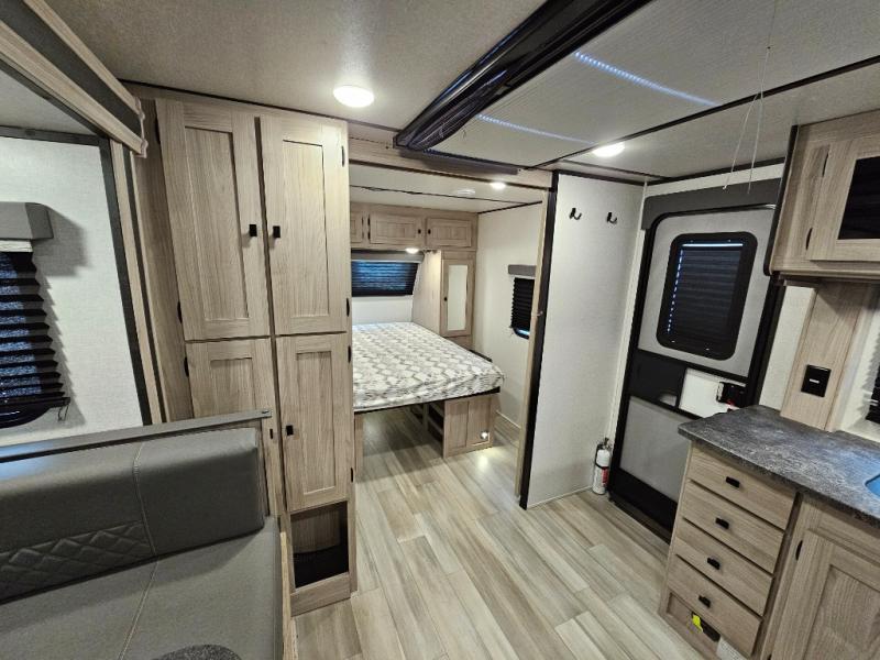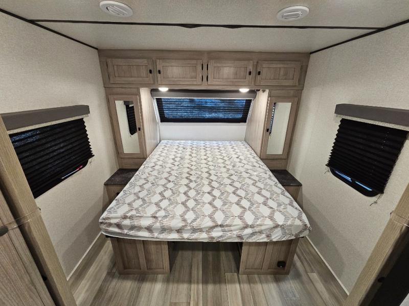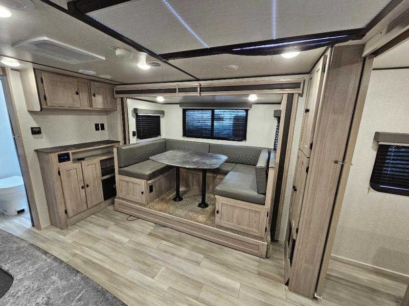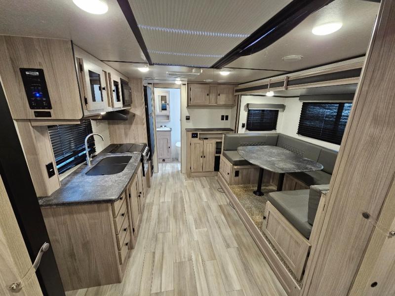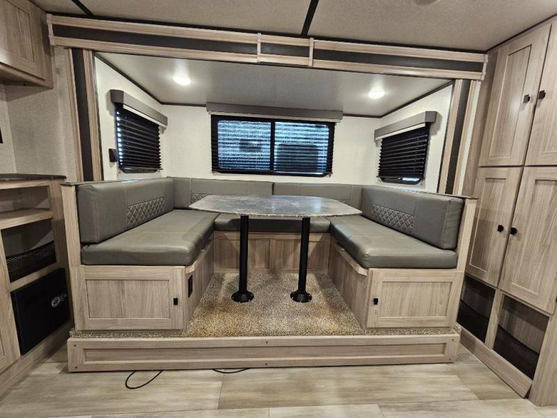 It's time to upgrade from that old tent to this spacious travel trailer for four. You will enjoy the front private bedroom with a queen bed and dual wardrobes, while your guests sleep on the U-shaped dinette within the slide out. In the morning you can all gather around the dinette for coffee, then head outside to sit under the 15' power awning. Breakfast can be made on the outside camp kitchen with a two burner cooktop, and extra chairs can be found in the pass-through storage. Spend your days hiking, biking, or swimming at the lake, and when you return, the full rear bath will be waiting for you to clean up before bed.