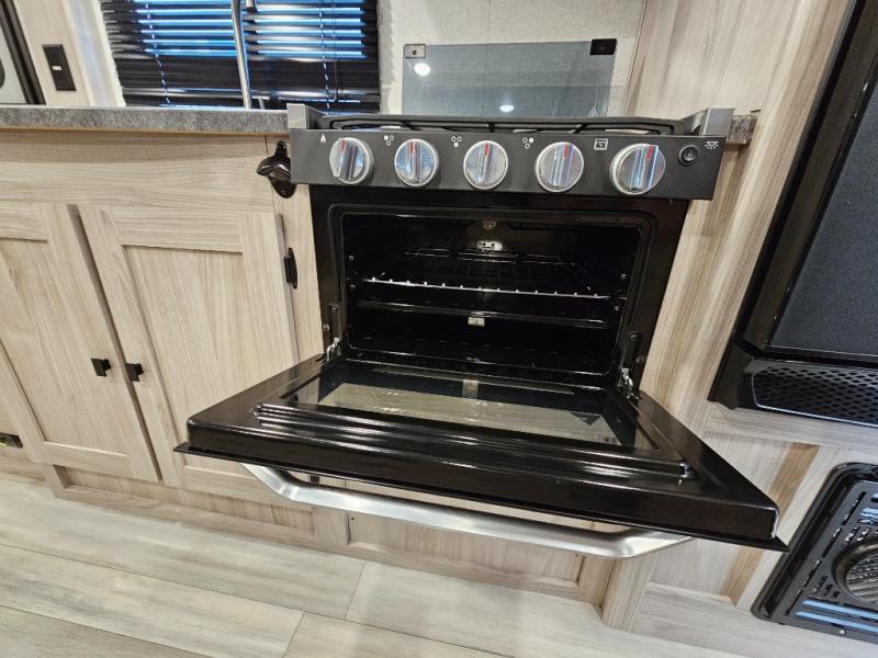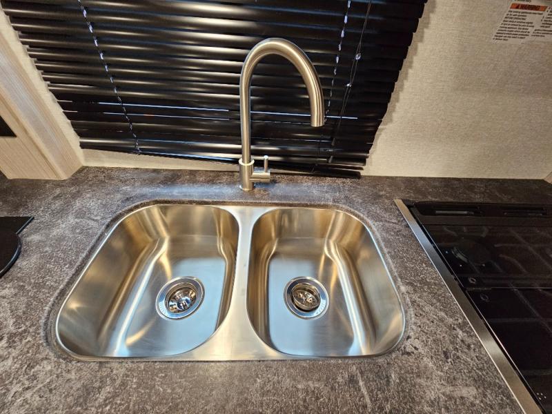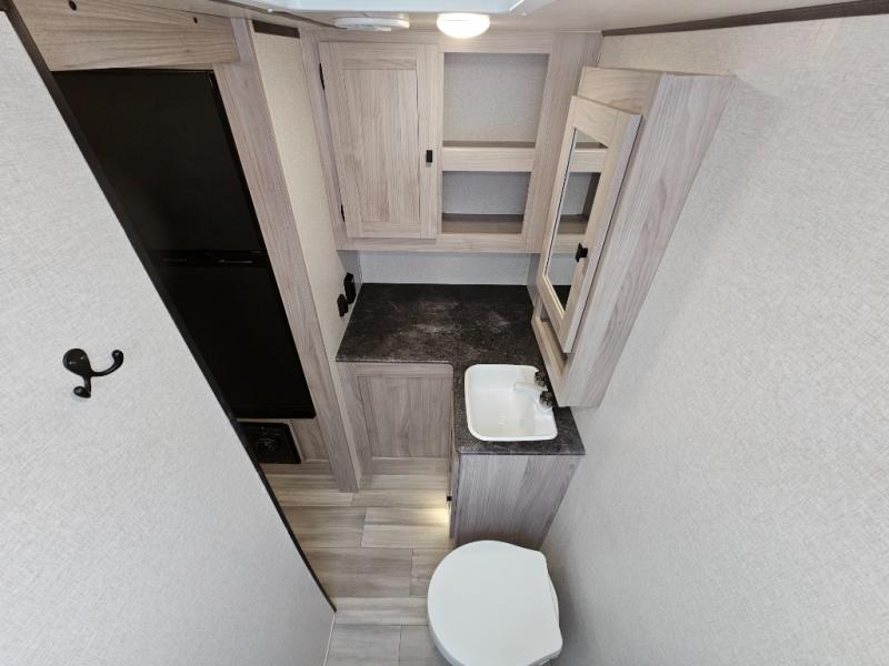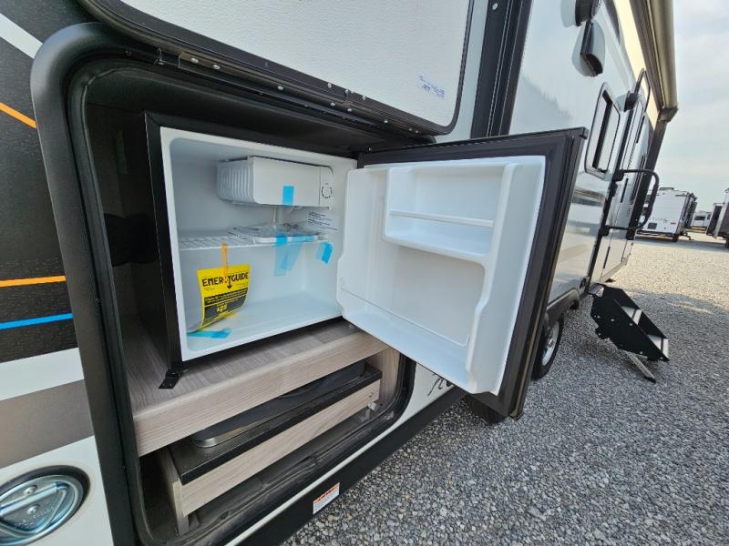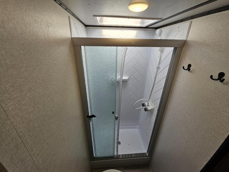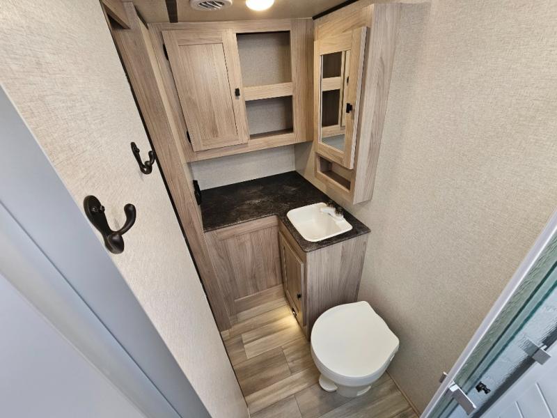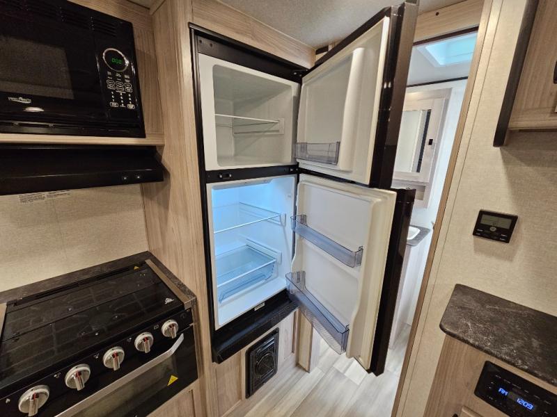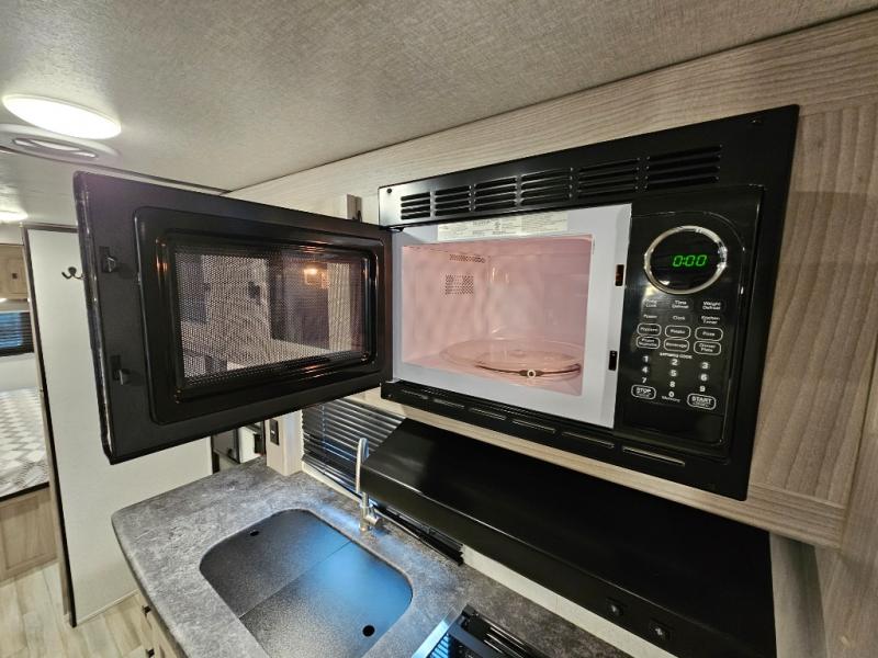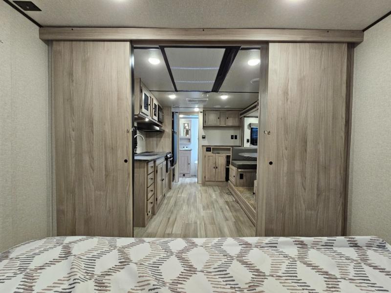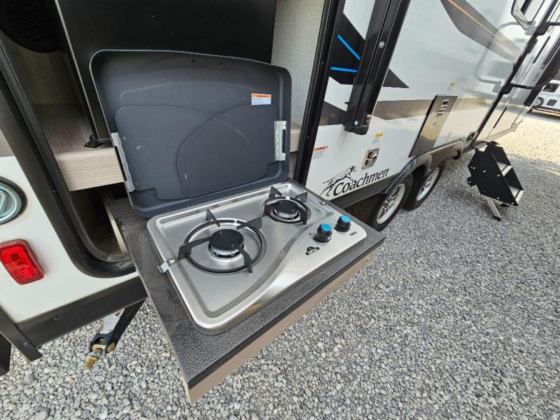 It's time to upgrade from that old tent to this spacious travel trailer for four. You will enjoy the front private bedroom with a queen bed and dual wardrobes, while your guests sleep on the U-shaped dinette within the slide out. In the morning you can all gather around the dinette for coffee, then head outside to sit under the 15' power awning. Breakfast can be made on the outside camp kitchen with a two burner cooktop, and extra chairs can be found in the pass-through storage. Spend your days hiking, biking, or swimming at the lake, and when you return, the full rear bath will be waiting for you to clean up before bed.