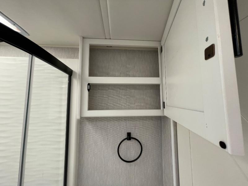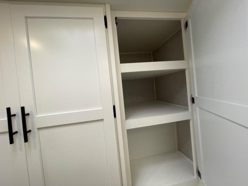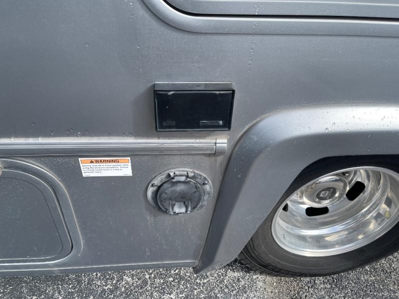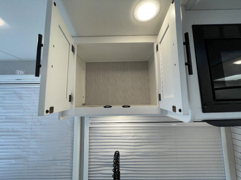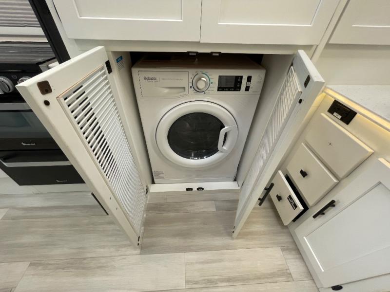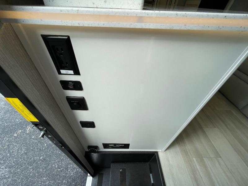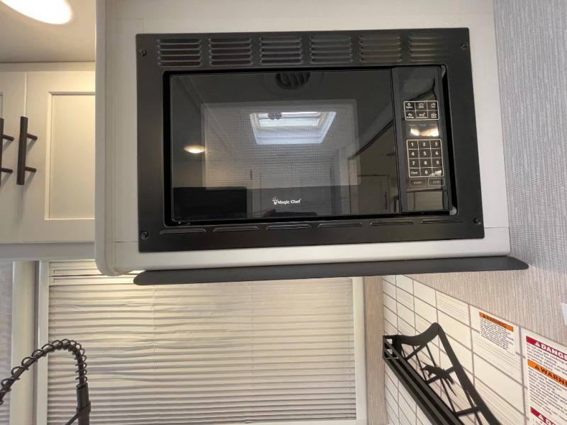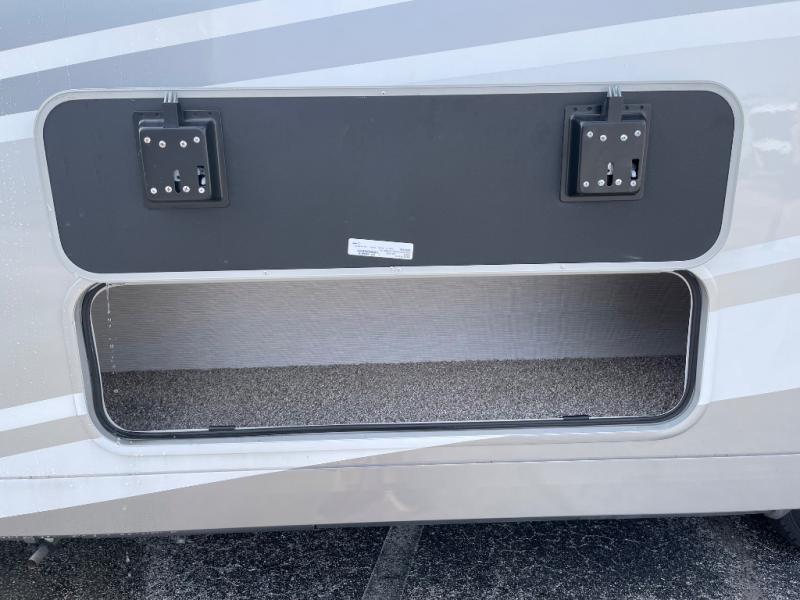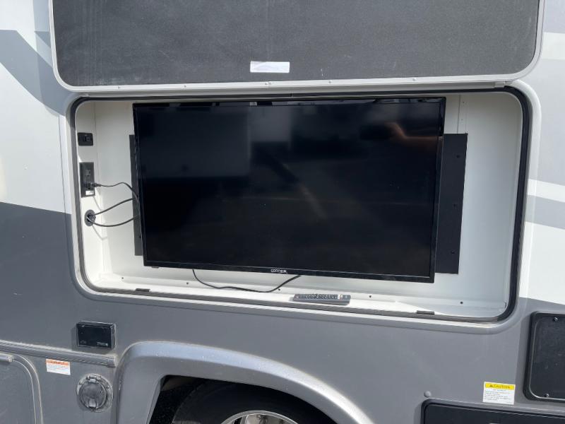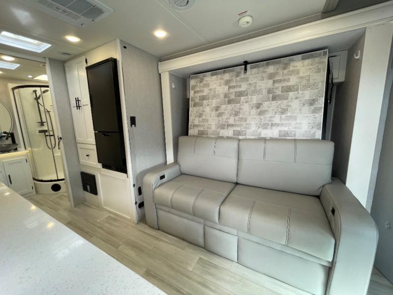 You will enjoy the versatility that this Murphy bed model provides. Depending on whether it is daytime or evening will determine if you have a 60" x 74" bed that slides out or a 62" sofa to enjoy. There is a 45" x 76" cab over bunk that can be used for added sleeping for two more guests, or used as added storage space. The rear full bath is spacious and private and includes a 32" x 32" angled shower, toilet, vanity with sink, plus linen cabinet, and wardrobe. The kitchen features everything needed to create meals while on the go, and a cozy fireplace is included beneath the coach TV for your enjoyment. Outside, you will find a second TV beneath the armless awning so you can enjoy watching your favorite movies and games whenever you like.