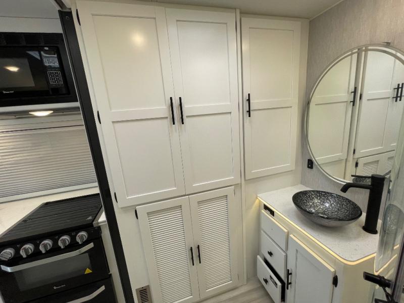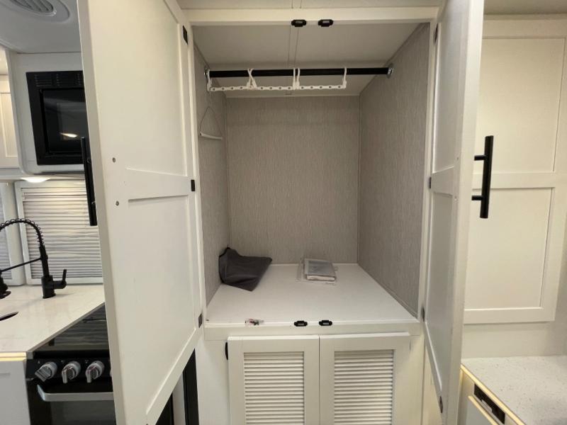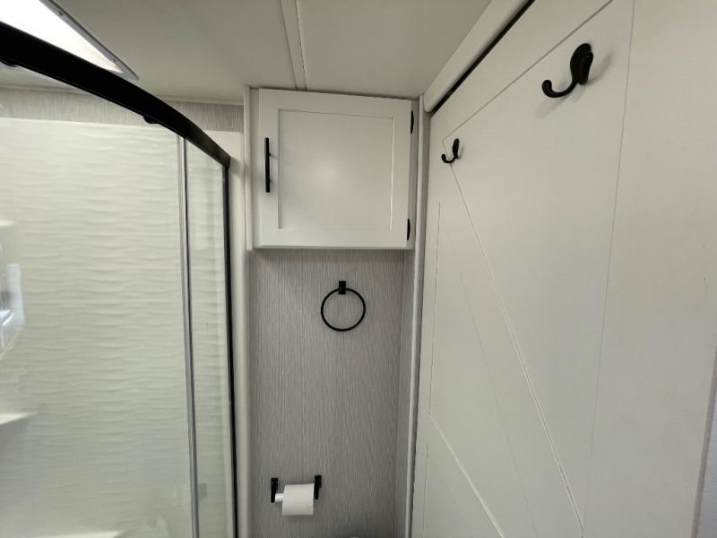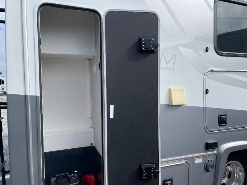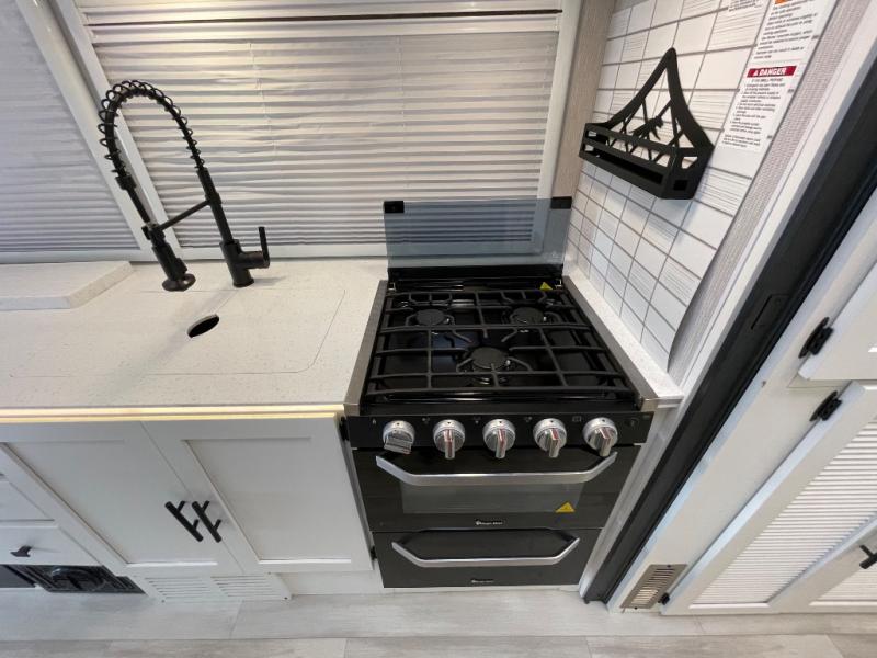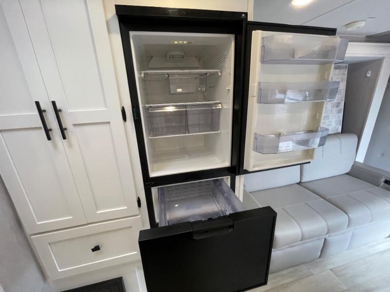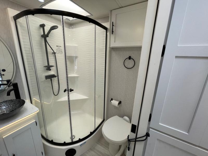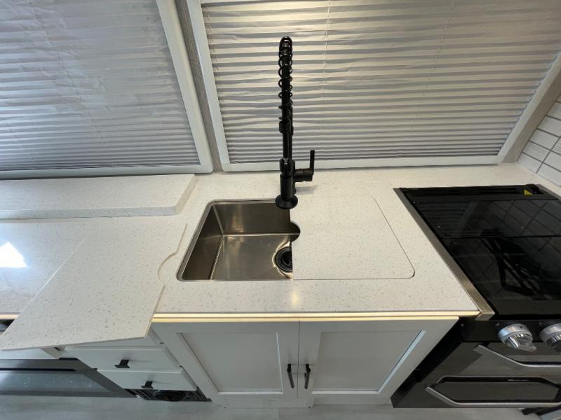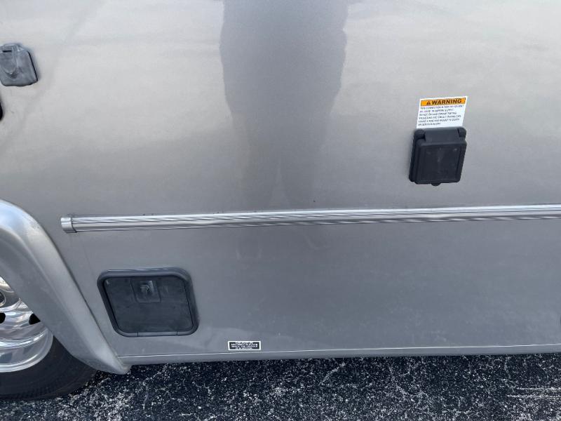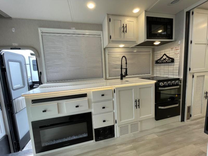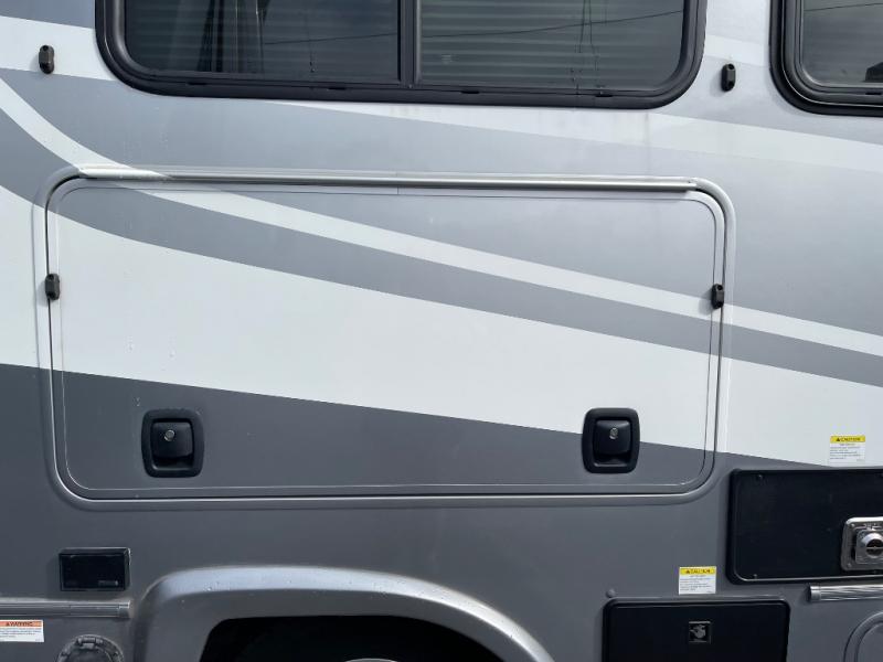 You will enjoy the versatility that this Murphy bed model provides. Depending on whether it is daytime or evening will determine if you have a 60" x 74" bed that slides out or a 62" sofa to enjoy. There is a 45" x 76" cab over bunk that can be used for added sleeping for two more guests, or used as added storage space. The rear full bath is spacious and private and includes a 32" x 32" angled shower, toilet, vanity with sink, plus linen cabinet, and wardrobe. The kitchen features everything needed to create meals while on the go, and a cozy fireplace is included beneath the coach TV for your enjoyment. Outside, you will find a second TV beneath the armless awning so you can enjoy watching your favorite movies and games whenever you like.