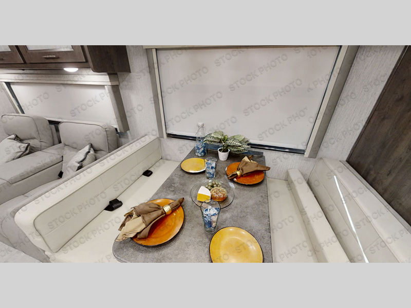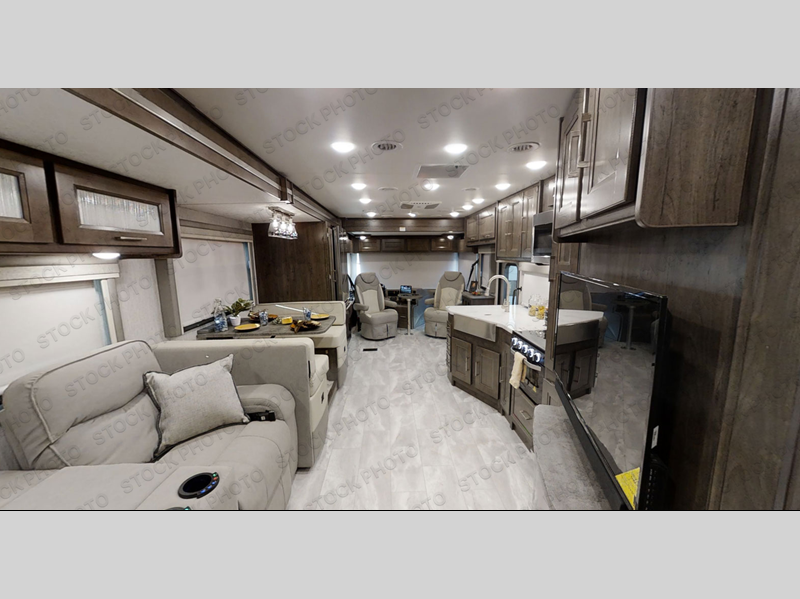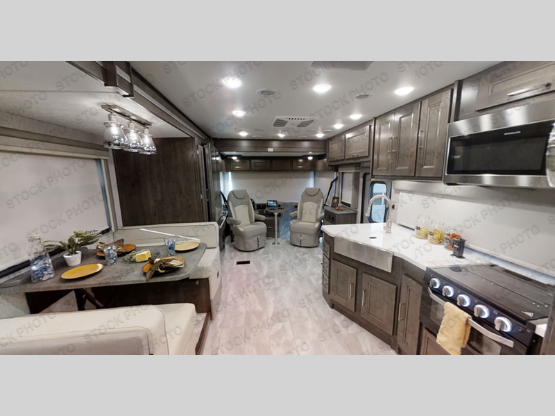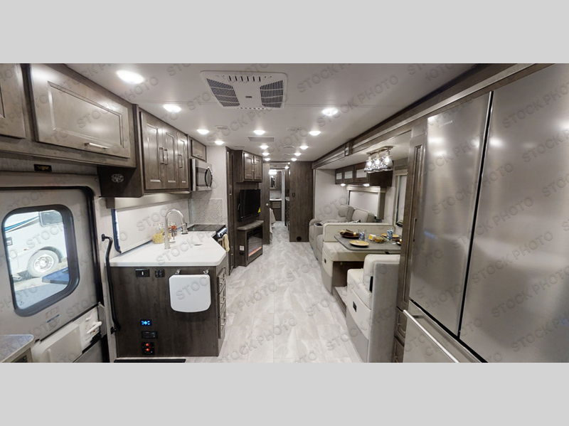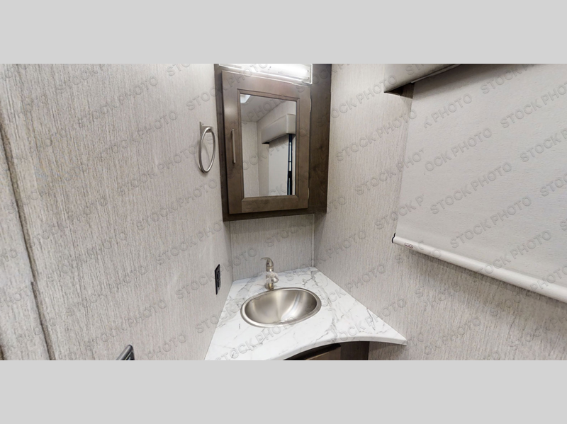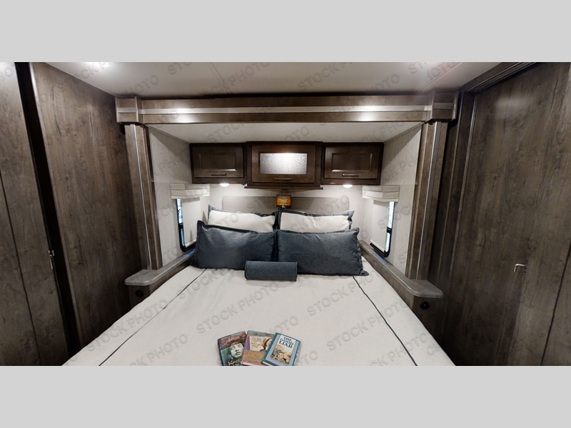 Wow! Check out this motorhome with a full rear bath, a convenient half bath, and sleeping space for six! There is a cockpit table with cupholders for your drinks, a booth dinette where you can dine together, and a 78" sofa bed across from the fireplace and 40" LCD TV. And the littles ones will love the drop-down overhead bunk. The chef of your group can prepare meals on the three burner range or in the stainless steel over the rang microwave. The master bedroom is comfortable with its king bed slide out and residential style headboard, plus there are USB ports on both sides of the bed and a CPAP station above the bed for convenience.