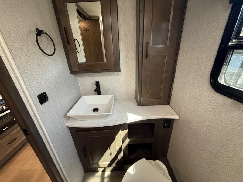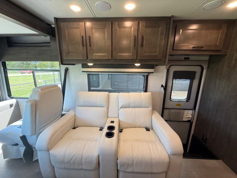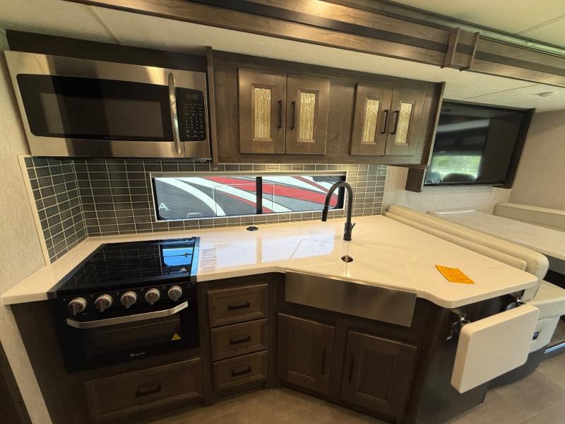 The Sportscoach SRS Class A diesel motorhome by Coachmen sits on a straight rail Freightliner chassis with a 340 HP ISB Cummings rear diesel engine that will deliver power to your excursions. Each coach features chassis air suspension and air brakes, an 8,000 lb. towing hitch, and an outside entertainment center with a 40" TV to watch the big game outdoors. Some of the electrical, heating, and AC amenities you will appreciate are the 6.0 kW diesel generator, the 100 watt solar panel with a controller, and the two 15,000 BTU A/C units. The galley features convenient pop-up recept with USB ports, stylish kitchen backsplash, and a stainless steel farmhouse style sink that will make clean-up easier than ever. Comfort will come easy with the upgraded mattress in the bedroom, along with a residential style headboard and a king bed. Affordable, powerful, and comfortable; what's not to love about the Sportscoach SRS Class A diesel coach!