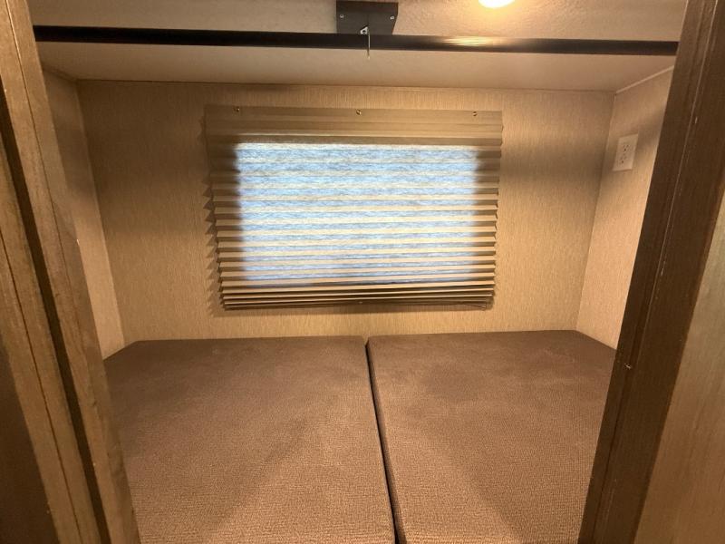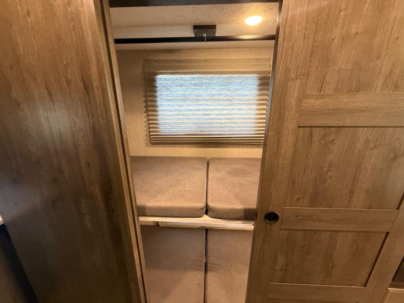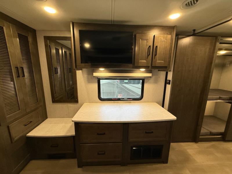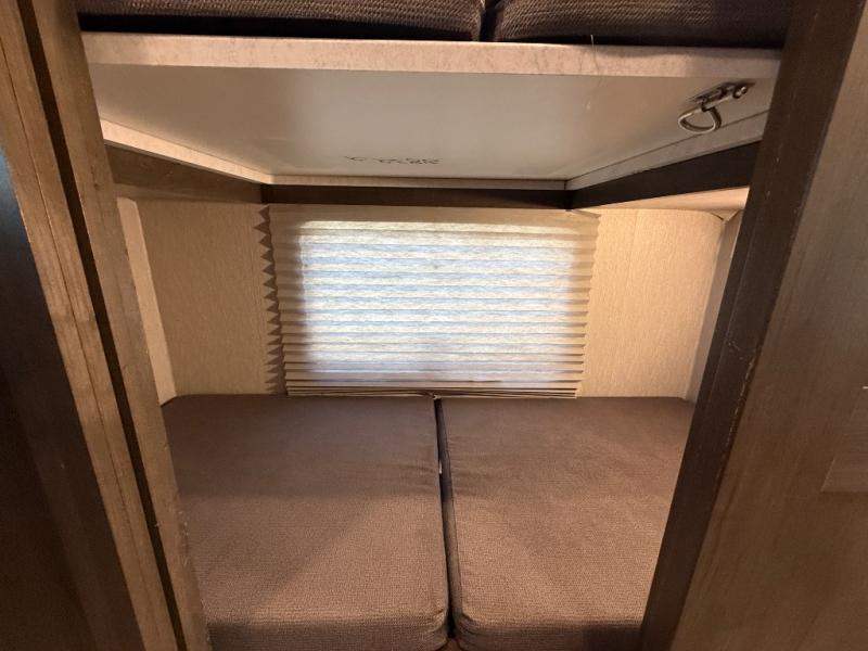 This double slide out coach is perfect for your crew of eight. The little ones will enjoy the drop-down overhead bunk and the bunk beds. The bunks can also be converted to an office space or a wardrobe to keep your clothes wrinkle-free. When you aren't watching the TV outdoors under the power awning, you can enjoy a movie indoors on the 50" LCD TV across from the sofa bed. There is also a booth dinette that includes storage drawers, and you'll find plenty of overhead compartments for your valuables. You will enjoy some privacy in the rear private bedroom that includes a king bed slide out, a 32" LCD TV, and a closet with a hamper. Just like with all the Sportscoach SRS models, you will appreciate washer and dryer prep in this model as well!