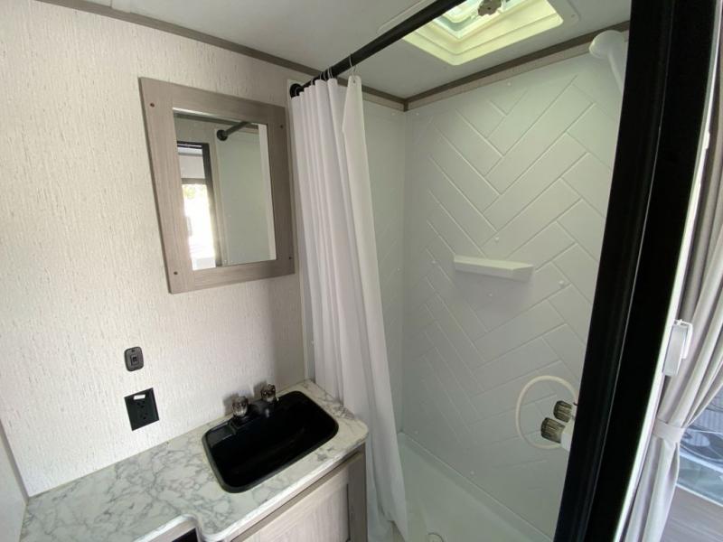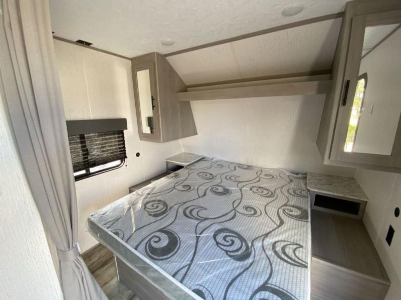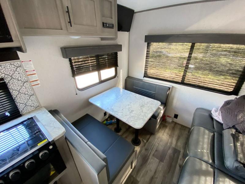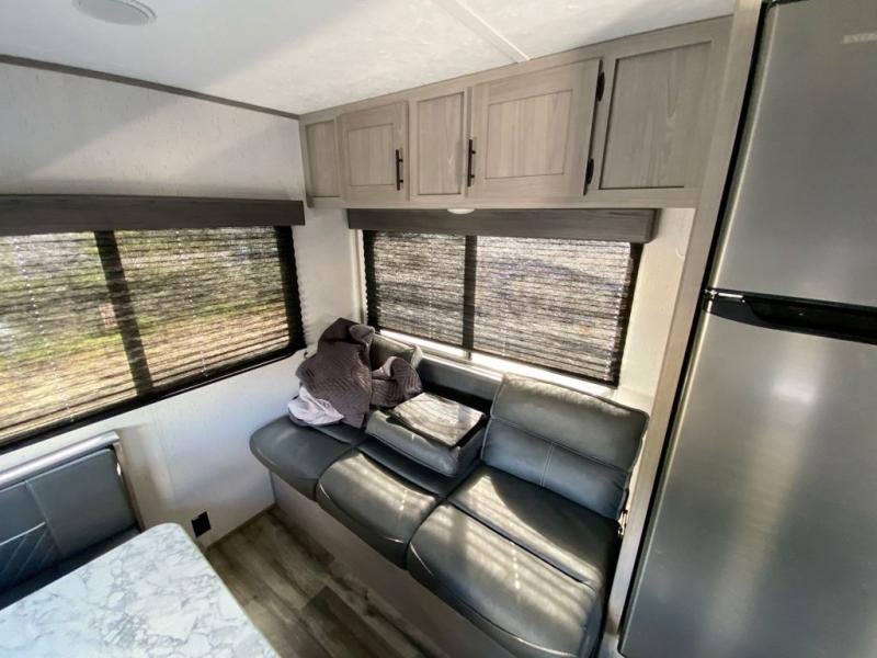 Your tent-camping days are over with this travel trailer in tow! Once you arrive at your destination, grab your fishing poles from the pass-through storage and head down to the lake. The full bath will allow you to freshen up when you return, plus there is a bath skylight for added standing space. The chef of your group can prepare dinner on the cooktop or oven, and perishables can be stored in the 10 cu. ft. refrigerator. There is a booth dinette where you can dine at, and a reclining sofa for extra seating space. You will love having your own queen bed up front with dual wardrobes on either side, and your guests can sleep on the furniture in the back!