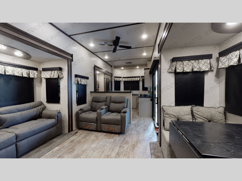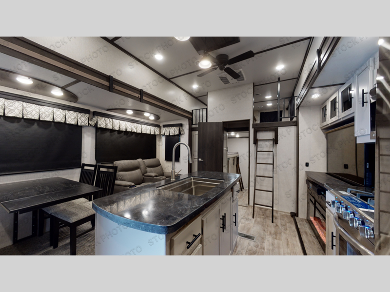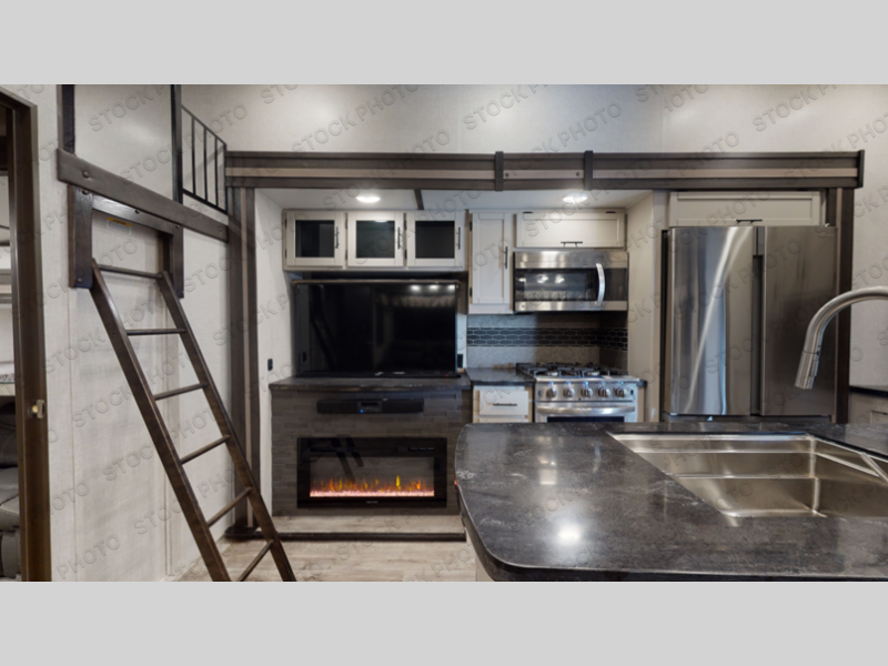 What isn't included in this Hampton? Not much! You will love the rear private bunkhouse with loft area above that includes a ladder to access the area from the main living and kitchen space. The bunkhouse includes two bunk beds, a tri-fold sofa and storage, and the slide out gives the room more floor space, and the windows offer natural lighting and scenic views. The kitchen island allows the cook to prepare and serve meals easily, the hutch offers more storage, and the fireplace is a nice touch. You can dine at the free standing dinette with two chairs and bench seating, or relax on the theater seats. The full bathroom will keep everyone refreshed, and the front private bedroom offers a slide out queen bed, a closet prepped for a washer/dryer option, and lots of storage and windows. And don't forget about the outside kitchen and awning.
