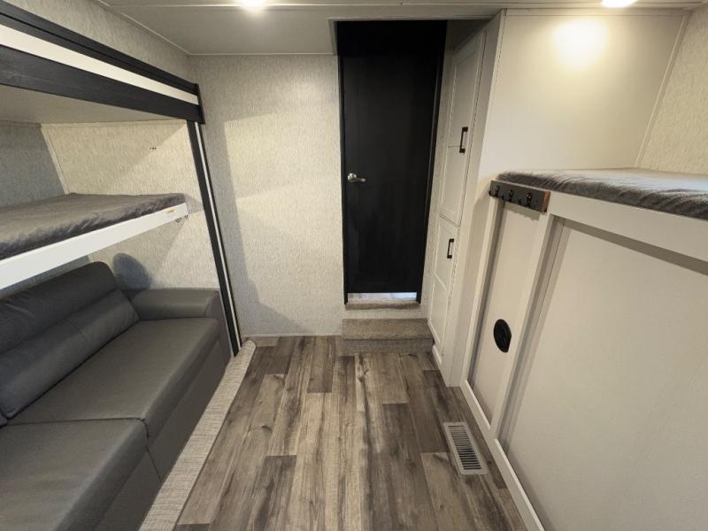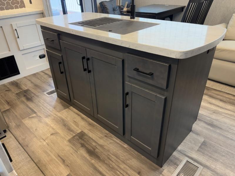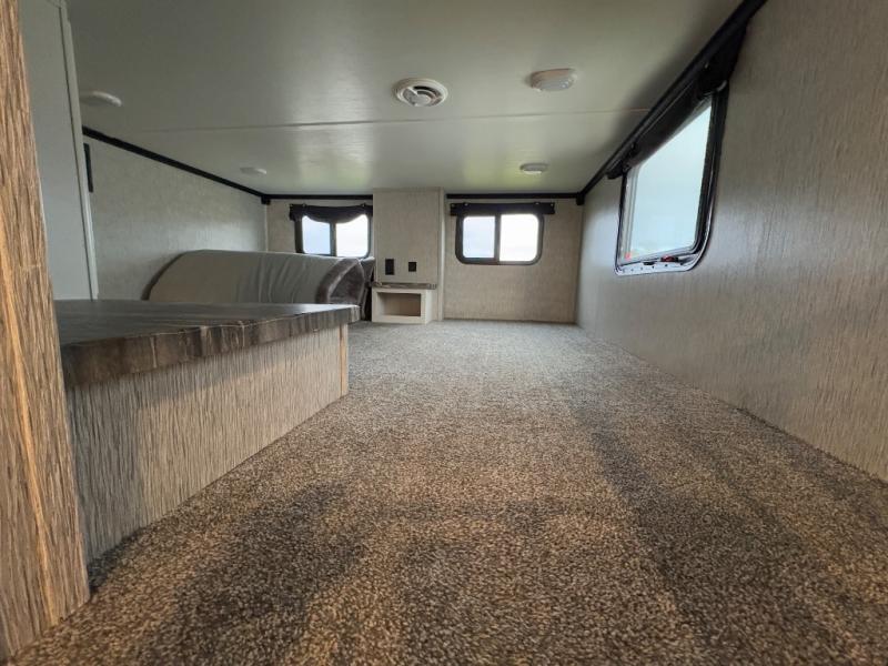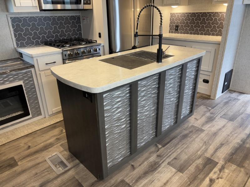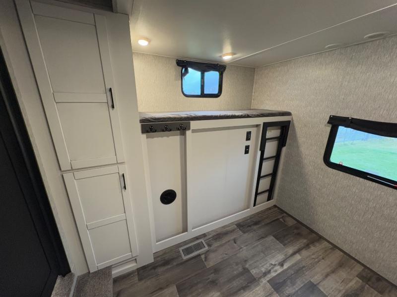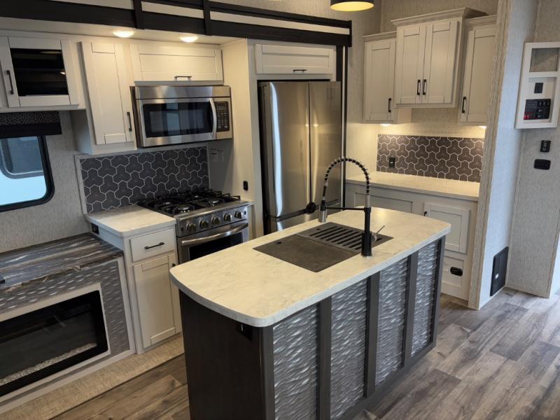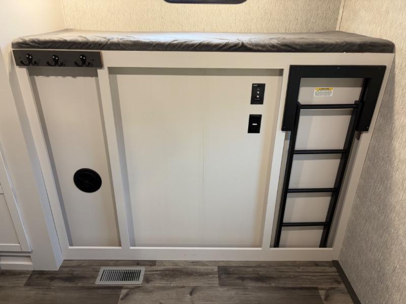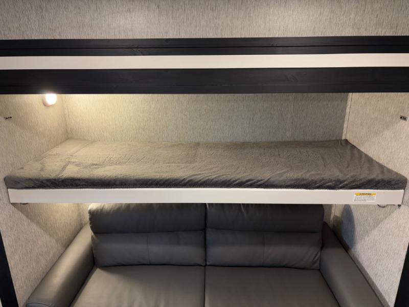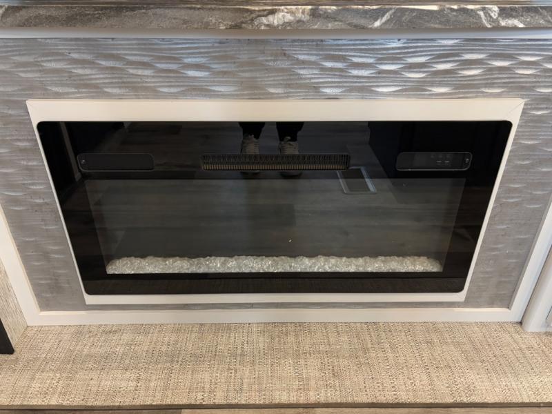 What isn't included in this Hampton? Not much! You will love the rear private bunkhouse with loft area above that includes a ladder to access the area from the main living and kitchen space. The bunkhouse includes two bunk beds, a tri-fold sofa and storage, and the slide out gives the room more floor space, and the windows offer natural lighting and scenic views. The kitchen island allows the cook to prepare and serve meals easily, the hutch offers more storage, and the fireplace is a nice touch. You can dine at the free standing dinette with two chairs and bench seating, or relax on the theater seats. The full bathroom will keep everyone refreshed, and the front private bedroom offers a slide out queen bed, a closet prepped for a washer/dryer option, and lots of storage and windows. And don't forget about the outside kitchen and awning.
