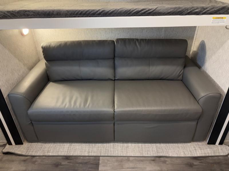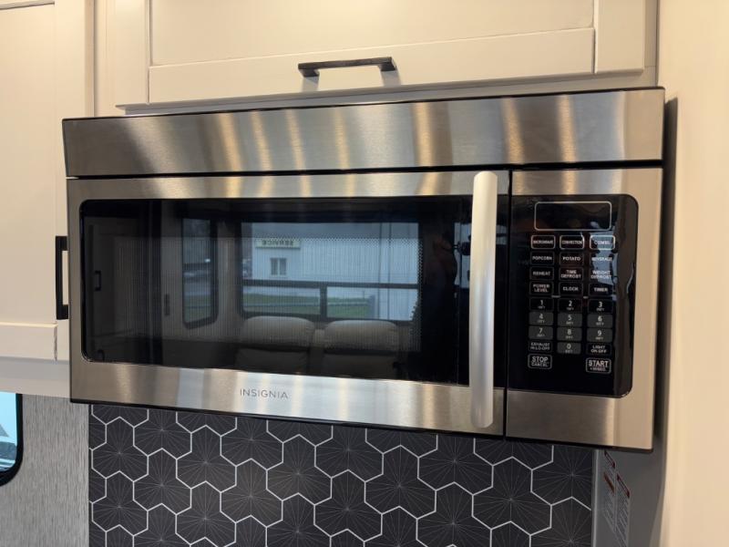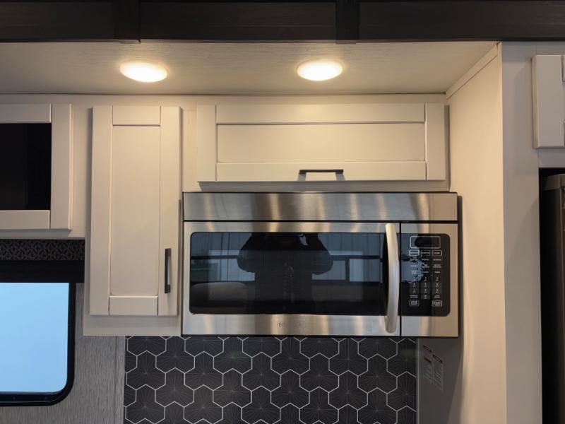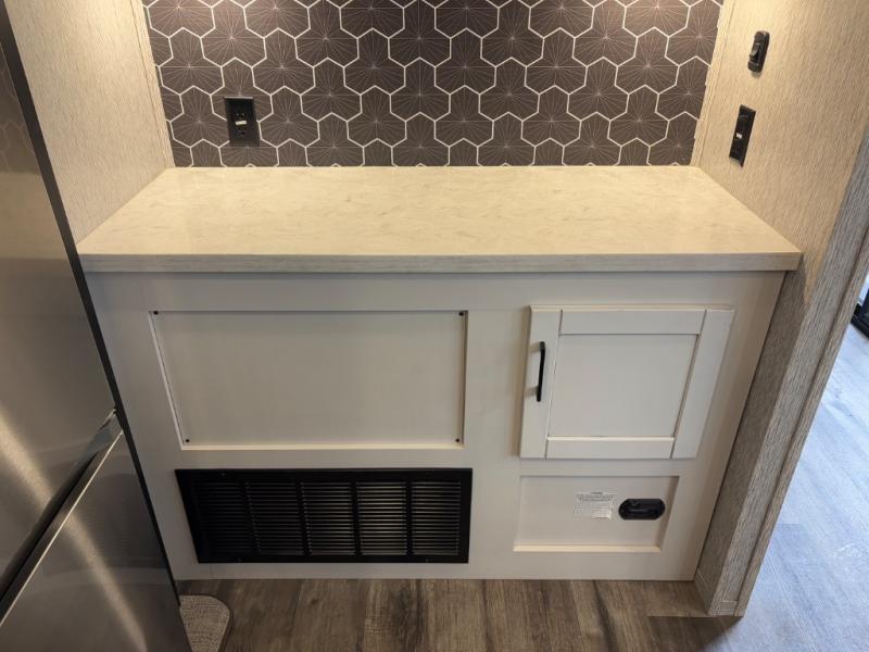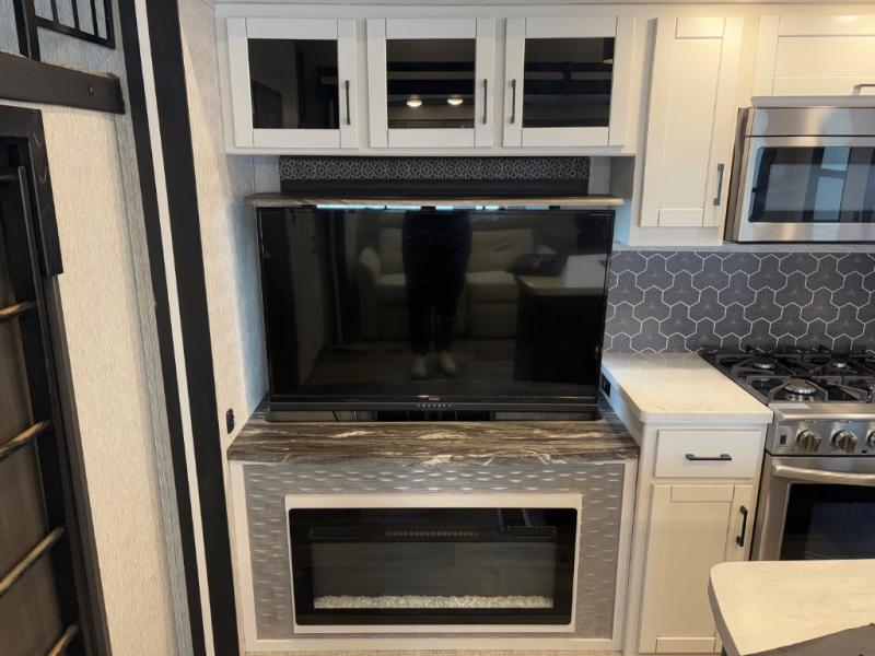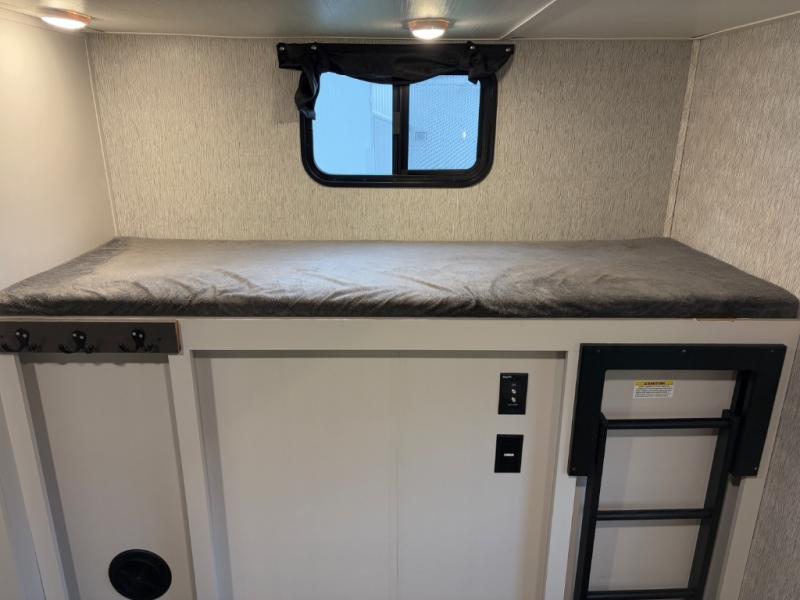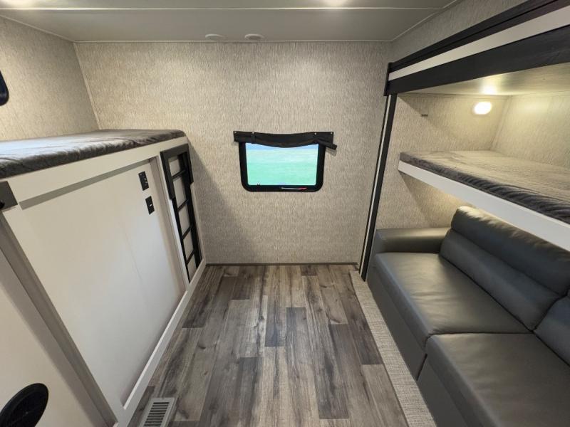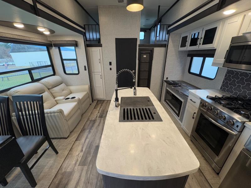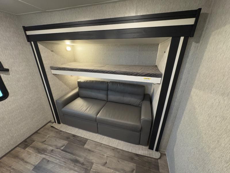 What isn't included in this Hampton? Not much! You will love the rear private bunkhouse with loft area above that includes a ladder to access the area from the main living and kitchen space. The bunkhouse includes two bunk beds, a tri-fold sofa and storage, and the slide out gives the room more floor space, and the windows offer natural lighting and scenic views. The kitchen island allows the cook to prepare and serve meals easily, the hutch offers more storage, and the fireplace is a nice touch. You can dine at the free standing dinette with two chairs and bench seating, or relax on the theater seats. The full bathroom will keep everyone refreshed, and the front private bedroom offers a slide out queen bed, a closet prepped for a washer/dryer option, and lots of storage and windows. And don't forget about the outside kitchen and awning.