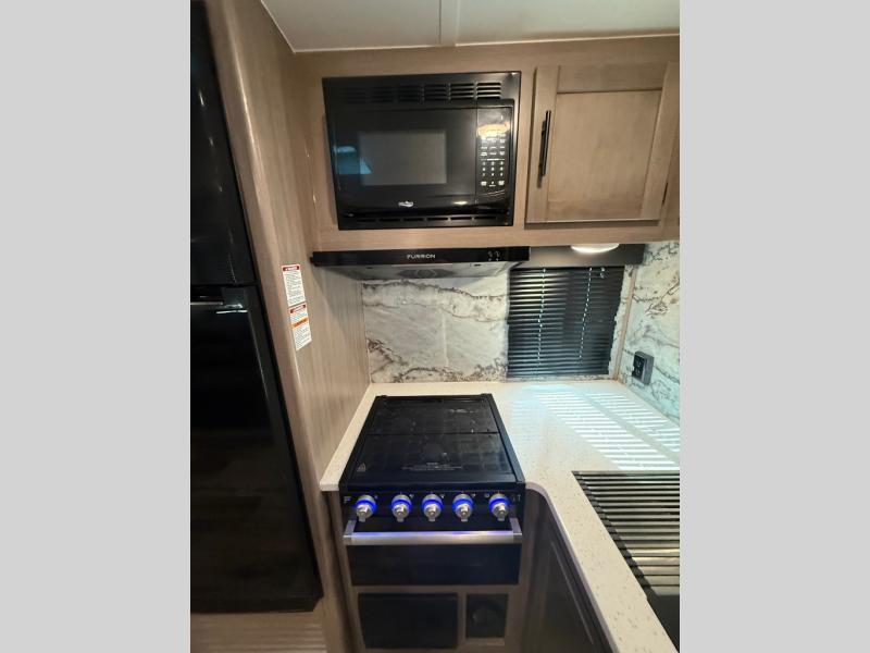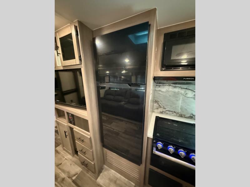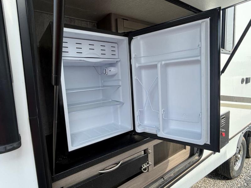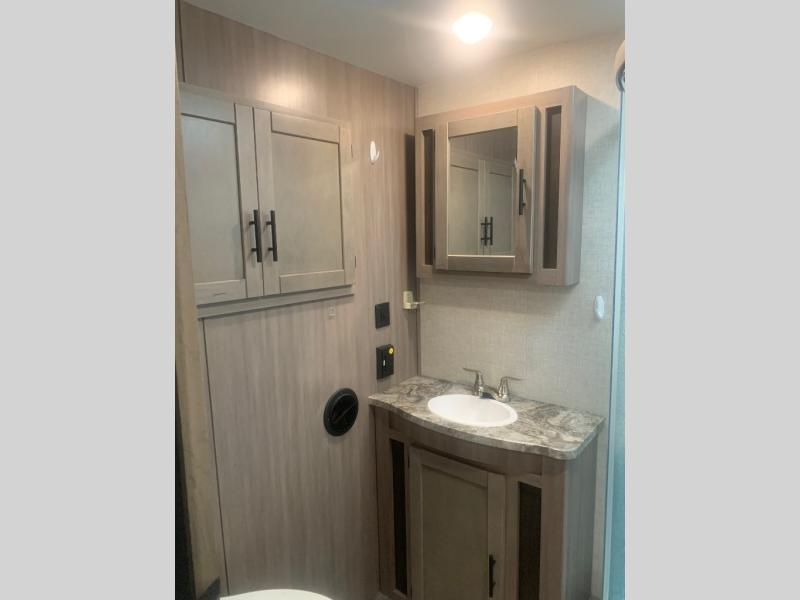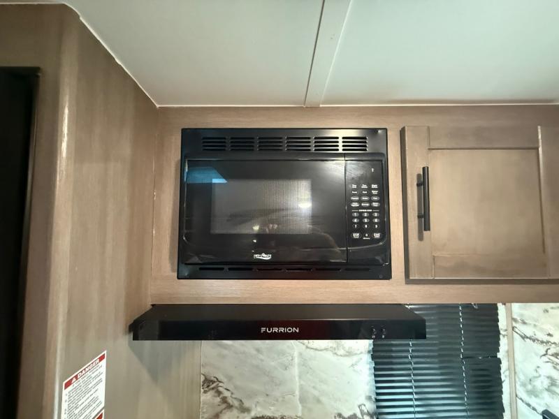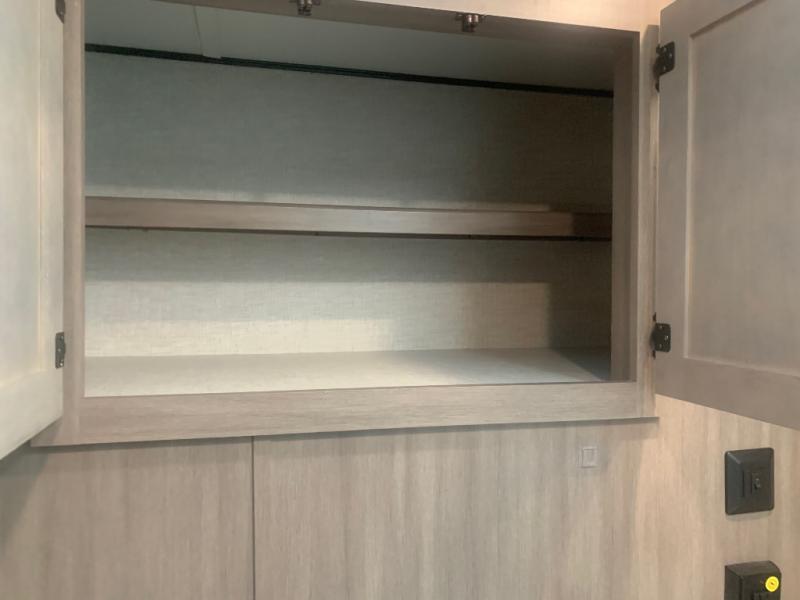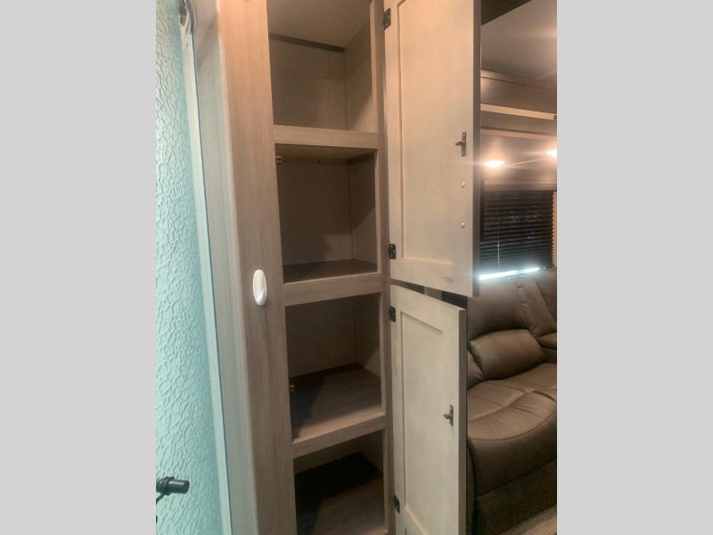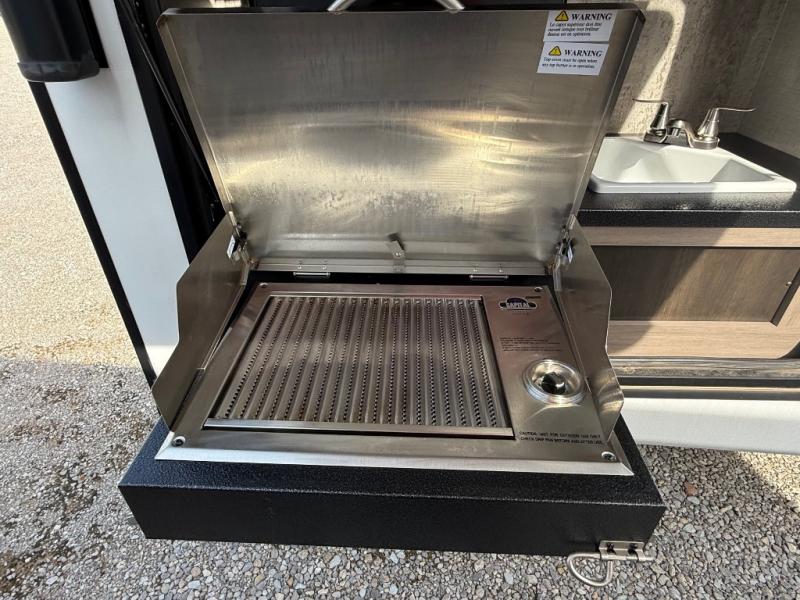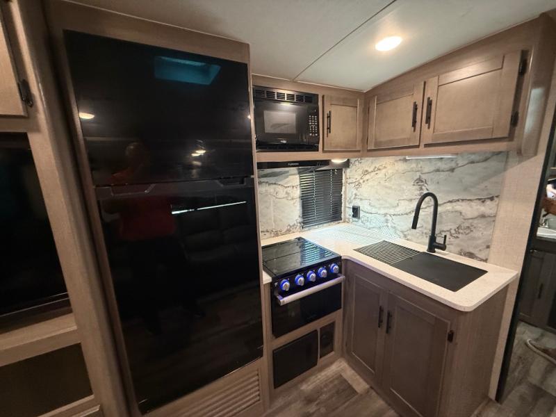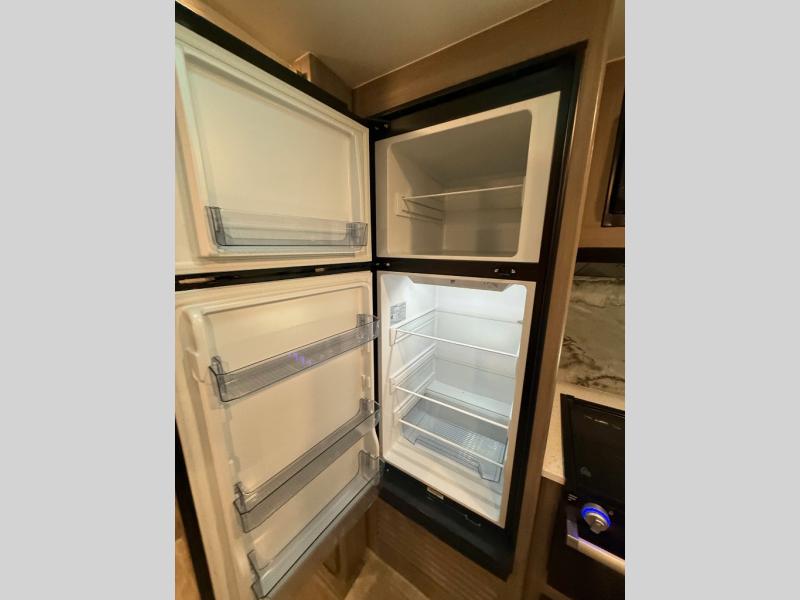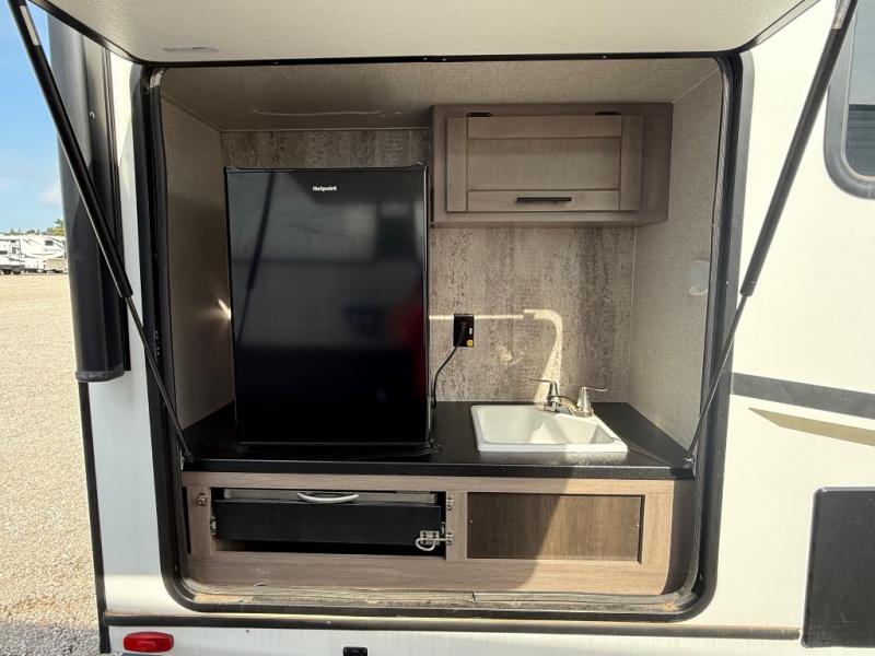 You will love the added interior space you have in this travel trailer thanks to the large slide out in the main living area. Here, you'll enjoy playing cards at the XL booth dinette and relaxing on the tri-fold sofa. Make home-cooked meals on the glass top range or use the exterior camp kitchen. There is even an exterior refrigerator for cold drinks, and the power awning will shade you from the hot summer sun. This model features a full rear bath for added privacy, and the shower skylight will allow natural light in. The front private bedroom includes a king bed, dual wardrobes, plus a shoe storage and pet station for your convenience!