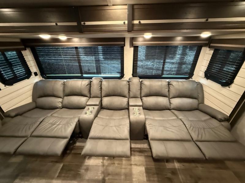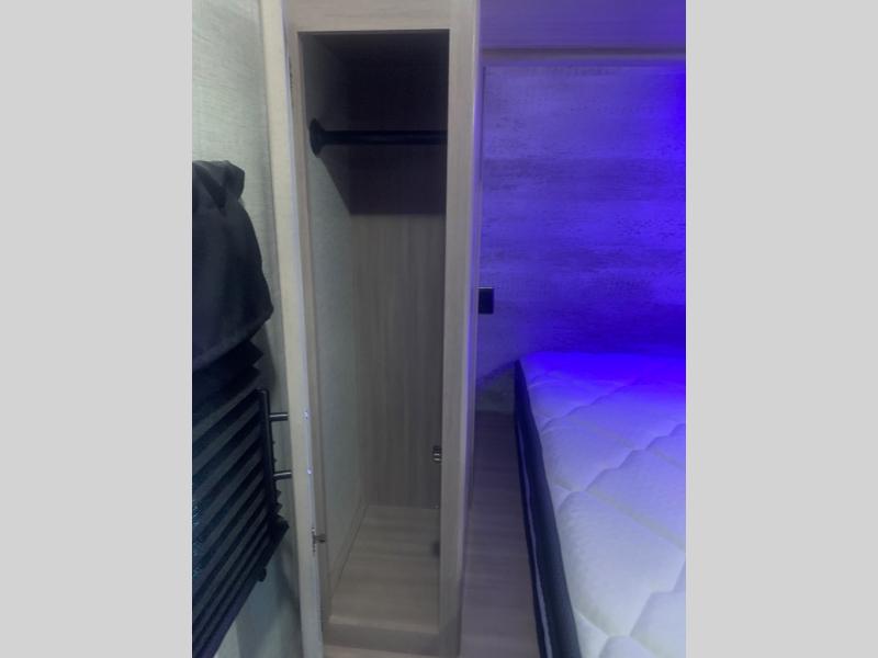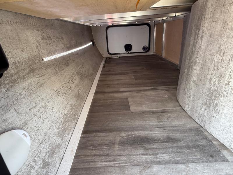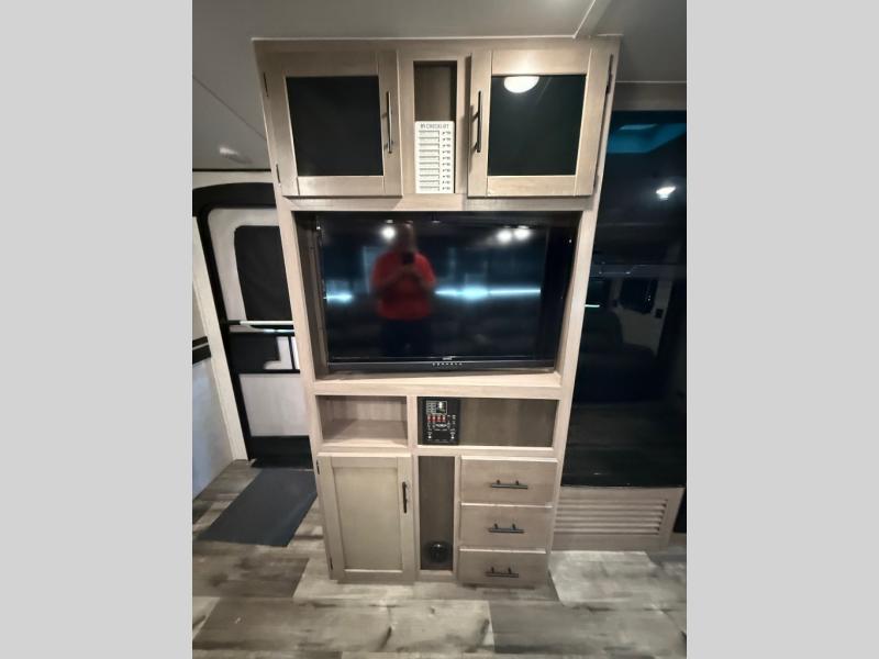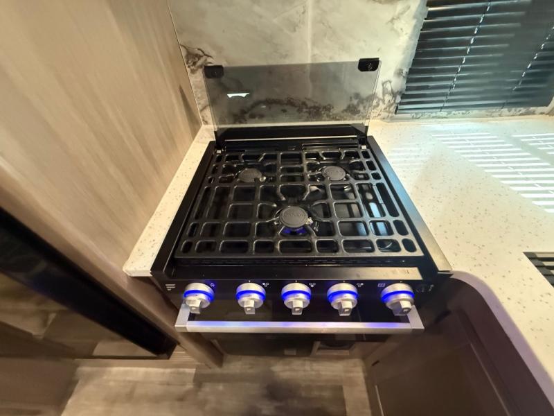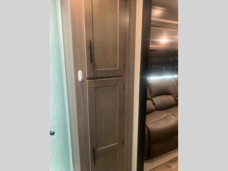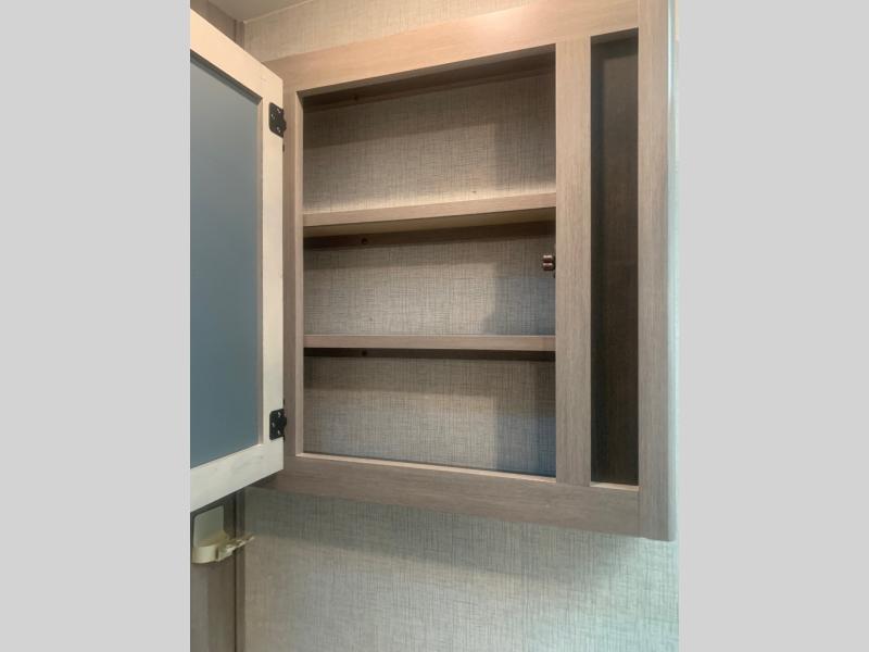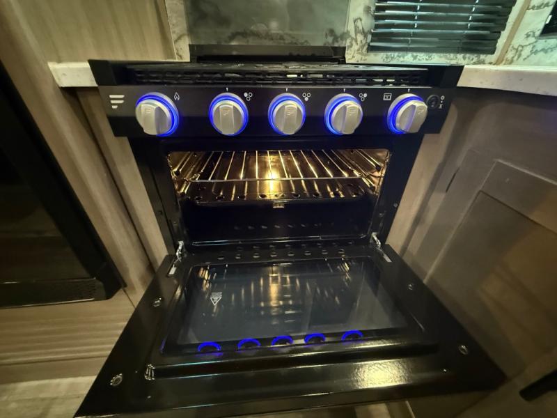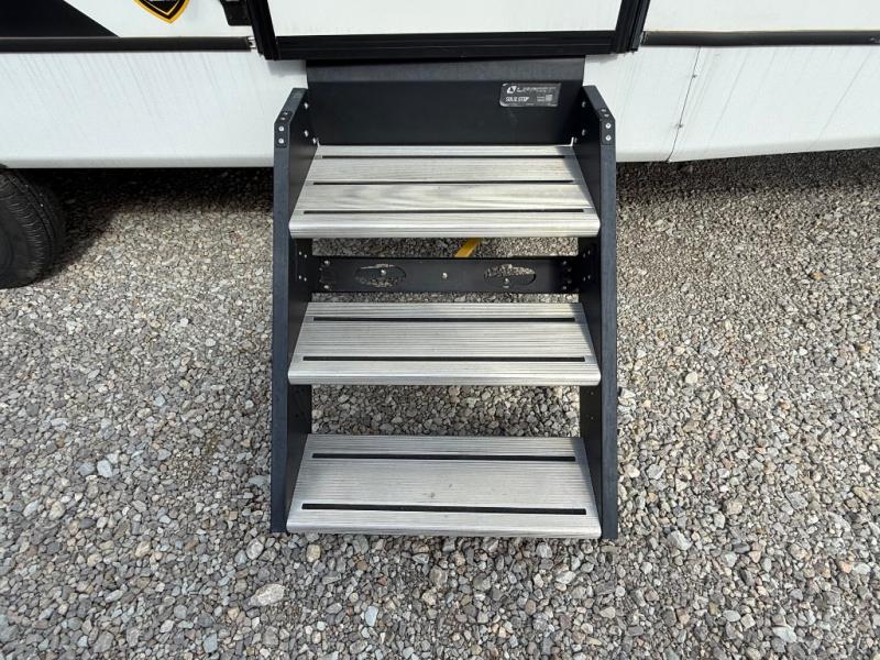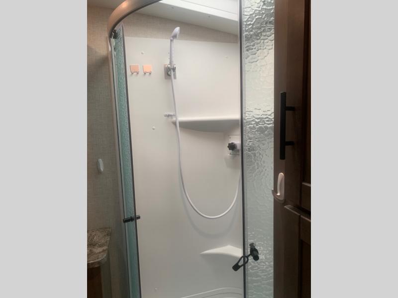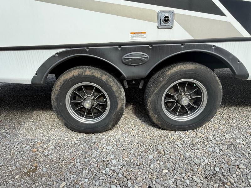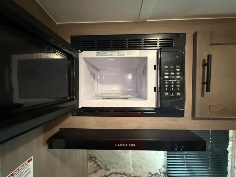 You will love the added interior space you have in this travel trailer thanks to the large slide out in the main living area. Here, you'll enjoy playing cards at the XL booth dinette and relaxing on the tri-fold sofa. Make home-cooked meals on the glass top range or use the exterior camp kitchen. There is even an exterior refrigerator for cold drinks, and the power awning will shade you from the hot summer sun. This model features a full rear bath for added privacy, and the shower skylight will allow natural light in. The front private bedroom includes a king bed, dual wardrobes, plus a shoe storage and pet station for your convenience!