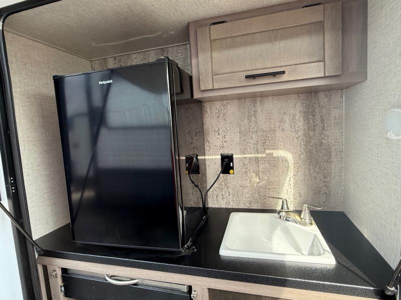 With any Sunset Trail travel trailer by CrossRoads RV, the interior offers a stainless steel farmhouse sink with a cover, solid surface kitchen countertops, and a docking station with 12 Volt, USB Port, and 110 Outlets. Also included is a 15000BTU air conditioner plus upgraded insulation with roof and floor reflective foil for added comfort, plus sturdy construction elements like a plywood bed board with strut assist, residential wood window trim, and hardwood cabinet doors. Make your lightweight and comfortable RV decision today!