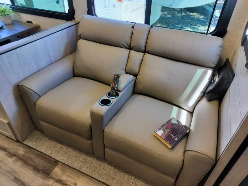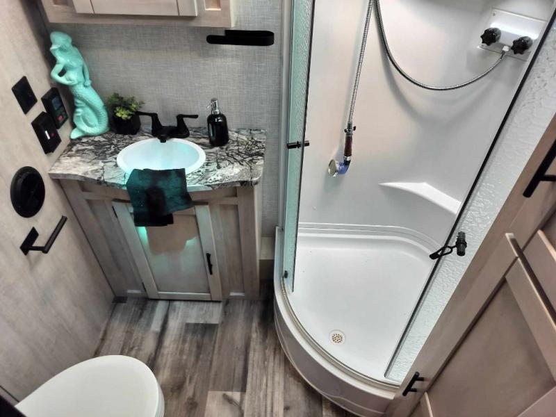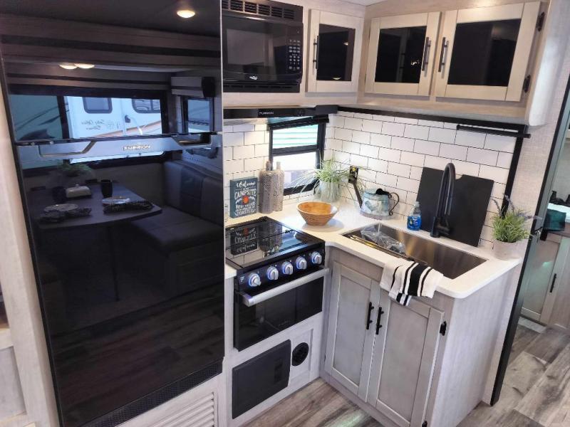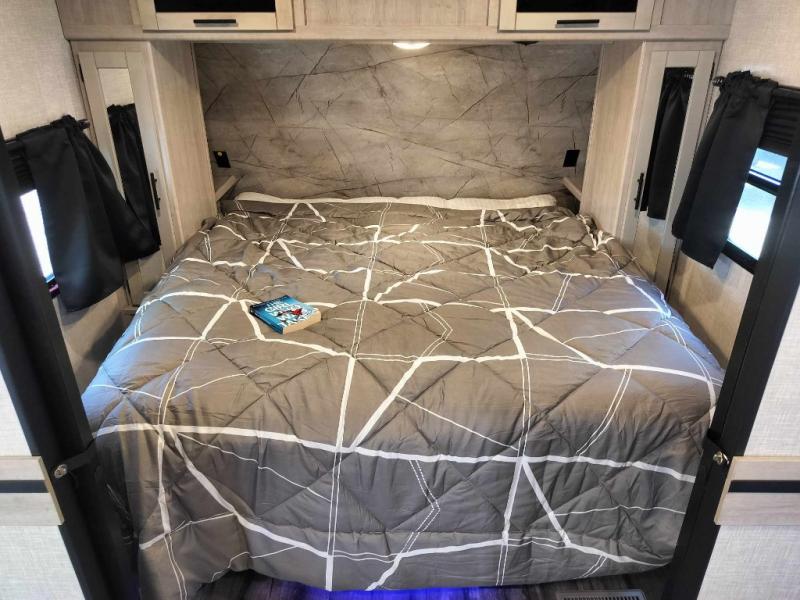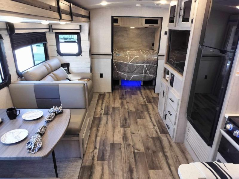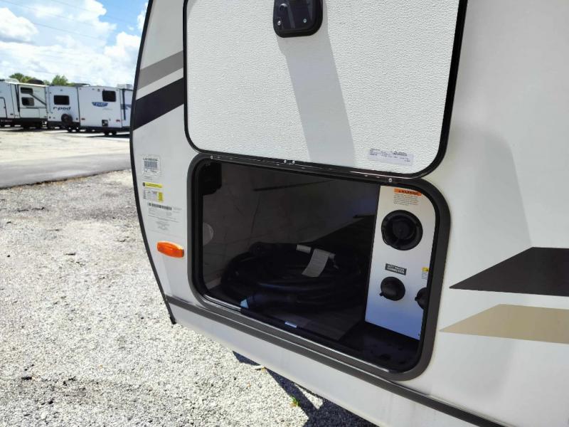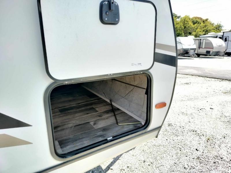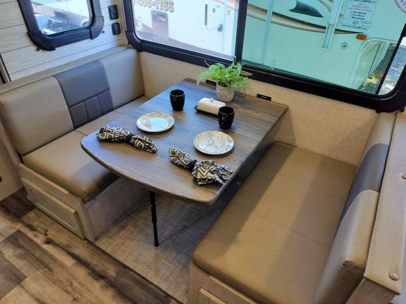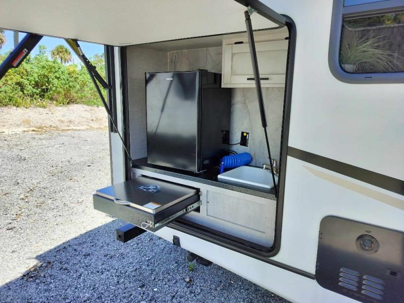 You will love the added interior space you have in this travel trailer thanks to the large slide out in the main living area. Here, you'll enjoy playing cards at the XL booth dinette and relaxing on the tri-fold sofa. Make home-cooked meals on the glass top range or use the exterior camp kitchen. There is even an exterior refrigerator for cold drinks, and the power awning will shade you from the hot summer sun. This model features a full rear bath for added privacy, and the shower skylight will allow natural light in. The front private bedroom includes a king bed, dual wardrobes, plus a shoe storage and pet station for your convenience!