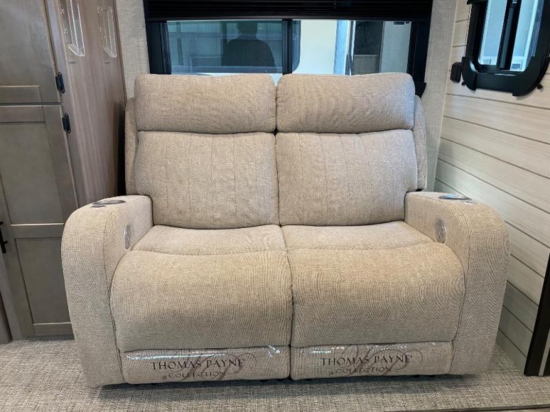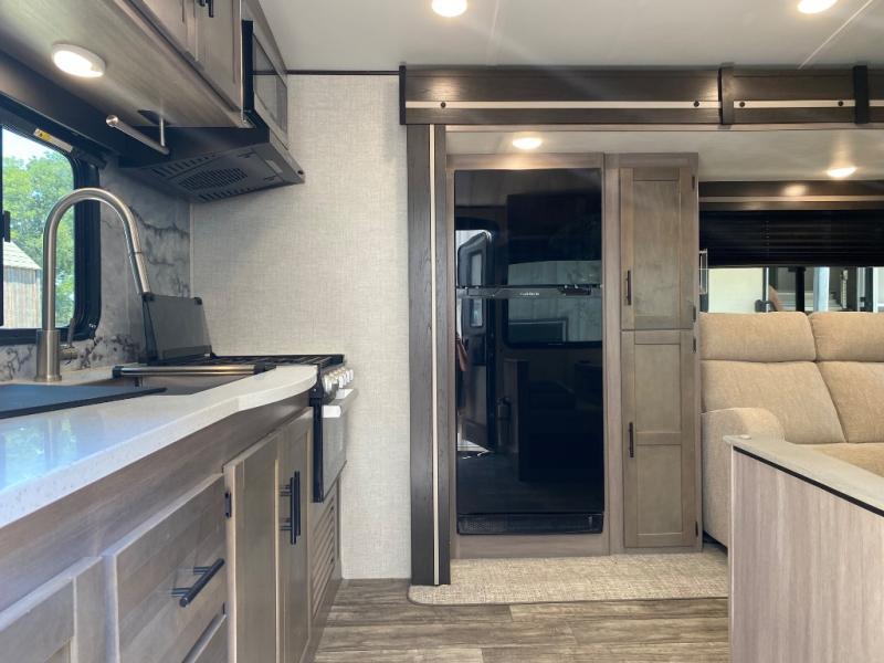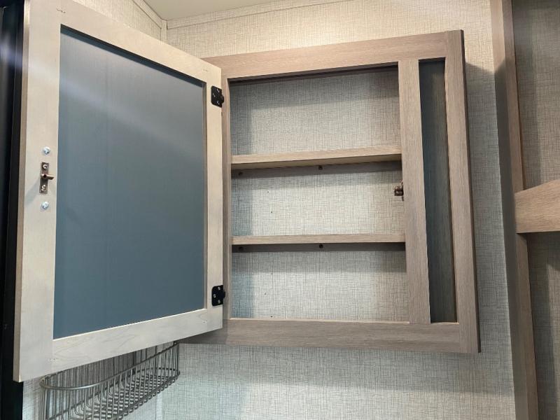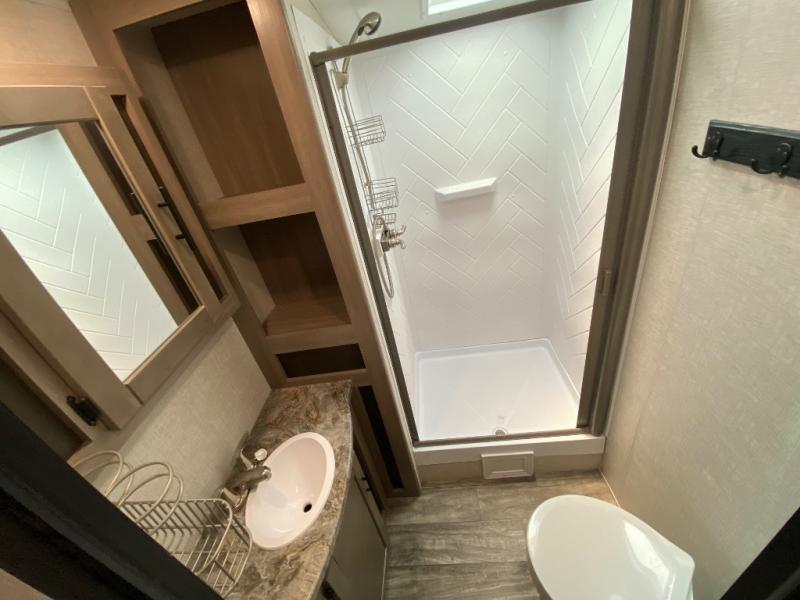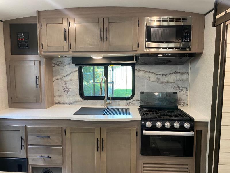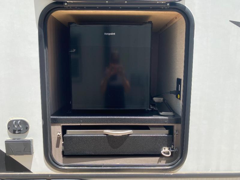 You will love this Sunset Trail rear kitchen layout with a large window over the sink. You can cook just like home with a three-burner cooktop and microwave oven, and dine at the 38" booth dinette inside. The dinette can also transform into added sleeping space if needed along with the 60" sofa found opposite within the single slide. A private bedroom up front features a second entry/exit door for convenience and a king size bed. There are wardrobes on either side of the bed, plus a third wardrobe near the entry door. A full bath features a 30" x 36" shower, toilet, and vanity with sink plus medicine cabinet above. When you are outside, your refreshments are just steps away under the powered awning in the exterior refrigerator.