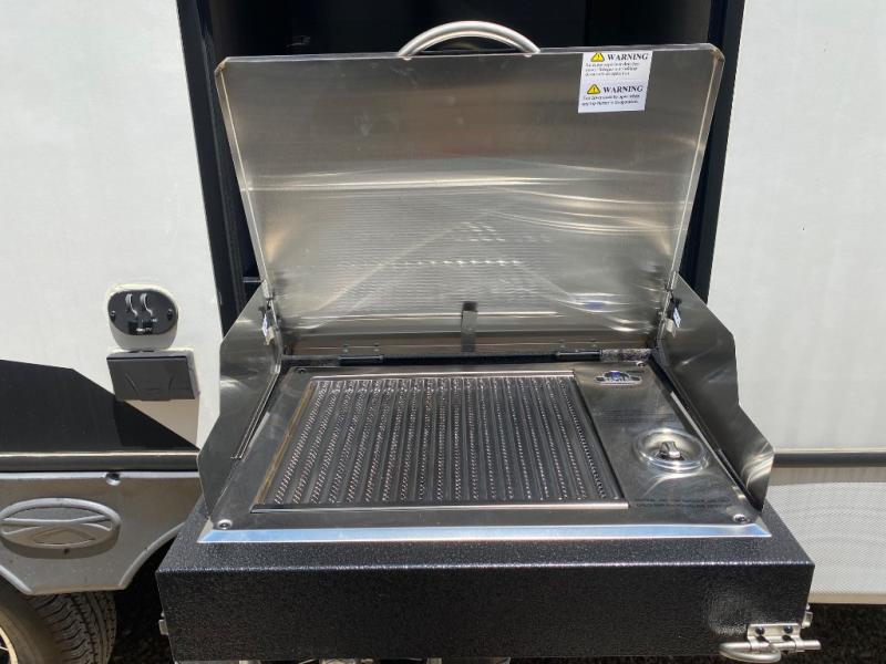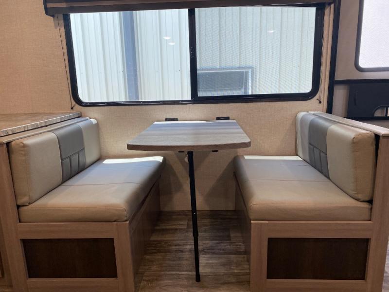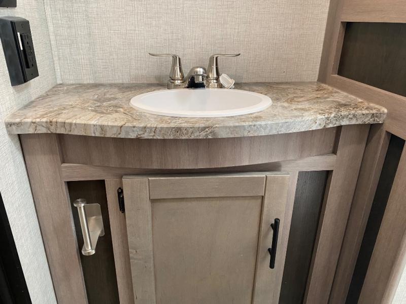 With any Sunset Trail travel trailer by CrossRoads RV, the interior offers a stainless steel farmhouse sink with a cover, solid surface kitchen countertops, and a docking station with 12 Volt, USB Port, and 110 Outlets. Also included is a 13,500 BTU air conditioner plus upgraded insulation with roof and floor reflective foil for added comfort, plus sturdy construction elements like a plywood bed board with strut assist, residential wood window trim, and hardwood cabinet doors. Make your lightweight and comfortable RV decision today!