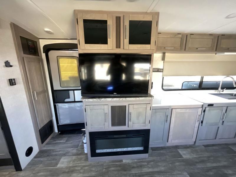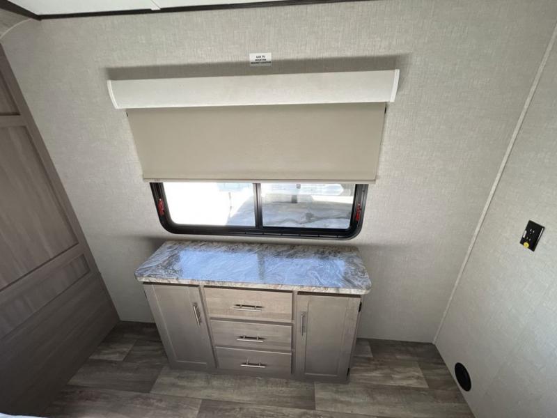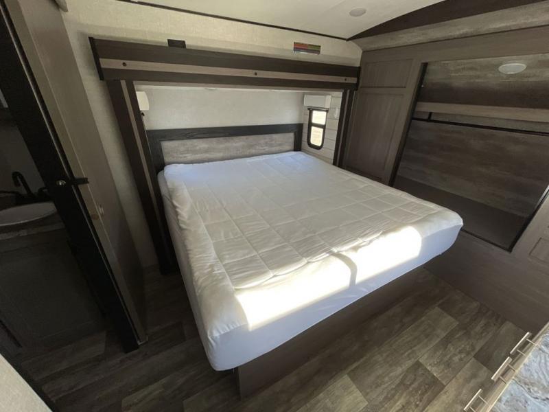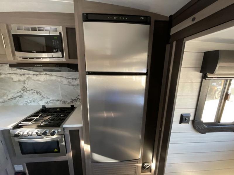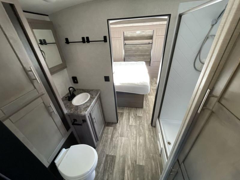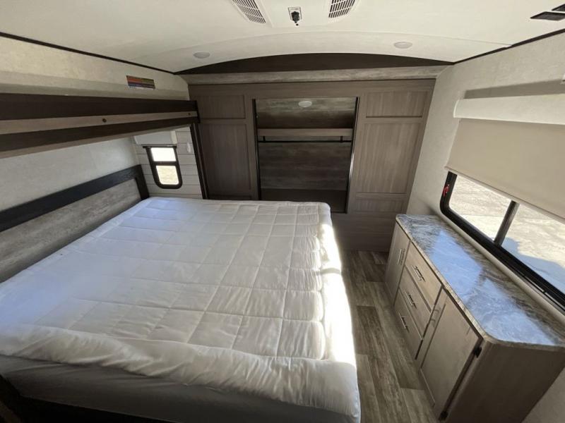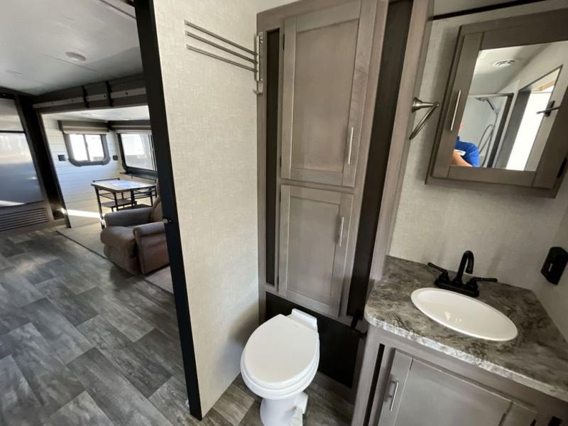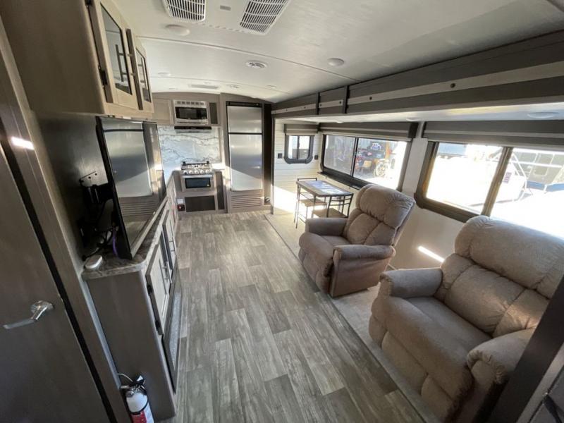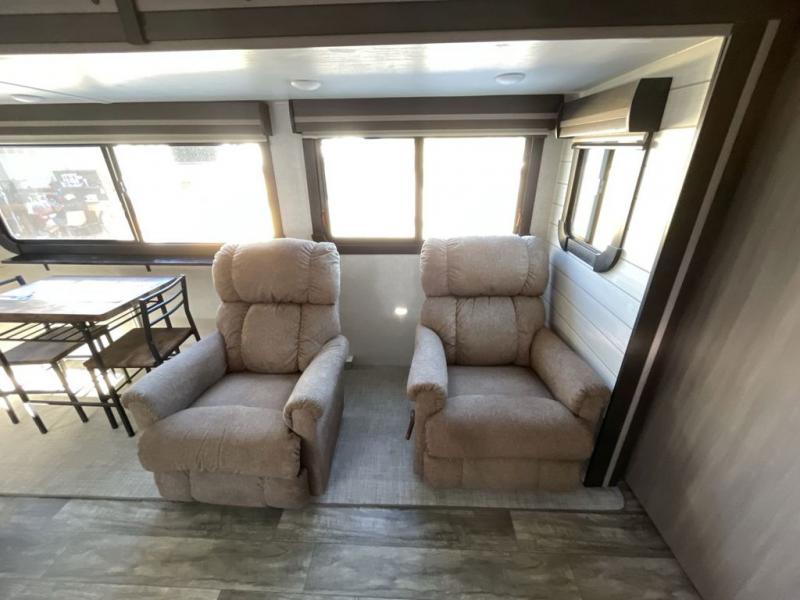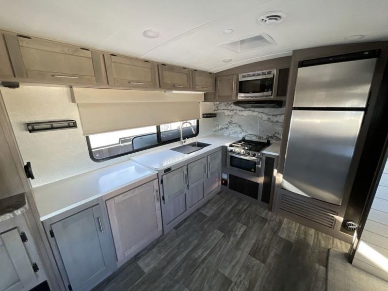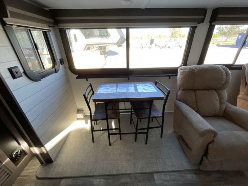 One step inside this travel trailer and you can be sure you've just found your new RV. The large slide out in the main living area will allow the dog to stretch out, and there is a second slide out in the front private bedroom for even more space. The walk-through bath is both spacious and convenient. Your crew can relax on the XL booth dinette and the standard tri-fold sofa can be replaced with an optional theater seating if you're not needing the additional sleeping space. This model also includes an exterior camp kitchen, plus an electric awning with LED lights for the ultimate outdoor living space!