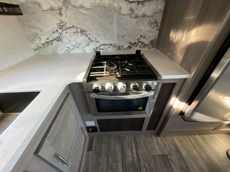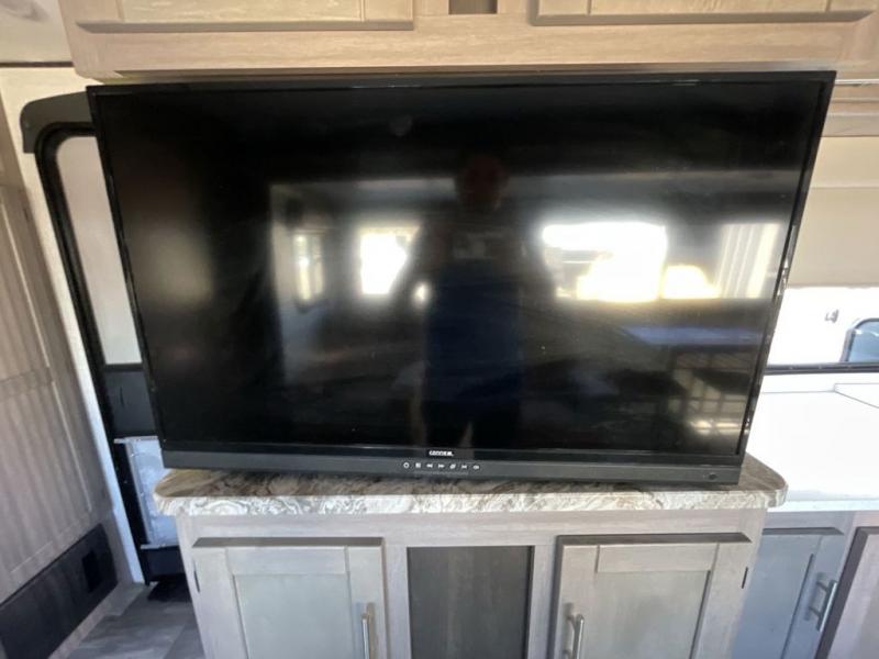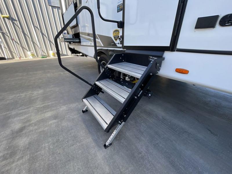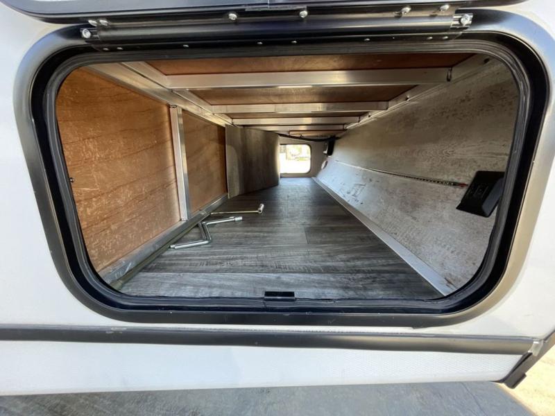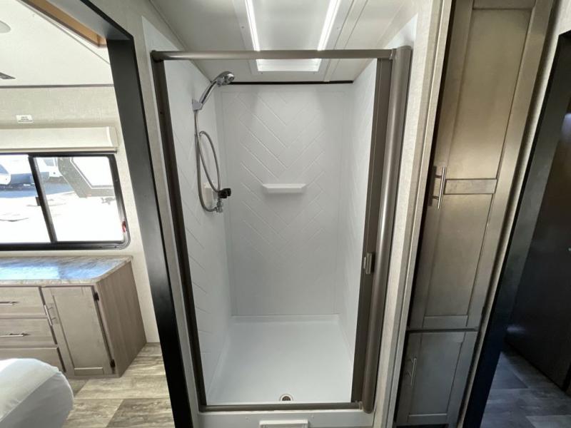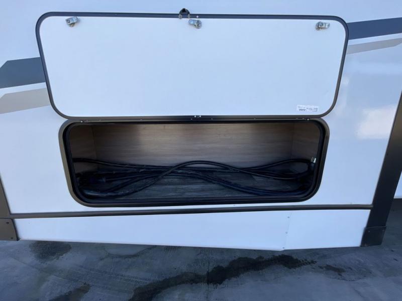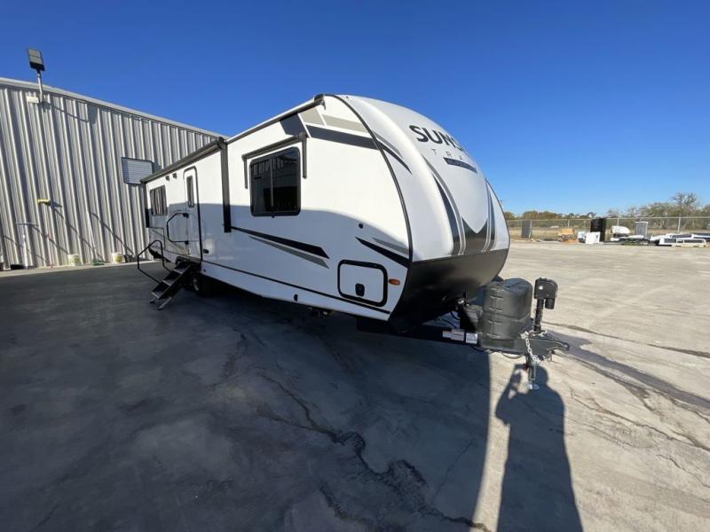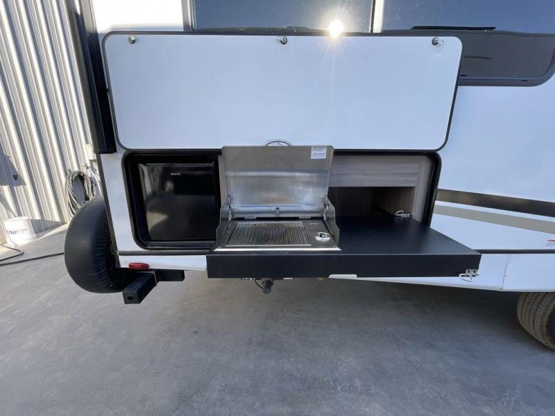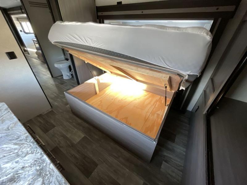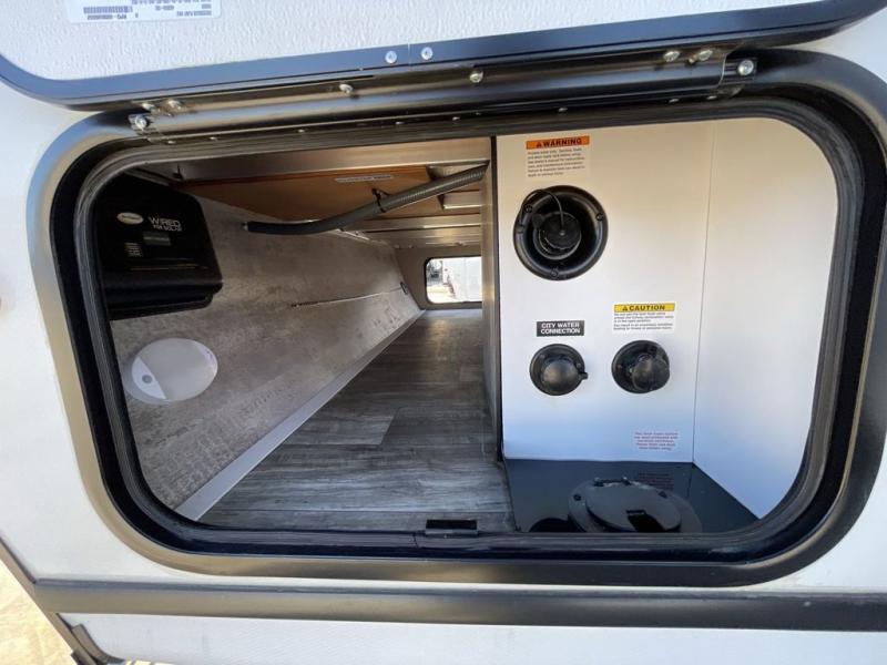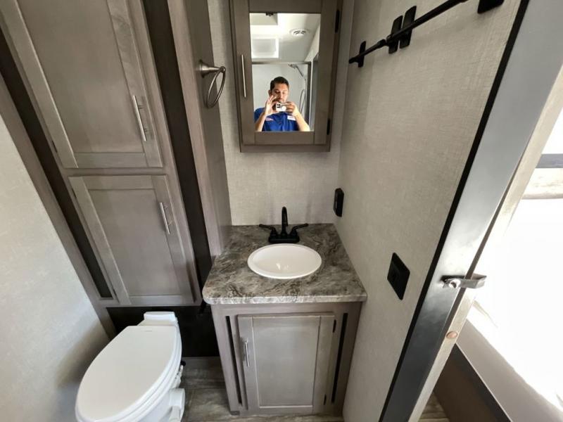 One step inside this travel trailer and you can be sure you've just found your new RV. The large slide out in the main living area will allow the dog to stretch out, and there is a second slide out in the front private bedroom for even more space. The walk-through bath is both spacious and convenient. Your crew can relax on the XL booth dinette and the standard tri-fold sofa can be replaced with an optional theater seating if you're not needing the additional sleeping space. This model also includes an exterior camp kitchen, plus an electric awning with LED lights for the ultimate outdoor living space!