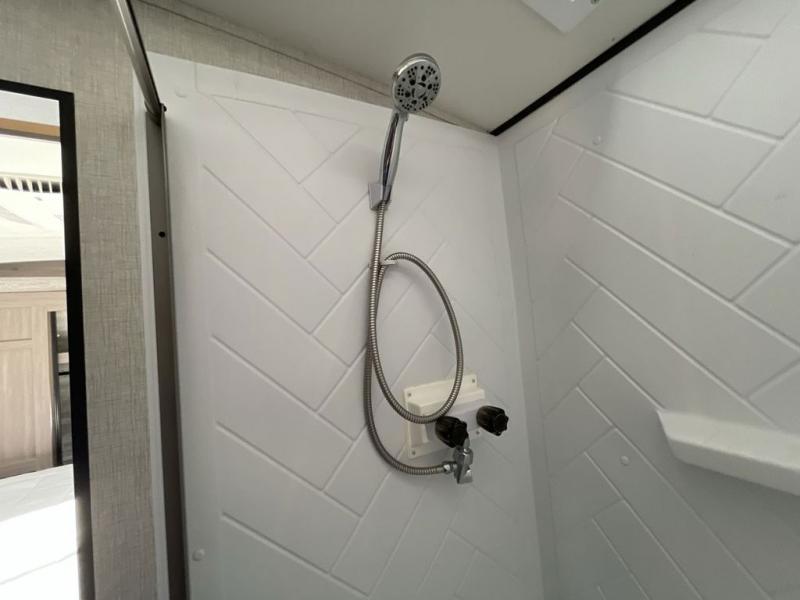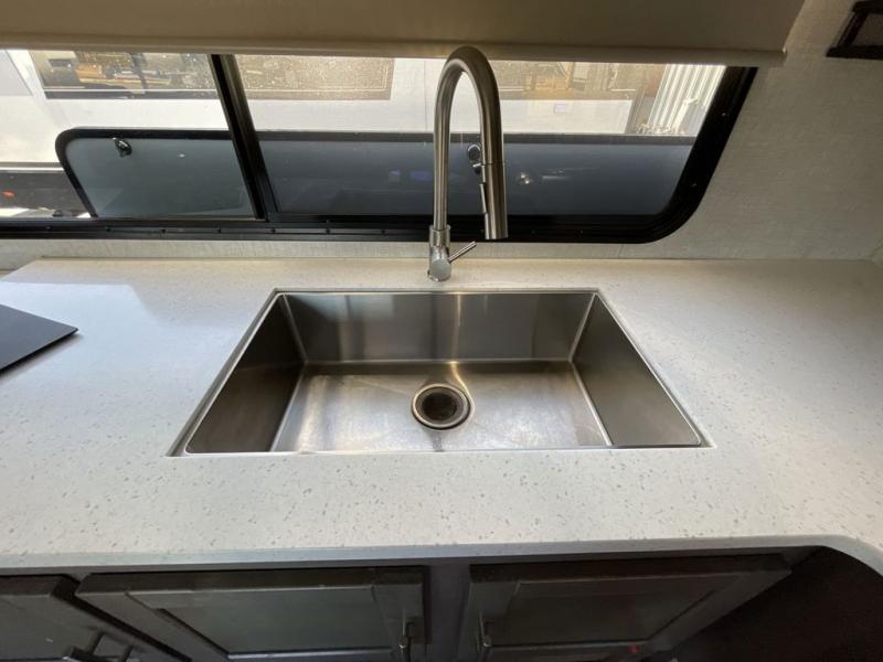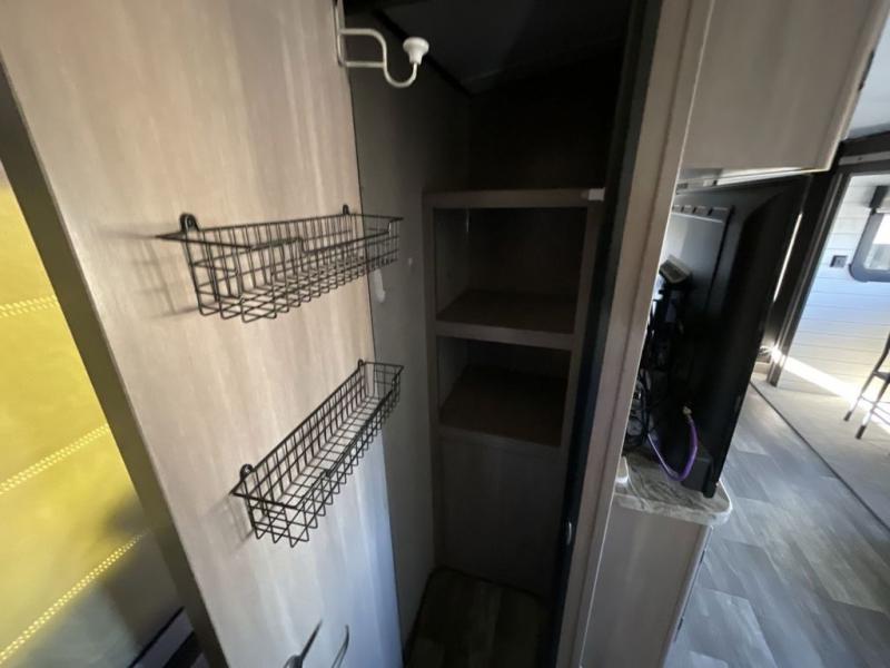 With any Sunset Trail travel trailer by CrossRoads RV, the interior offers a stainless steel farmhouse sink with a cover, solid surface kitchen countertops, and a docking station with 12 Volt, USB Port, and 110 Outlets. Also included is a 13,500 BTU air conditioner plus upgraded insulation with roof and floor reflective foil for added comfort, plus sturdy construction elements like a plywood bed board with strut assist, residential wood window trim, and hardwood cabinet doors. Make your lightweight and comfortable RV decision today!