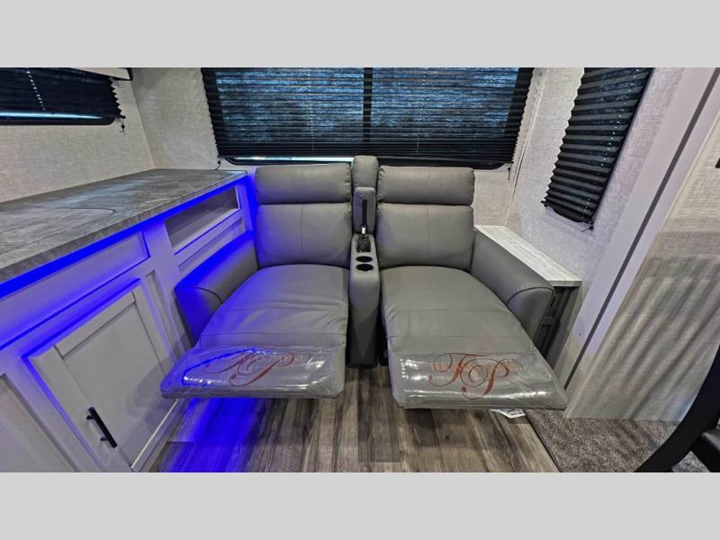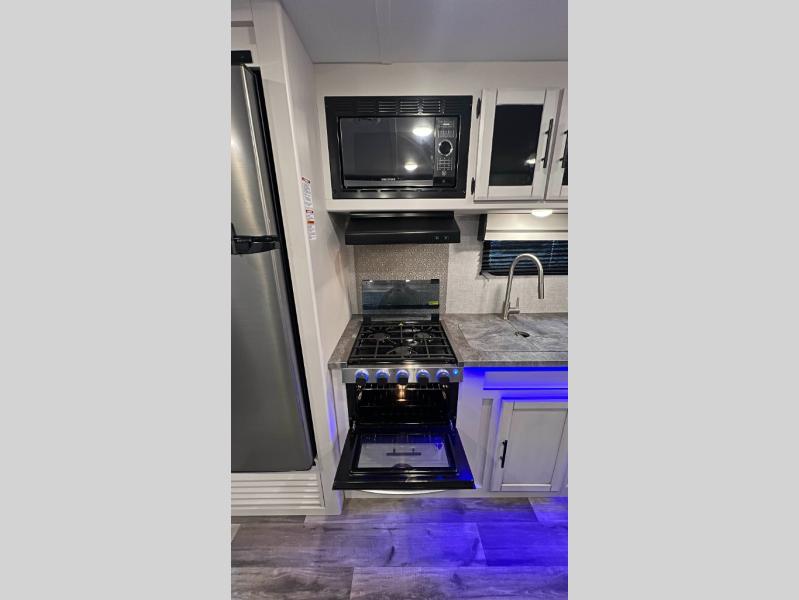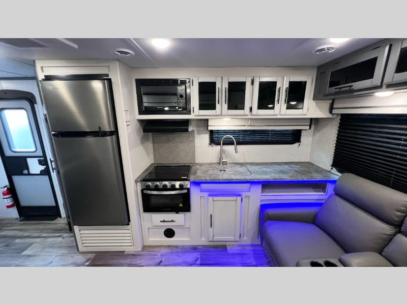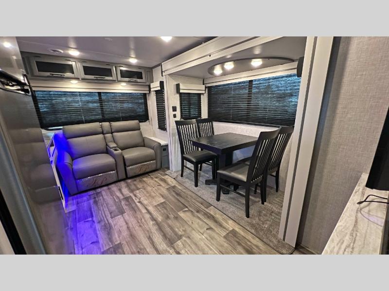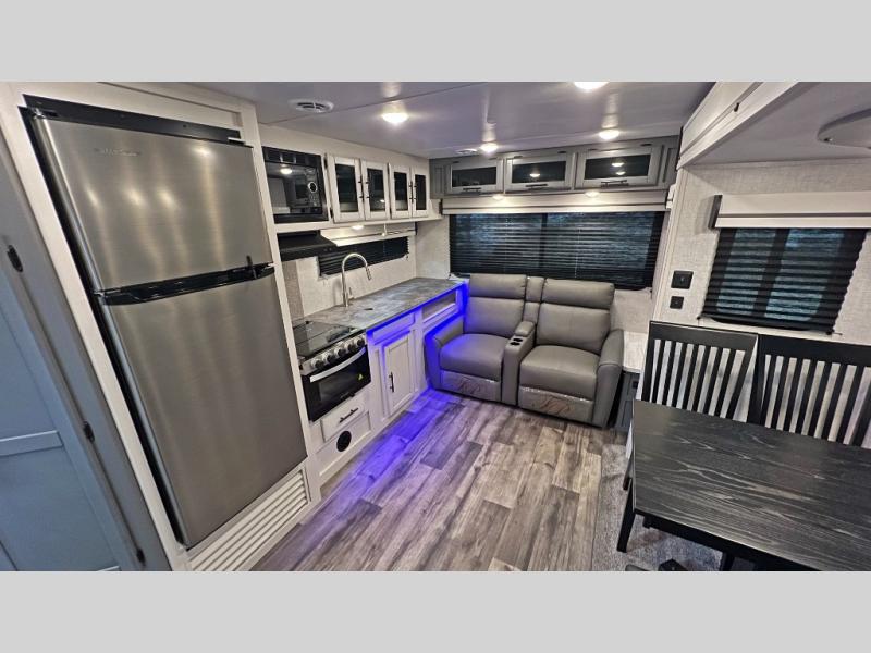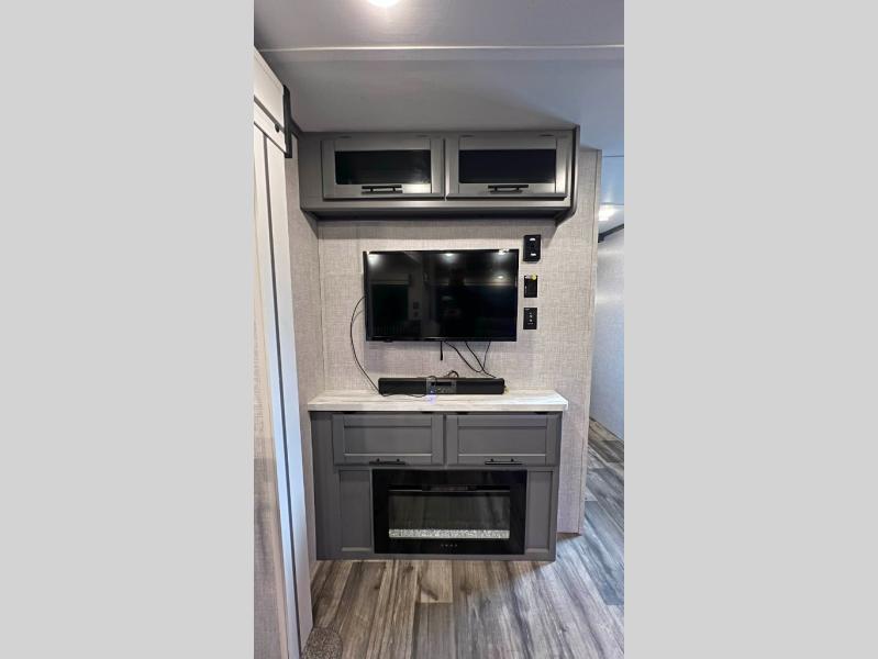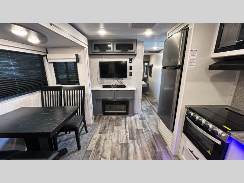 You will feel right at home in this travel trailer that can comfortably sleep four people each night. Once you arrive at your destination, set up the power awning and grab a cold drink from the outside refrigerator. You can then stretch your legs on a trail or two and easily clean up in the full bath when you return. The theater seats sit directly across from the entertainment center and fireplace for easy viewing, and the chef of your group will have all the appliances needed to create a home-cooked meal. You'll love the front private bedroom that includes a king bed, dual shirt closets, plus overhead space to store your things!