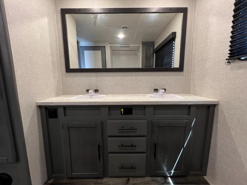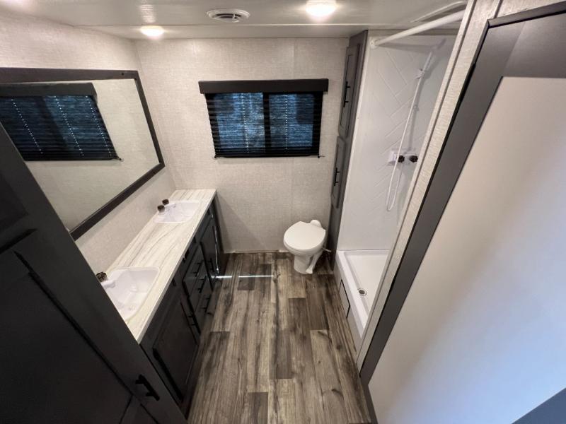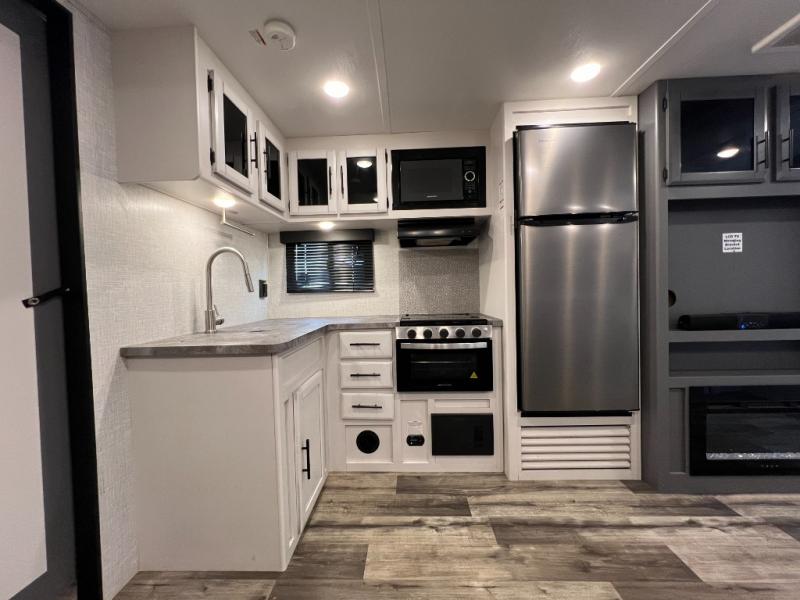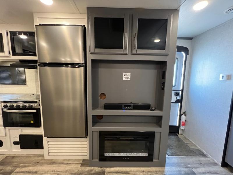 One look at this dual entry travel trailer and you will fall in love. The little ones can play with the dog on the floor thanks to the extra interior space provided by the large slide out. Here, your group can dine around the U-shaped dinette and relax on the 60" jackknife sofa, and the fireplace will give that special touch-of-home. The spacious full rear bath features a 30" x 36" shower, dual bath sinks, plus a closet that has been prepped to add an optional washer and dryer if you choose. Head to the front private bedroom where you can hang your clothes in the dual shirt closets, and get a great night's rest on the king bed. You even have your own exterior entrance door so that you can sneak out to your lawn chairs after everyone is asleep!
