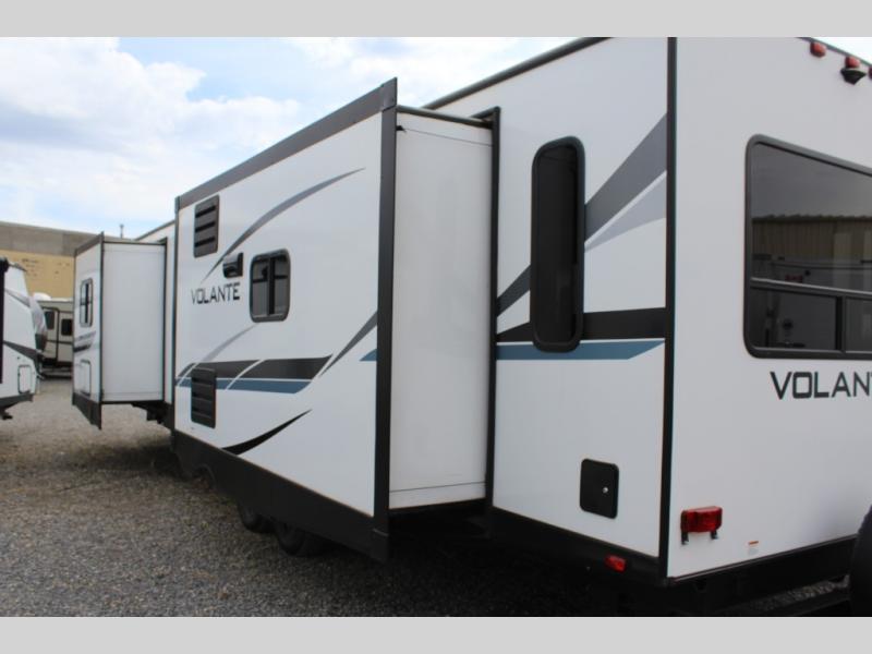 Each Volante fifth wheel or travel trailer by CrossRoads RV includes features and options that will enhance your camping experience. The fiberglass front cap is sure to be eye-catching, and you can plan to camp year around with the fully enclosed and forced air heated underbelly. There is also an outside shower, an electric awning with LED lights, outdoor speakers with LED accents, plus many more exterior conveniences. The interior of each Volante will have you feeling right at home with premium residential furniture, coordinating window treatments in the bedroom, nightstands with outlets in the bedroom, plus USB ports to keep your electronics charged. You will also appreciate a 13,500 BTU A/C, plus solar power prep and WiFi prep if you need to get some work done while you're away from home.