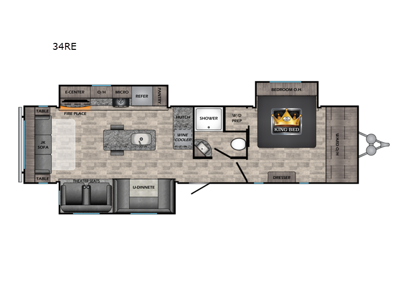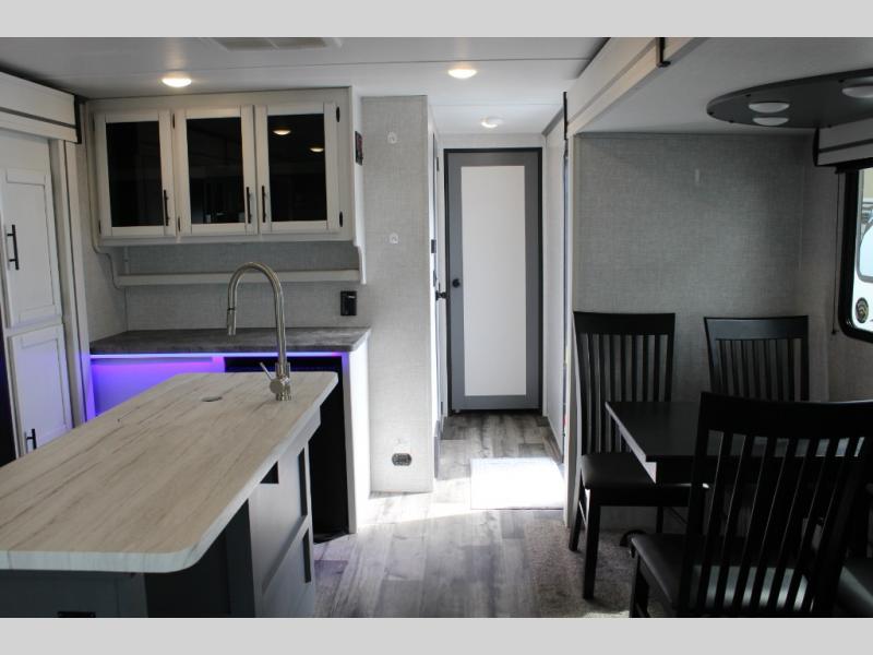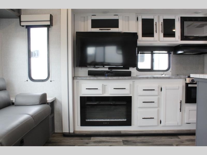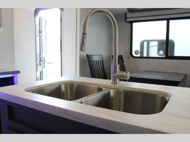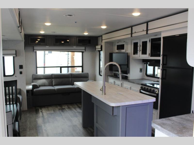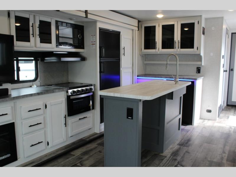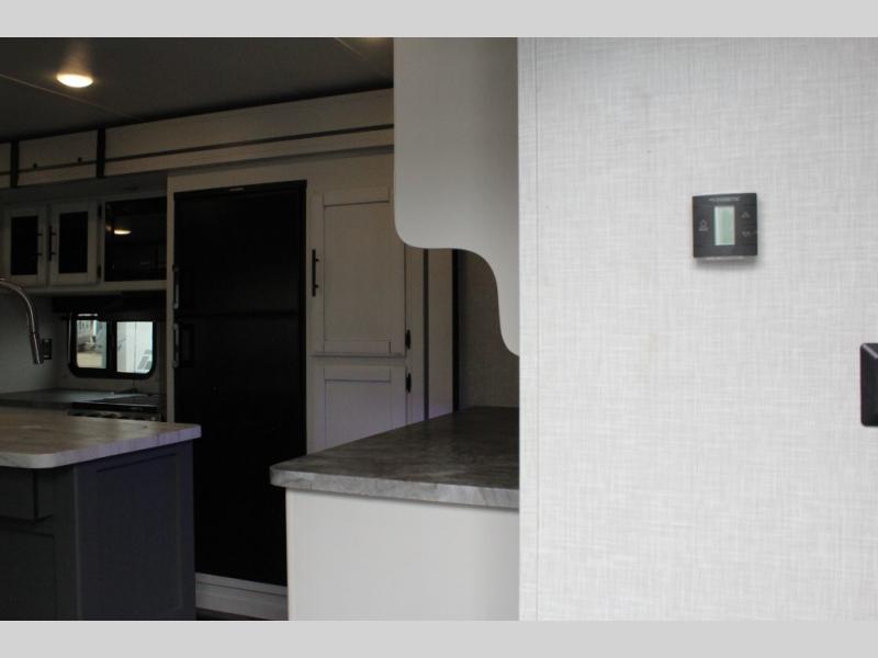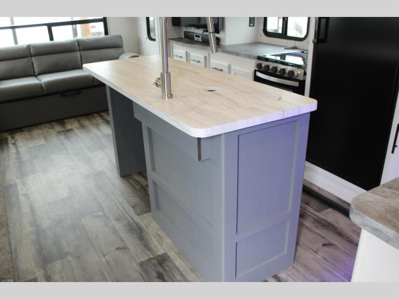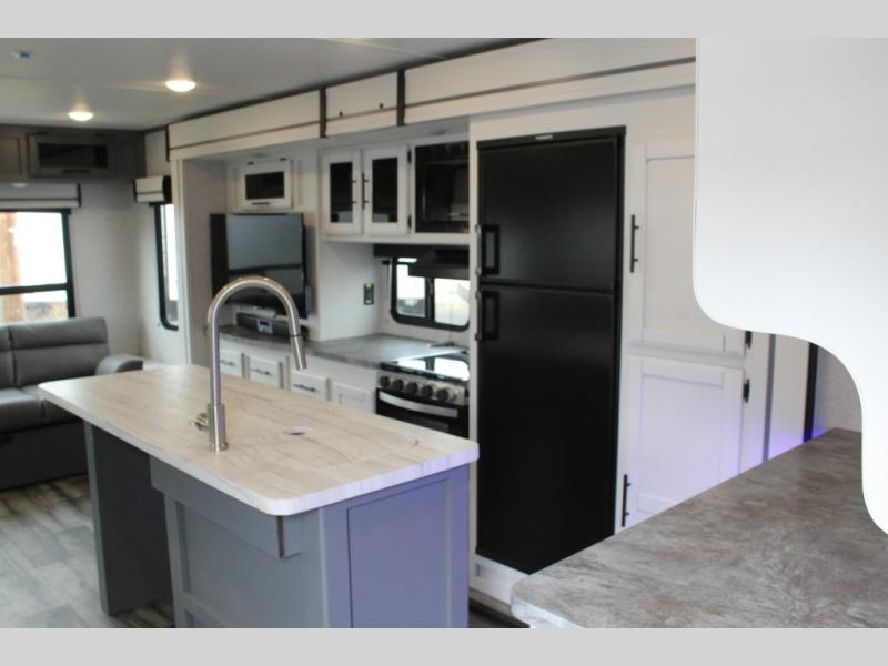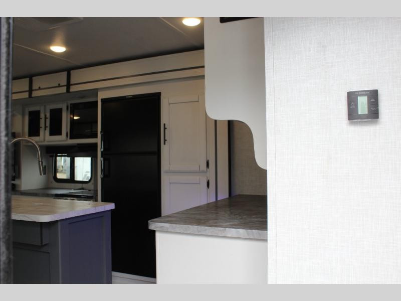 Whether you're relaxing on the theater seats, preparing a meal at the kitchen island, or taking a rest on the slide out king bed, you will enjoy every minute spent in this travel trailer. Your guests will love to sit at the stools around the kitchen island, or they can play a game around the U-shaped dinette. This model includes a hutch with a wine cooler to serve your guests, and the pantry can store snacks for everyone. When it's time to call it a night, the front private bedroom will feel just like home with its king bed and a large front wardrobe. There is even a space that has been prepped to add an optional washer and dryer if you choose!