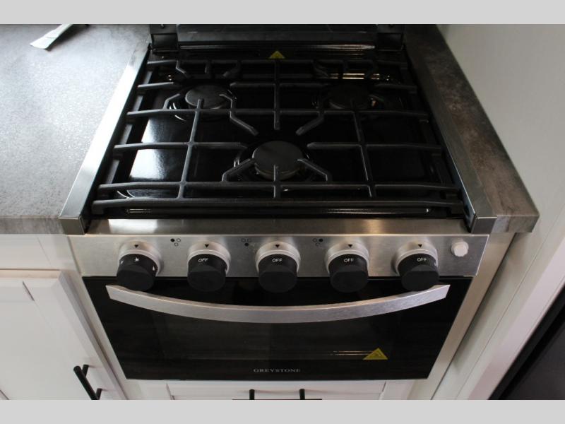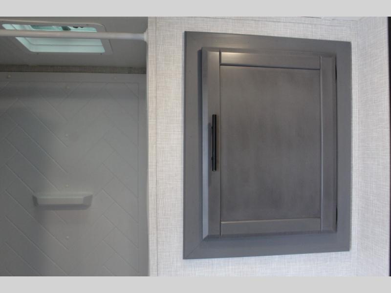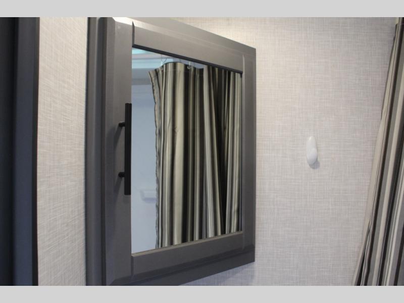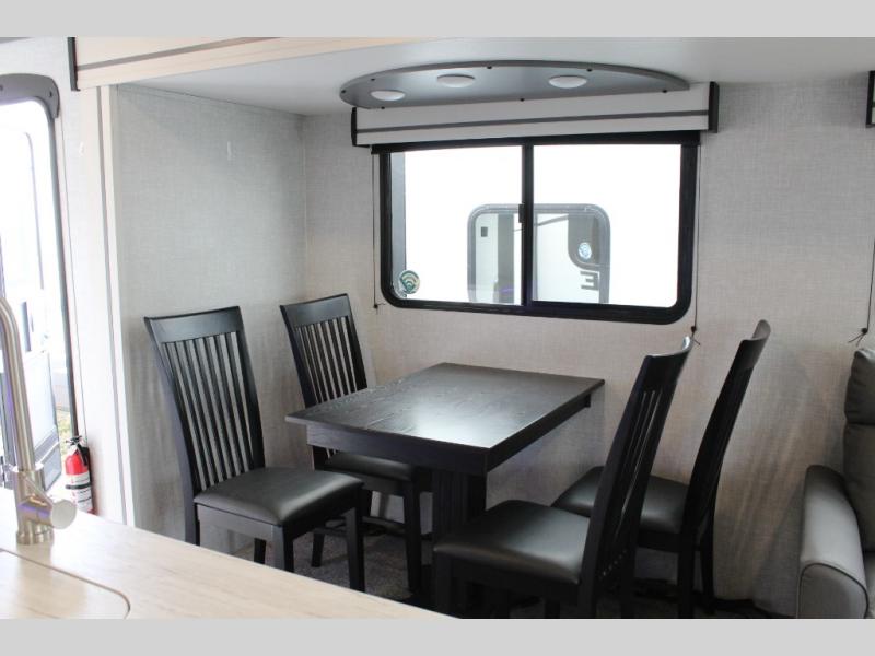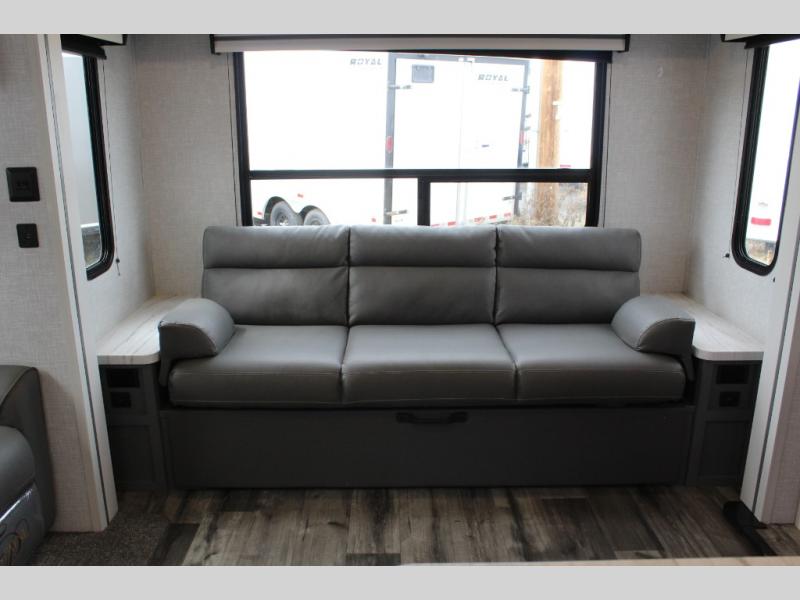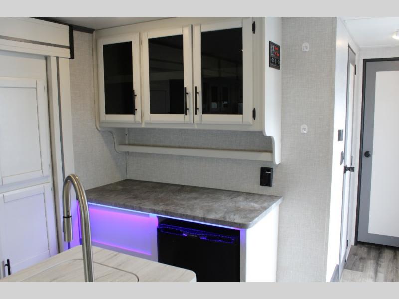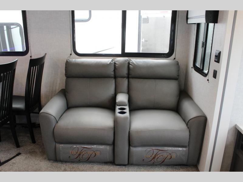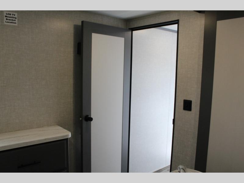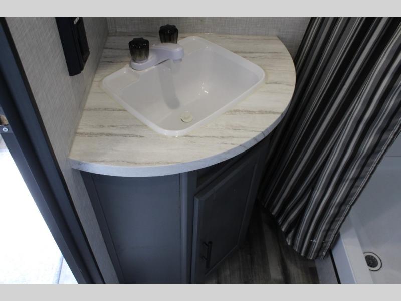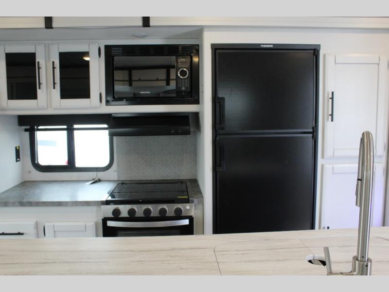 Whether you're relaxing on the theater seats, preparing a meal at the kitchen island, or taking a rest on the slide out king bed, you will enjoy every minute spent in this travel trailer. Your guests will love to sit at the stools around the kitchen island, or they can play a game around the U-shaped dinette. This model includes a hutch with a wine cooler to serve your guests, and the pantry can store snacks for everyone. When it's time to call it a night, the front private bedroom will feel just like home with its king bed and a large front wardrobe. There is even a space that has been prepped to add an optional washer and dryer if you choose!
