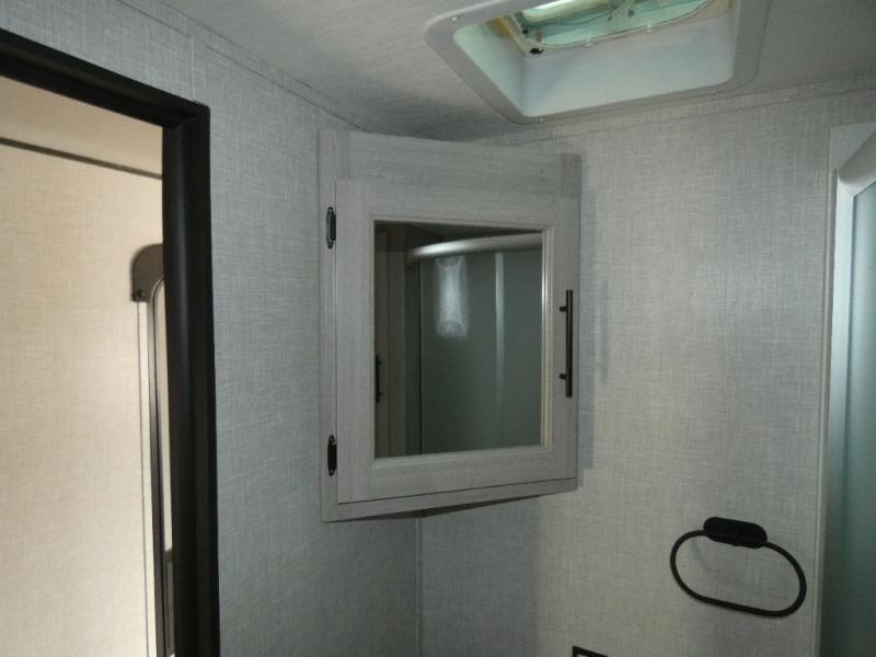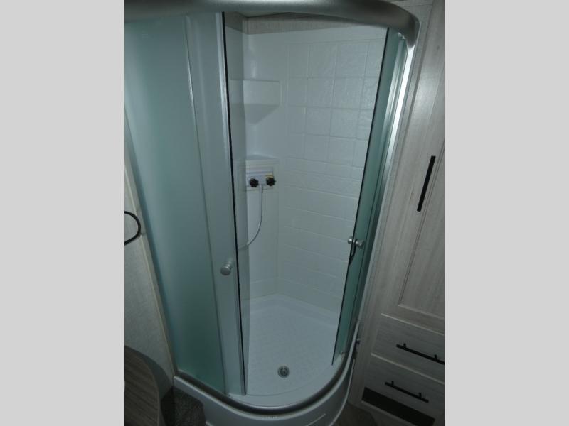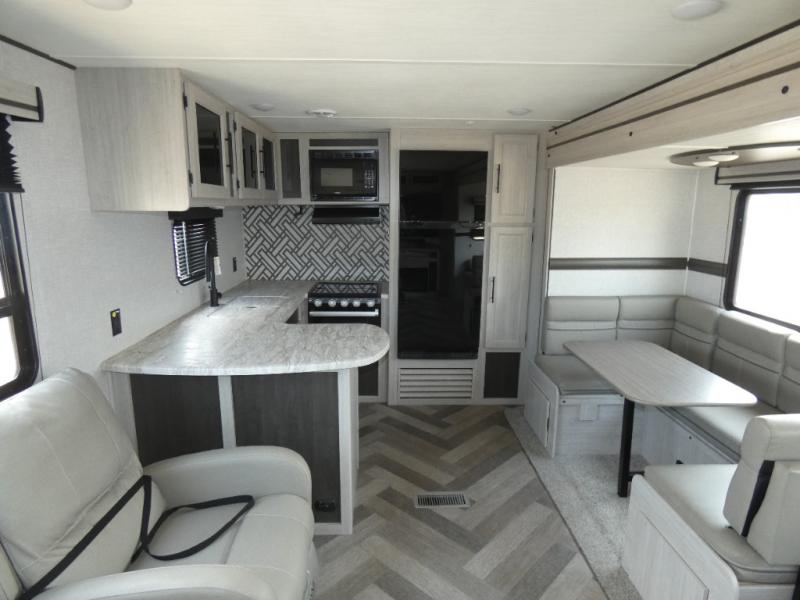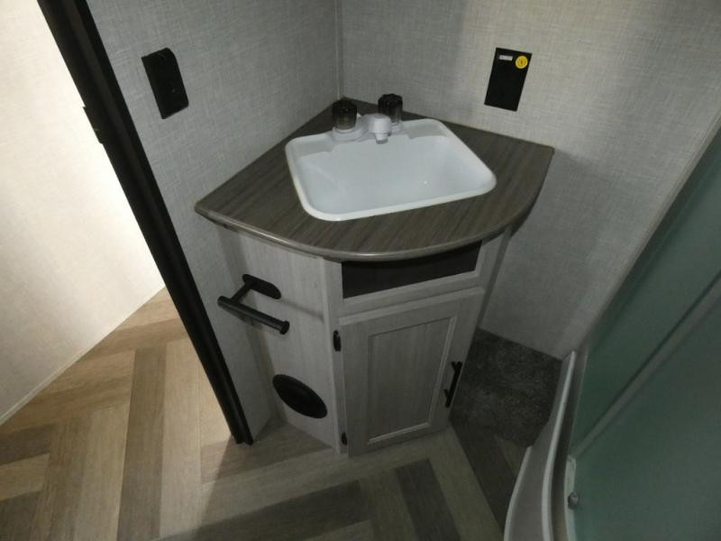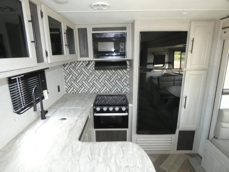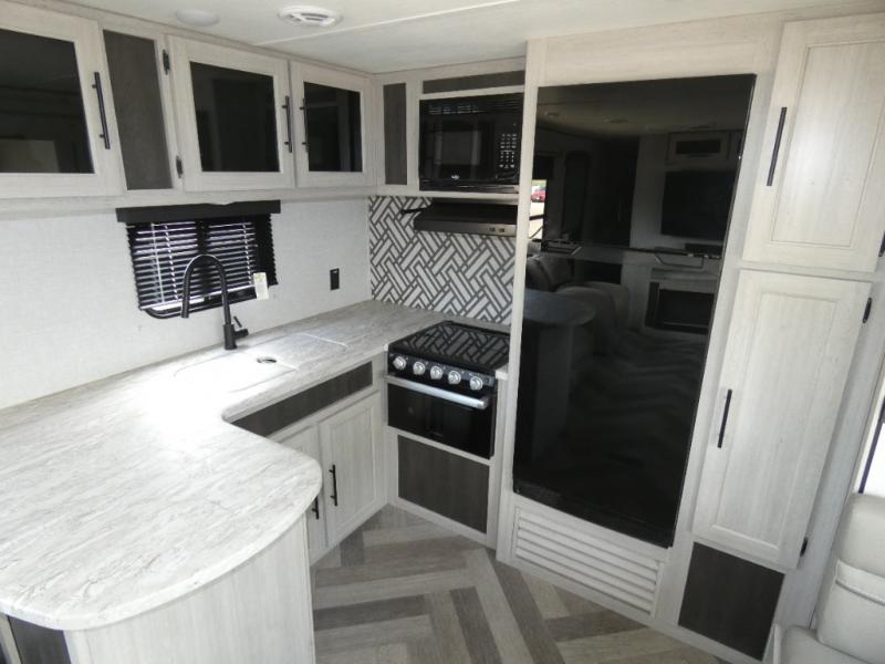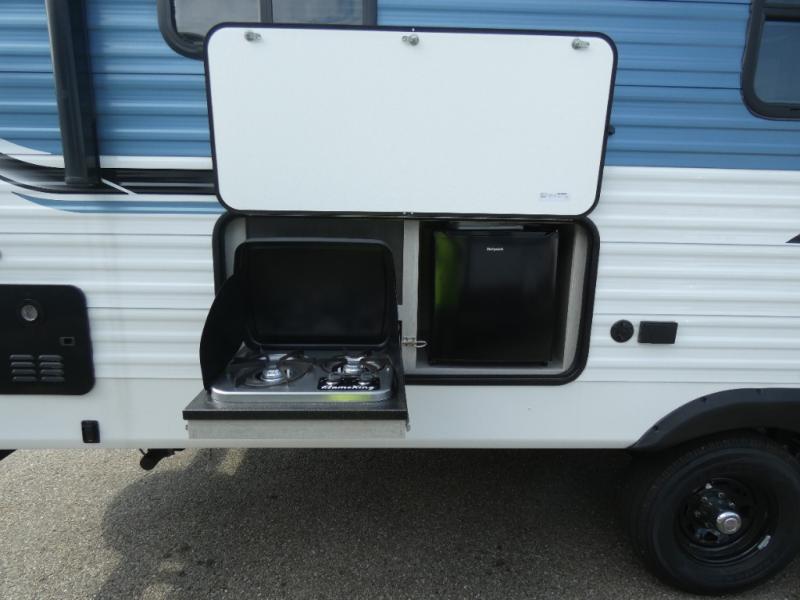 The chef of your group will love cooking in this rear kitchen travel trailer! It not only features a 10-cu. ft. refrigerator, an oven with an LED glass top, and a pressed countertop with a sink cover, but also a stainless steel sink with a stainless steel high-rise faucet and lots of counter space to prep your meals. While the chef is preparing dinner, you can socialize at the U-shaped dinette or 60" jackknife sofa slide while two others sit in the chairs with an end table in between to set a cup of coffee. There is even an outside kitchen, so you can take the fun outdoors while still cooking dinner. The full bathroom has a 34" radius shower with a linen closet next to it for you to grab a towel without dripping water all over the place. Head to the front private bedroom and grab your pajamas from one of the two shirt closets or even from the overhead cabinets above the 60" x 74" RV queen bed!
