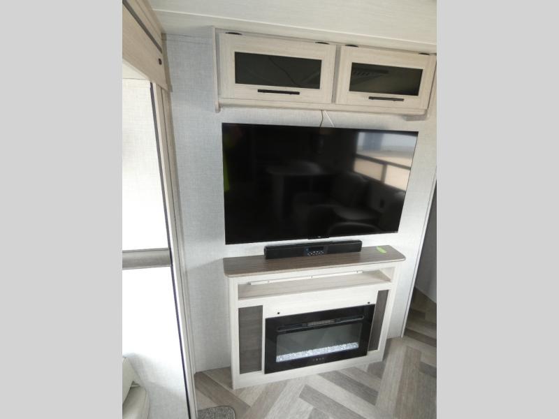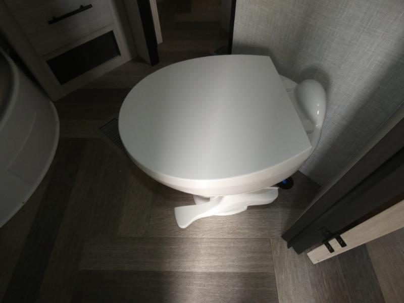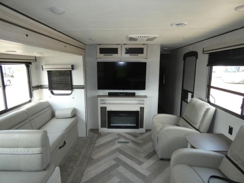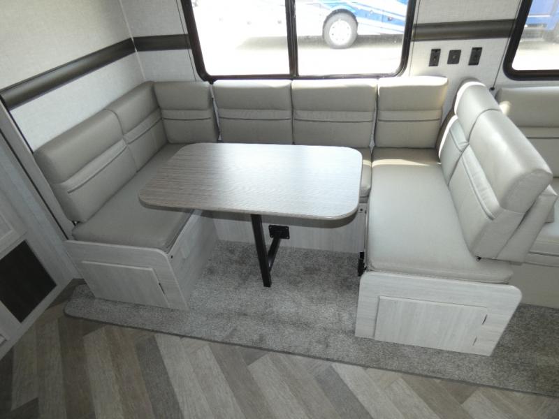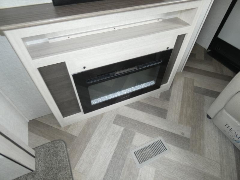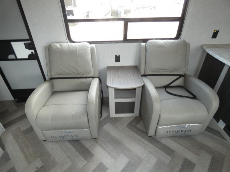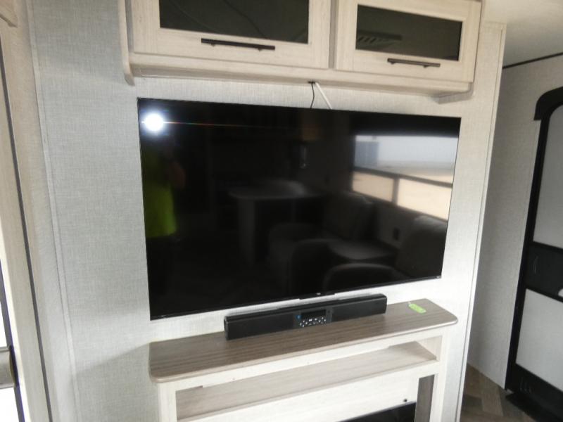 The chef of your group will love cooking in this rear kitchen travel trailer! It not only features a 10-cu. ft. refrigerator, an oven with an LED glass top, and a pressed countertop with a sink cover, but also a stainless steel sink with a stainless steel high-rise faucet and lots of counter space to prep your meals. While the chef is preparing dinner, you can socialize at the U-shaped dinette or 60" jackknife sofa slide while two others sit in the chairs with an end table in between to set a cup of coffee. There is even an outside kitchen, so you can take the fun outdoors while still cooking dinner. The full bathroom has a 34" radius shower with a linen closet next to it for you to grab a towel without dripping water all over the place. Head to the front private bedroom and grab your pajamas from one of the two shirt closets or even from the overhead cabinets above the 60" x 74" RV queen bed!