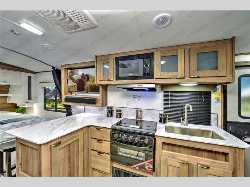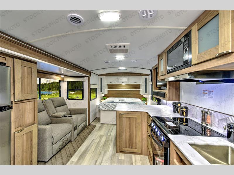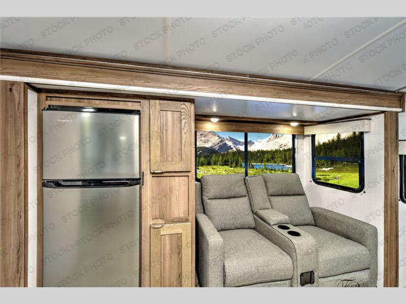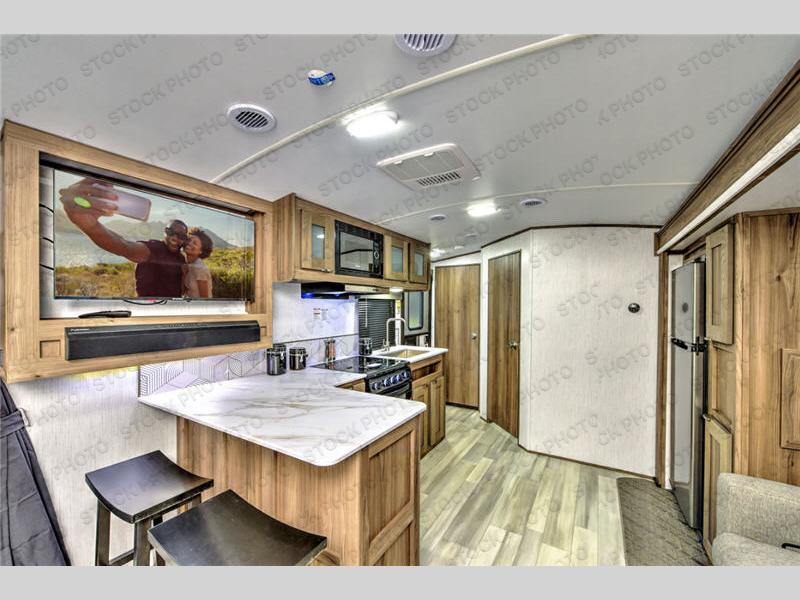 This is the perfect couple's trailer with space for an overnight guest on the sofa within the large slide out. You will enjoy the sliding king bed in the front bedroom, plus there are dual wardrobes for your clothes. The kitchen includes a counter with two stools for breakfast in the morning, two pantries, plus a 10.7 cu. ft. double door refrigerator. A rear corner full bath on board allows you to freshen up each day, and the exterior full belly storage system will be great for fishing poles, lawn chairs, and luggage!