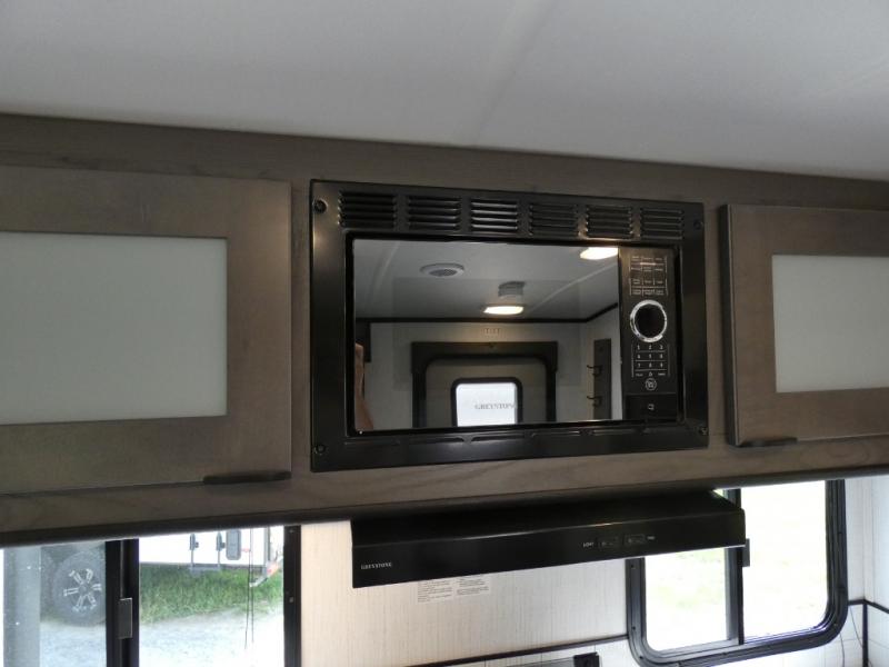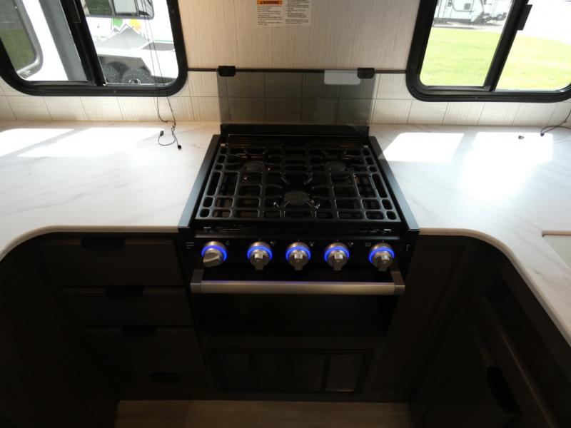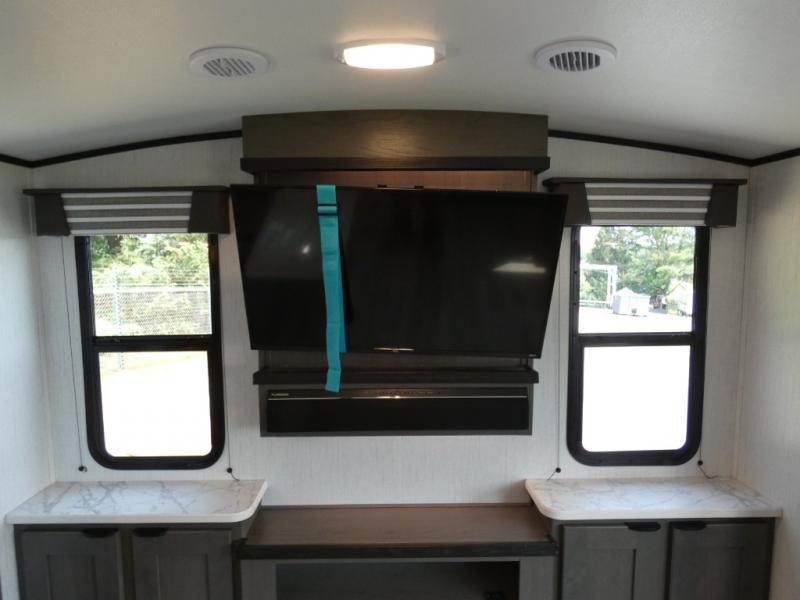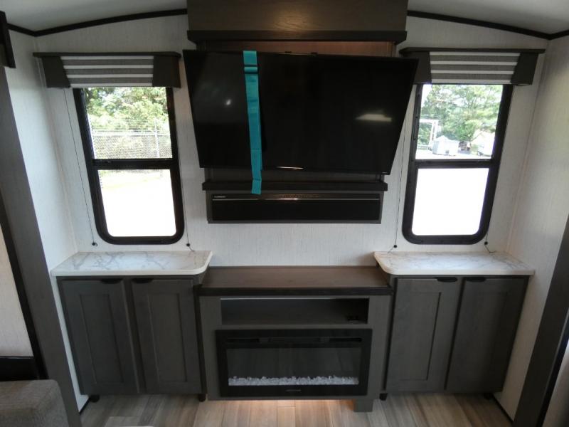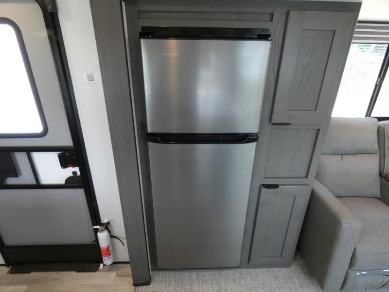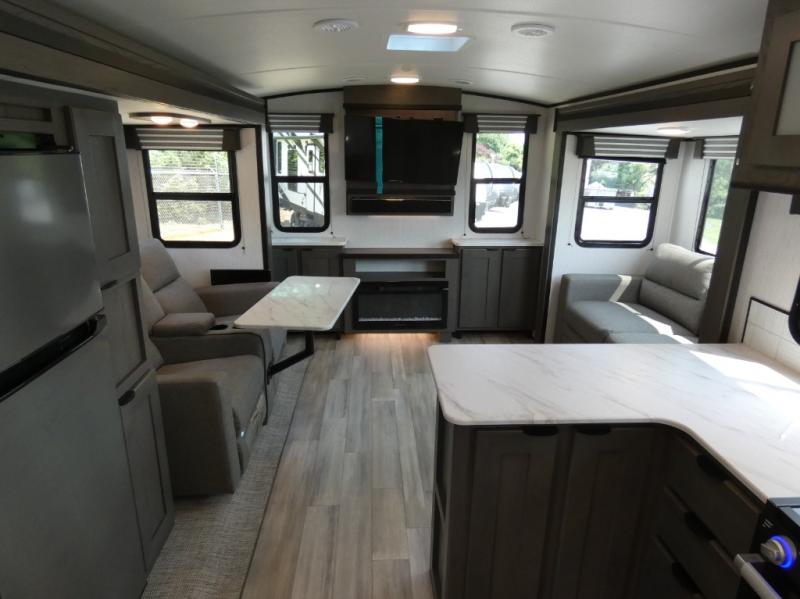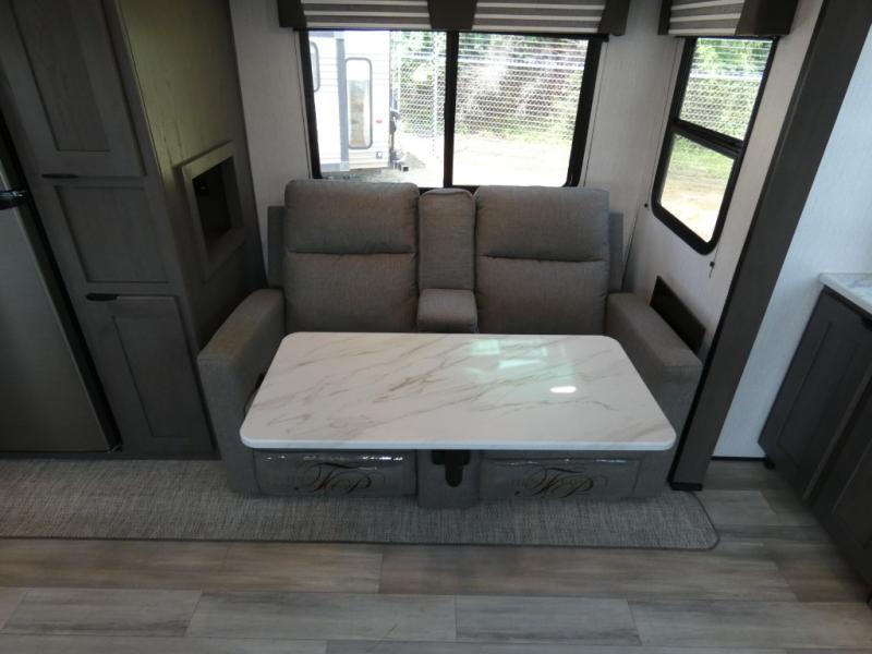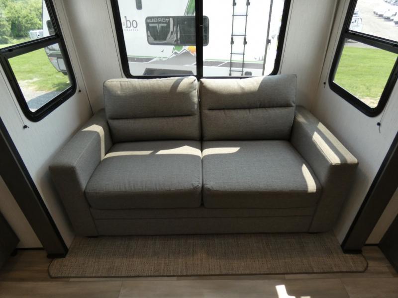 This model will feel just like home with its spacious living area and front private bedroom. There is a rear entertainment center, and you can add the optional LED TV here for movie nights. Your crew can visit on the two sofas, plus one sofa includes a table where you can play a game of cards or dine together. The chef will love the kitchen that includes tons of counter space, a three burner cooktop, plus a 10.7 cu. ft. double door refrigerator. And don't overlook the walk-through bath and front master bedroom!