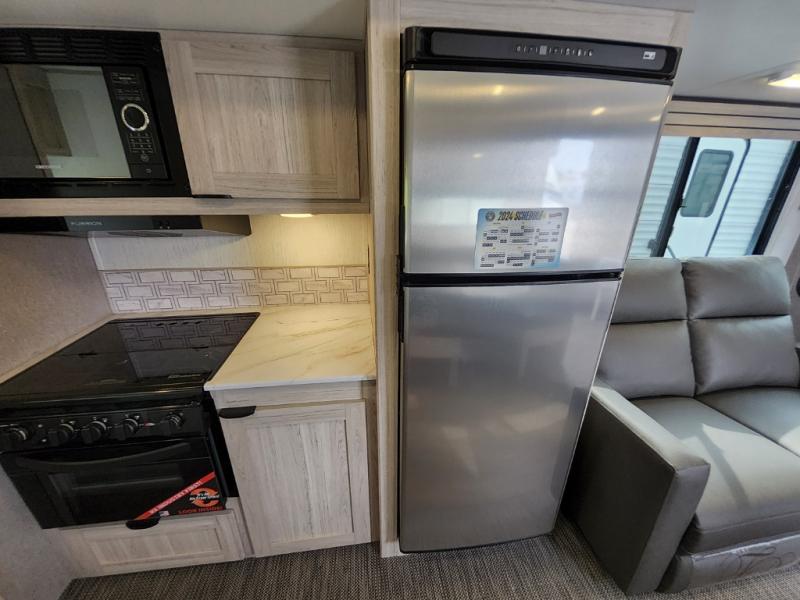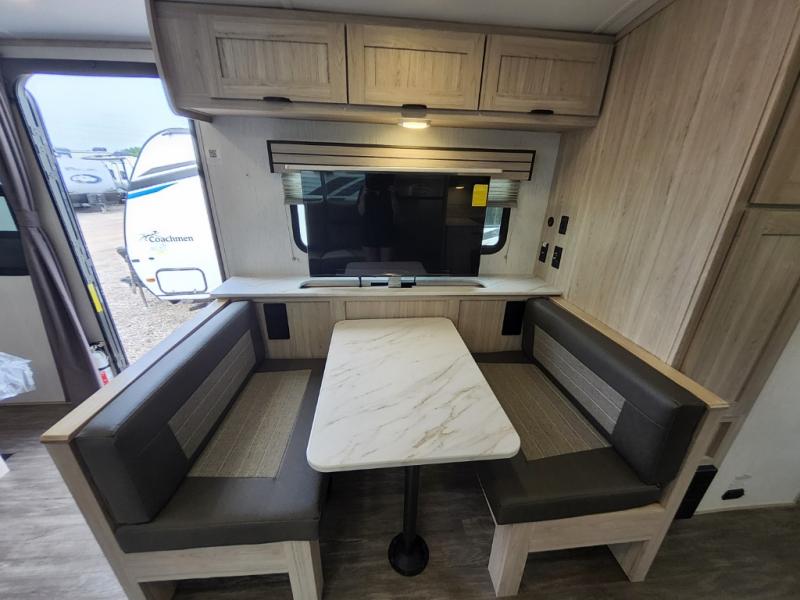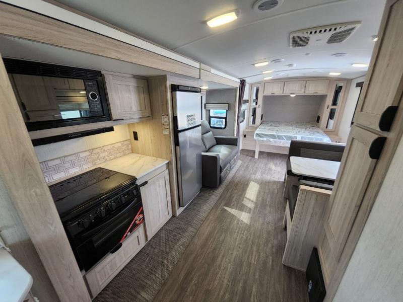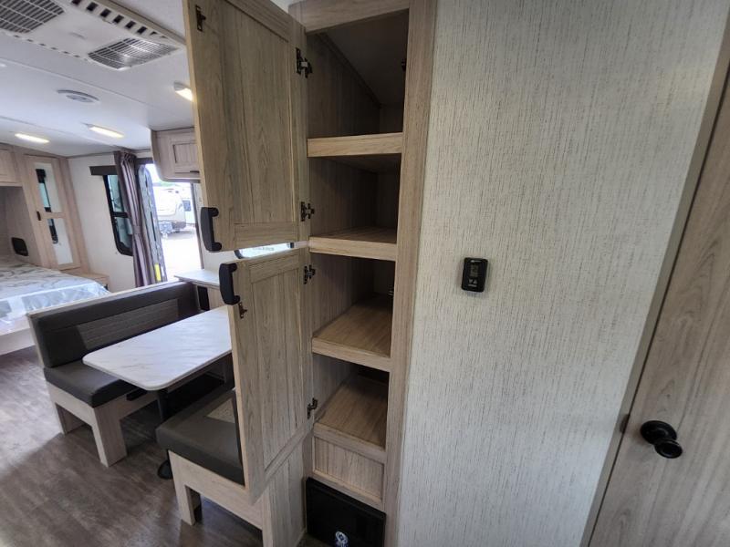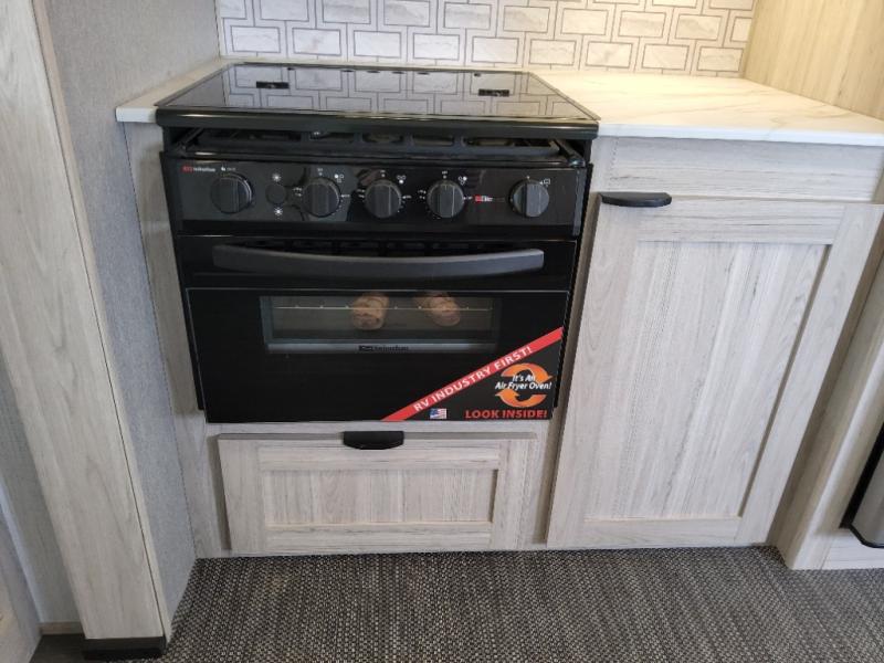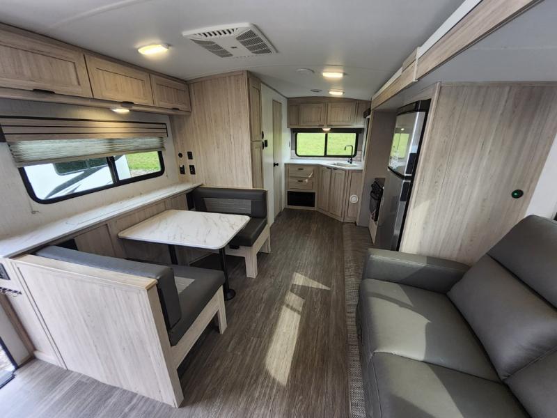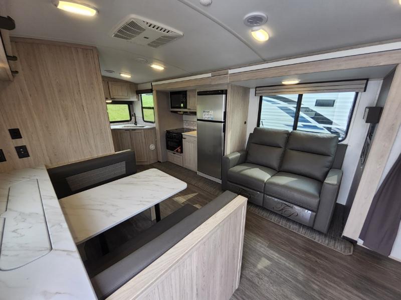 You will have everything you need for a comfortable weekend getaway with this travel trailer! Up front there is a patent pending king bed sliding system with an industry first pet palace with cruise-thru and an under-bed storage design, as well as wardrobes and a privacy curtain to draw at night. The kitchen has a three burner cooktop to fry up some eggs, a 10.7 cu. ft. refrigerator to keep your perishables fresh, and seamless edge countertops for enhanced durability. The booth dinette offers a comfortable place to enjoy your meals and also can transform into an extra sleeping space for a guest or two depending on their size.