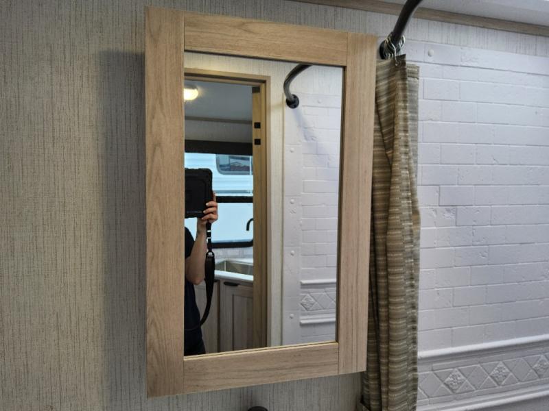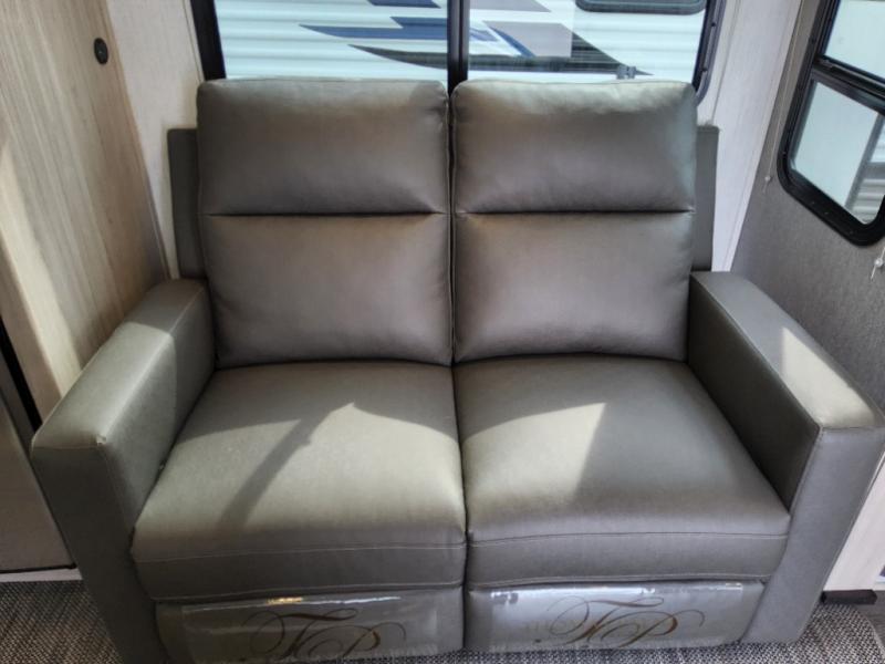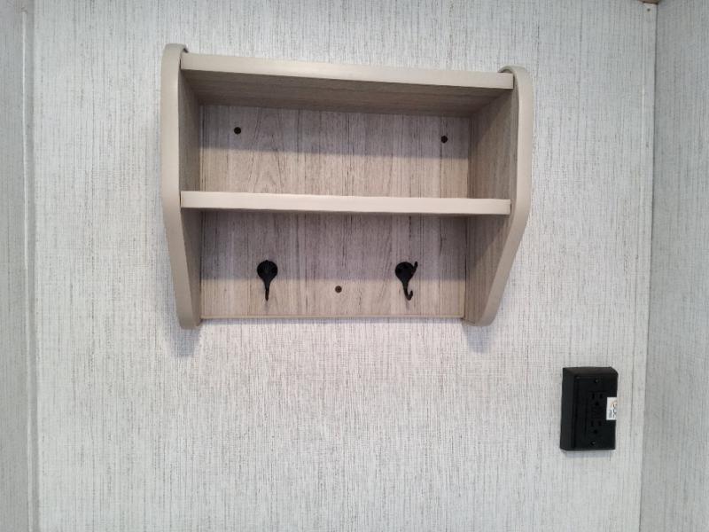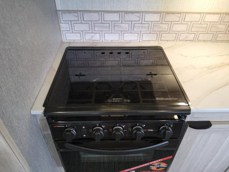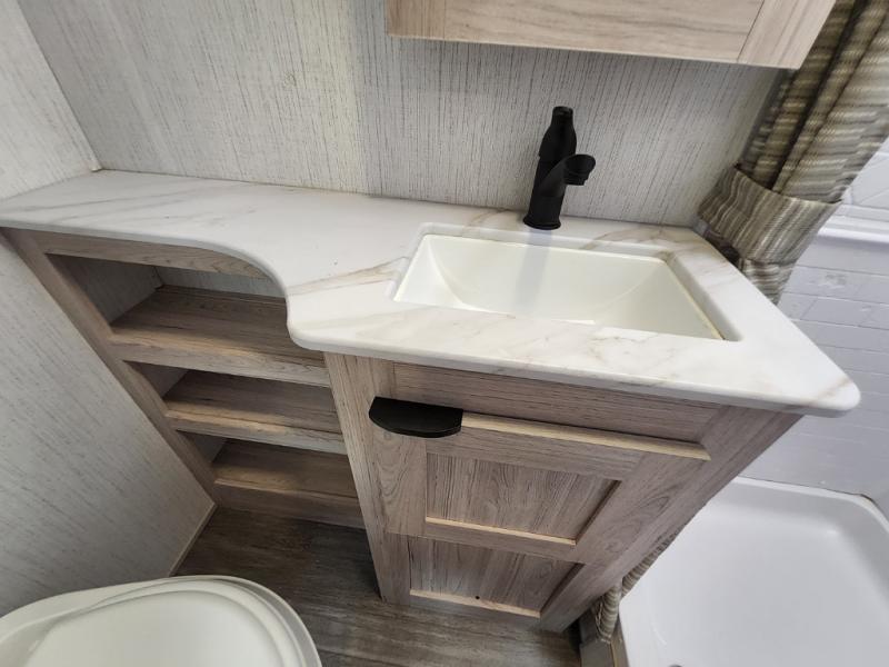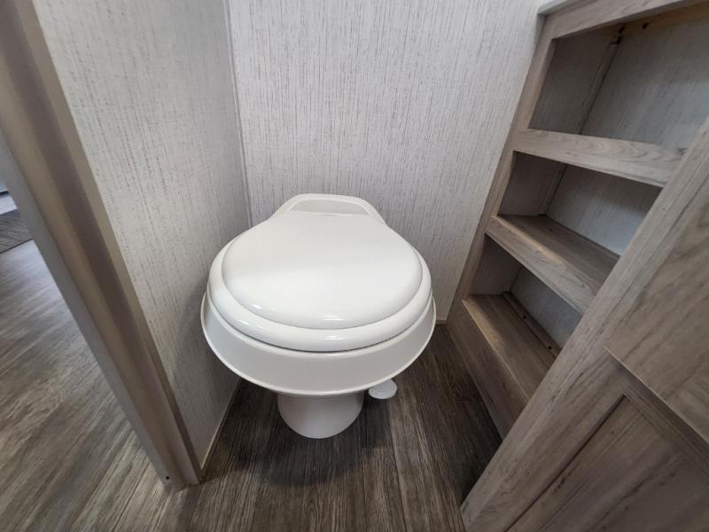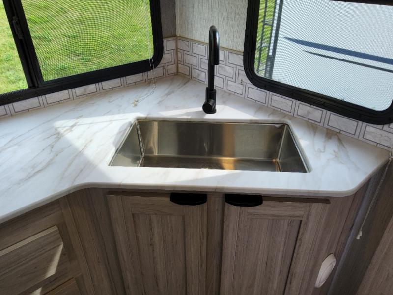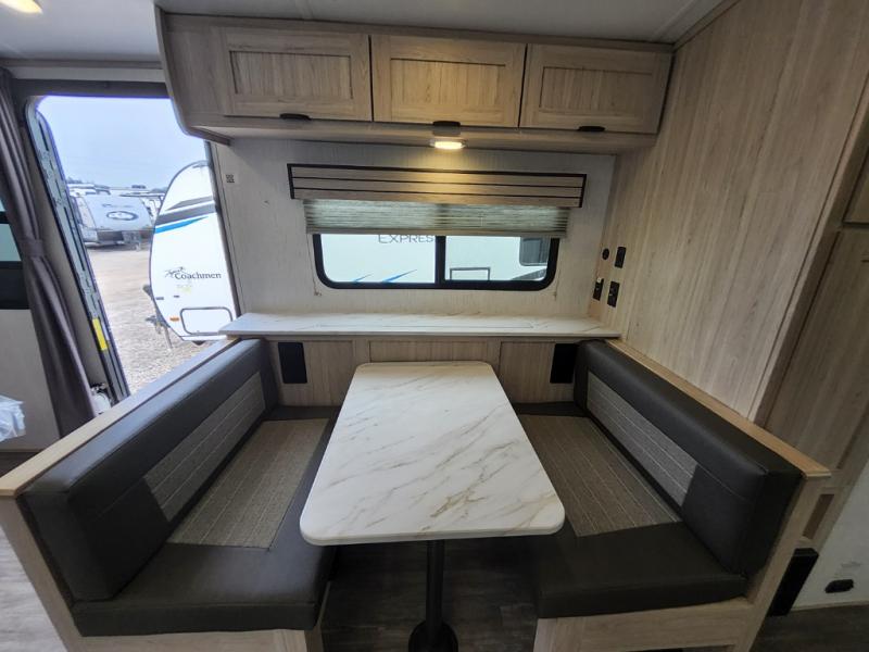 You will have everything you need for a comfortable weekend getaway with this travel trailer! Up front there is a patent pending king bed sliding system with an industry first pet palace with cruise-thru and an under-bed storage design, as well as wardrobes and a privacy curtain to draw at night. The kitchen has a three burner cooktop to fry up some eggs, a 10.7 cu. ft. refrigerator to keep your perishables fresh, and seamless edge countertops for enhanced durability. The booth dinette offers a comfortable place to enjoy your meals and also can transform into an extra sleeping space for a guest or two depending on their size.
