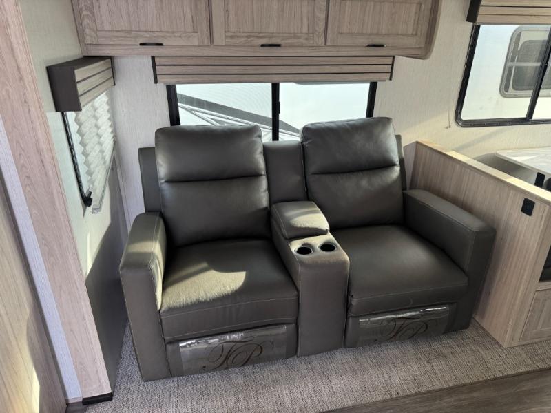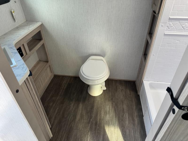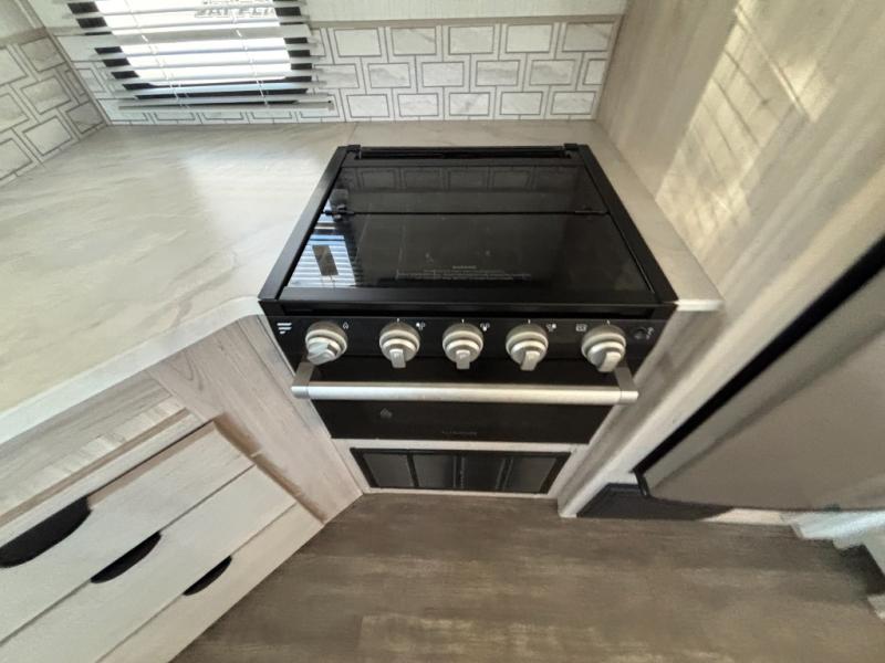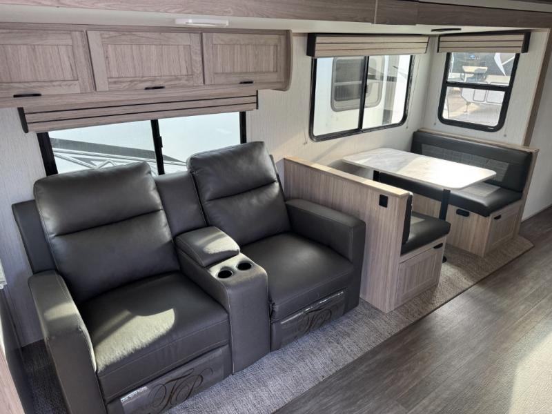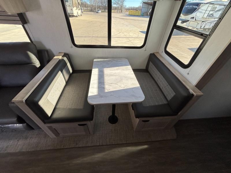 Enjoy a relaxing vacation at the campgrounds with this travel trailer! The full rear bathroom has a full shower for you to rinse the sand out of your hair each day and extra countertop space to set your items. Your bellies will stay full with a walk-in pantry to store your canned goods and snacks, and a three burner cooktop to fry up some bacon. The sofa and booth dinette slide opens up the living/kitchen area while offering comfortable places to dine and socialize, plus they can even transform into extra sleeping spaces. The front private bedroom has a queen bed with wardrobes on either side so you can enjoy a good night's rest!