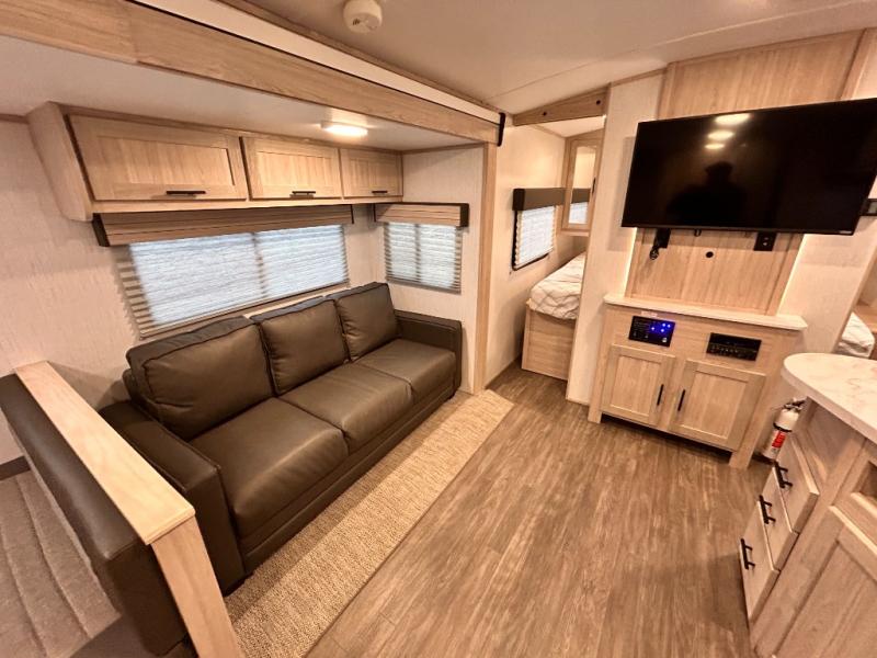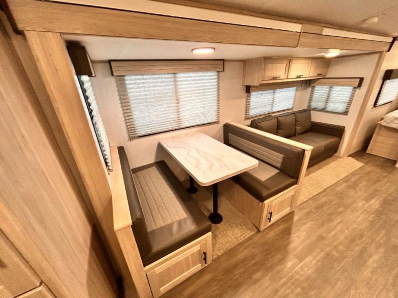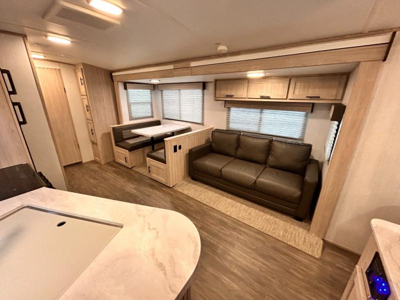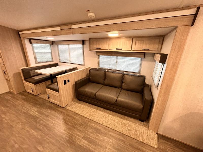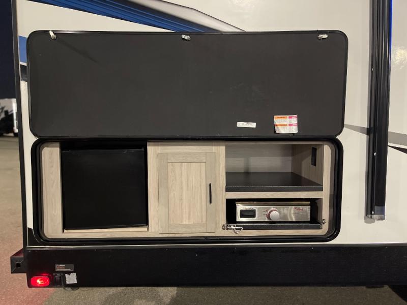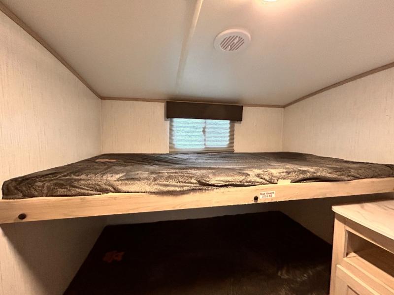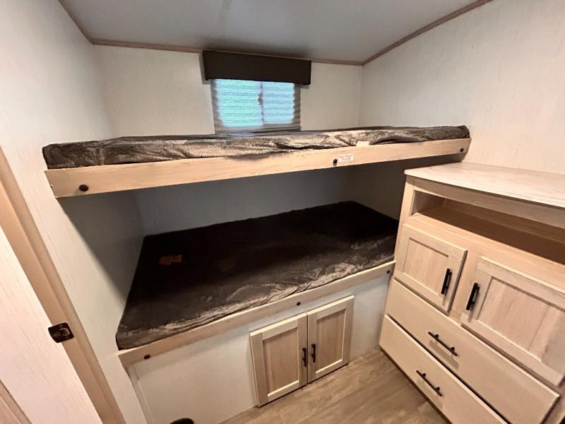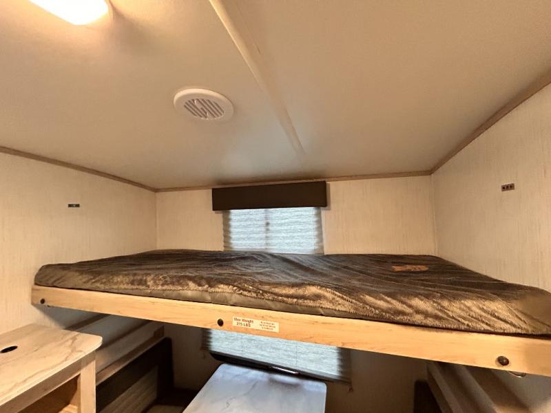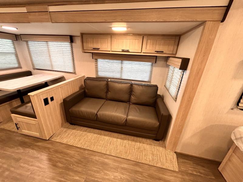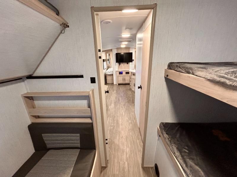 The kids or guests will love having their own privacy with the rear private bunkhouse in this travel trailer! The bunkhouse has a set of double bunk beds and a bunk above a dinette. The chef can prepare their best meals either indoors with the three burner cooktop or head to the outside kitchen and grill some burgers on the griddle. The sofa and booth dinette slide creates more walking around space, comfortable places to eat and socialize, and even extra sleeping spaces. The front private bedroom has a queen bed with wardrobes on either side to keep your clothes looking nice!