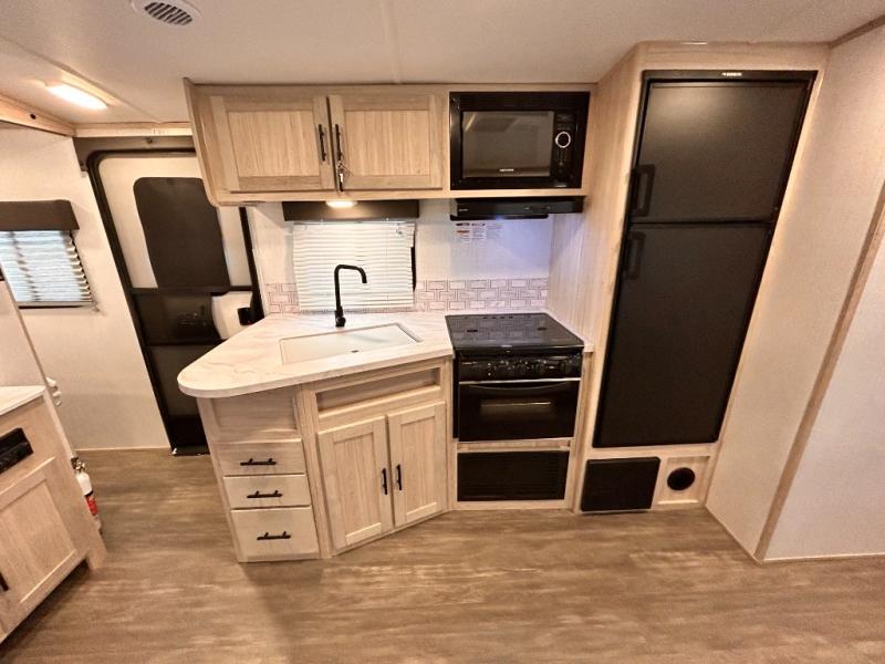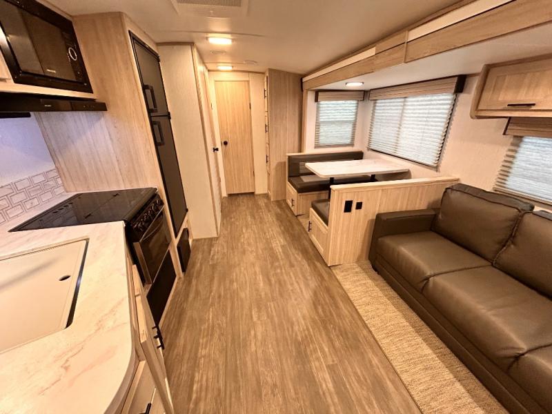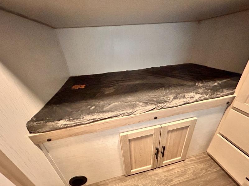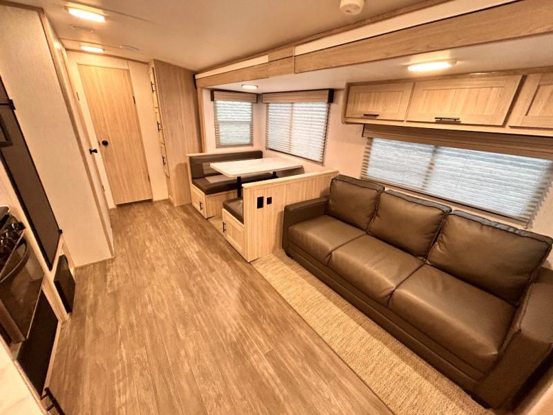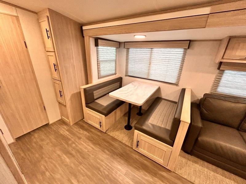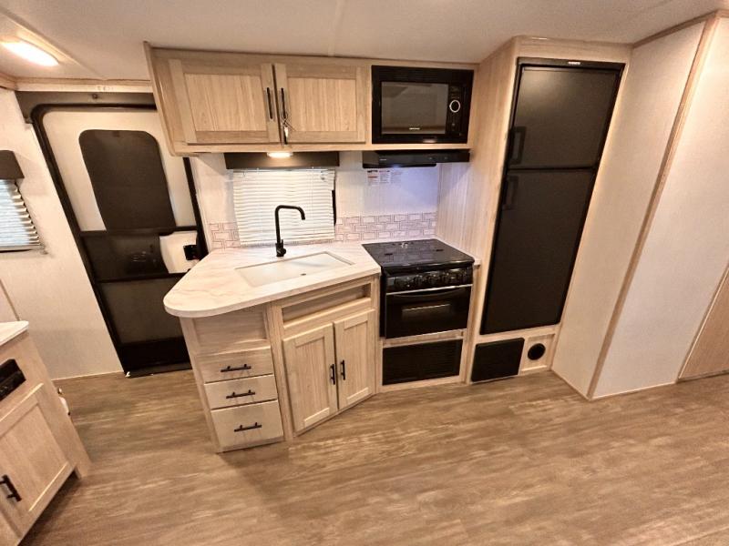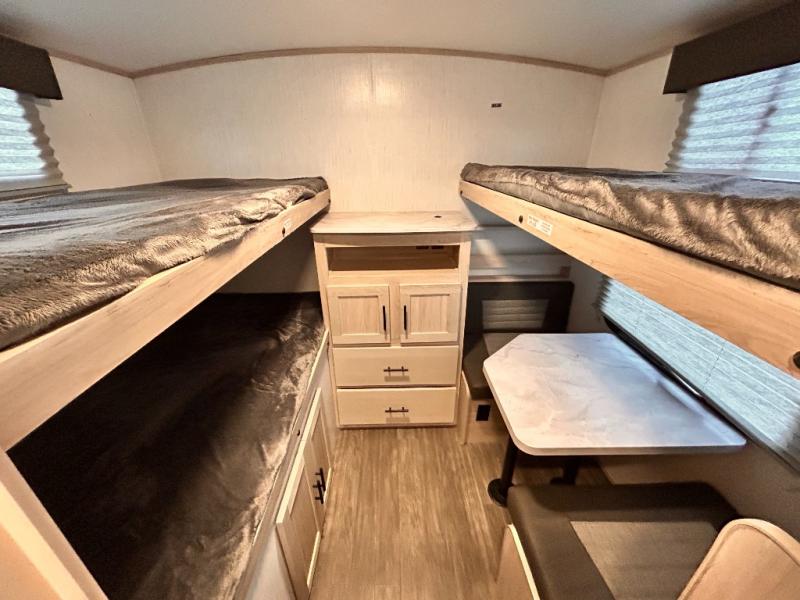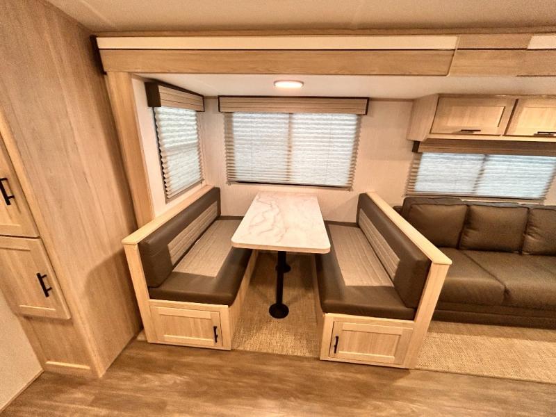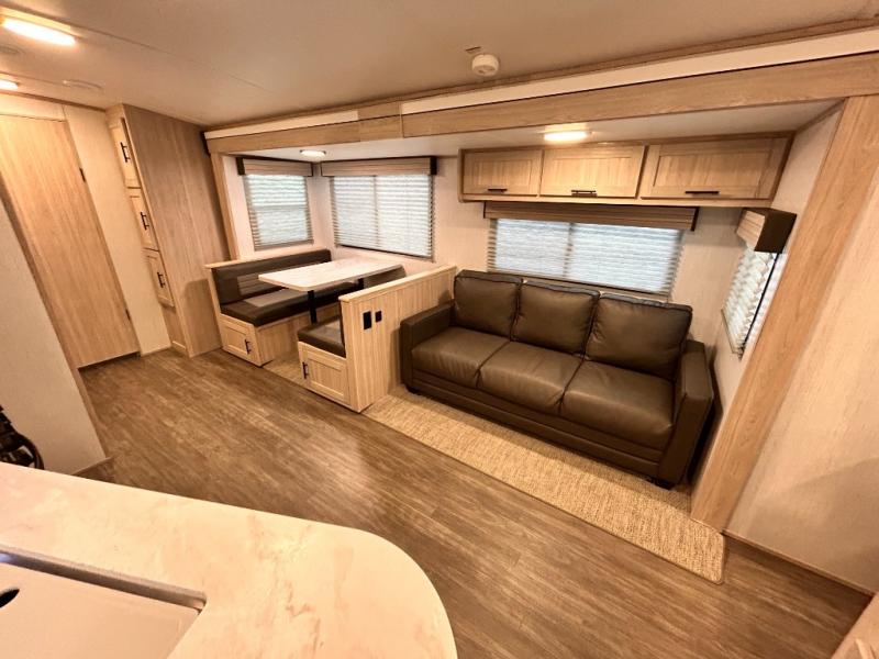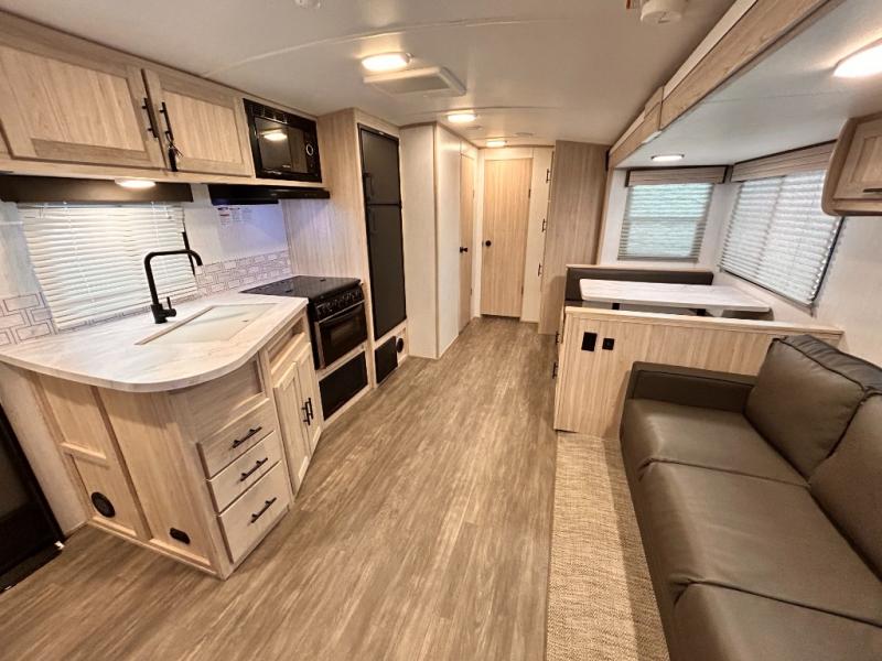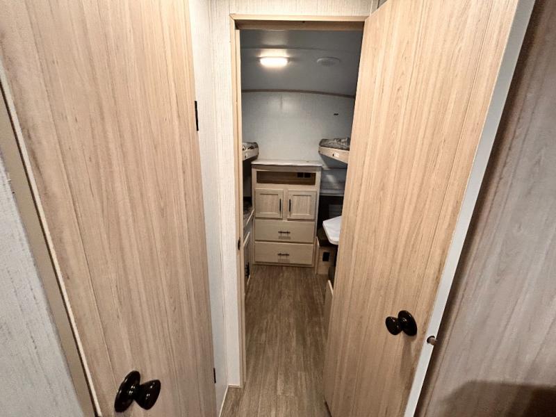 The kids or guests will love having their own privacy with the rear private bunkhouse in this travel trailer! The bunkhouse has a set of double bunk beds and a bunk above a dinette. The chef can prepare their best meals either indoors with the three burner cooktop or head to the outside kitchen and grill some burgers on the griddle. The sofa and booth dinette slide creates more walking around space, comfortable places to eat and socialize, and even extra sleeping spaces. The front private bedroom has a queen bed with wardrobes on either side to keep your clothes looking nice!