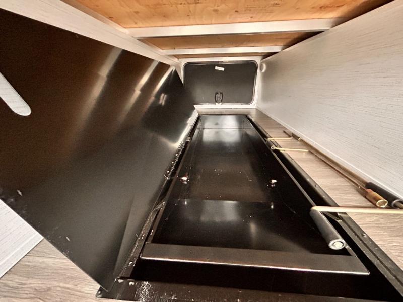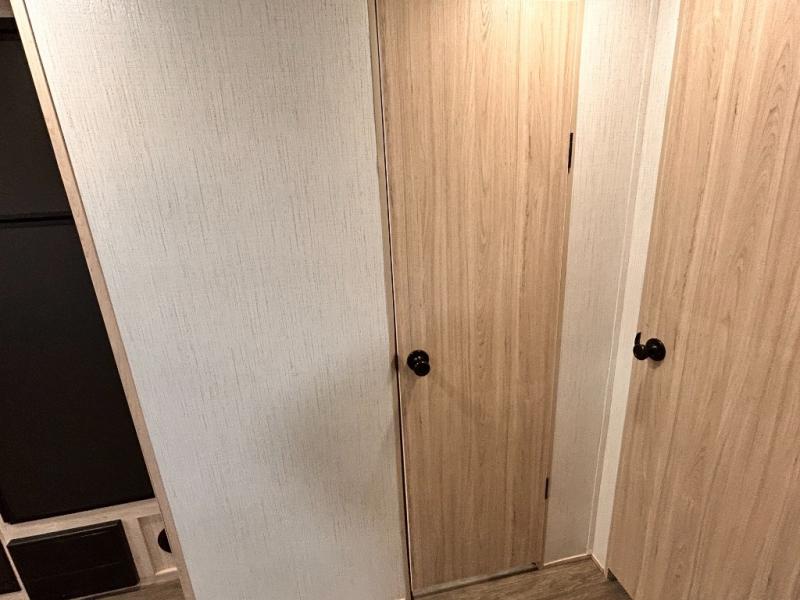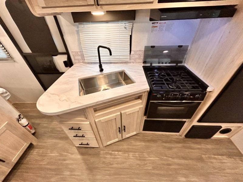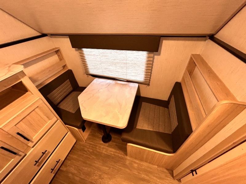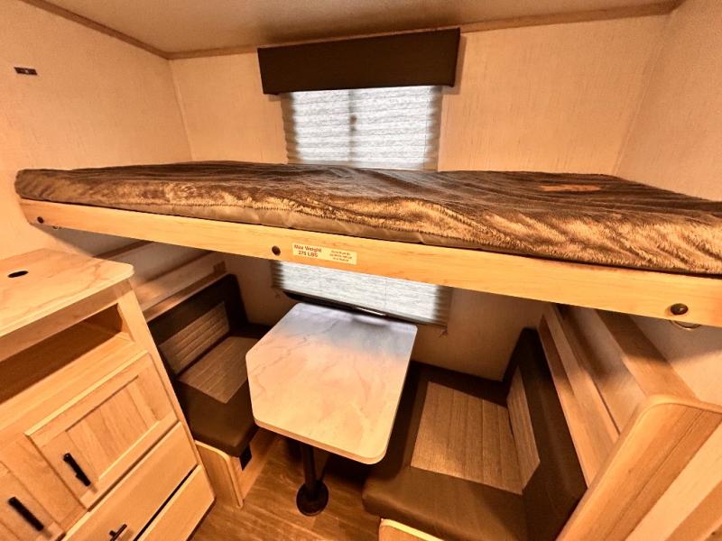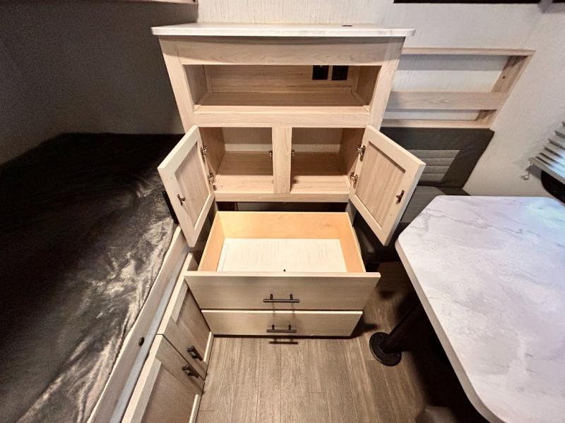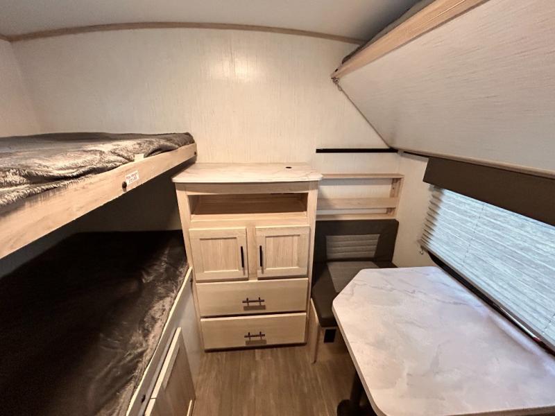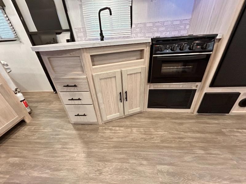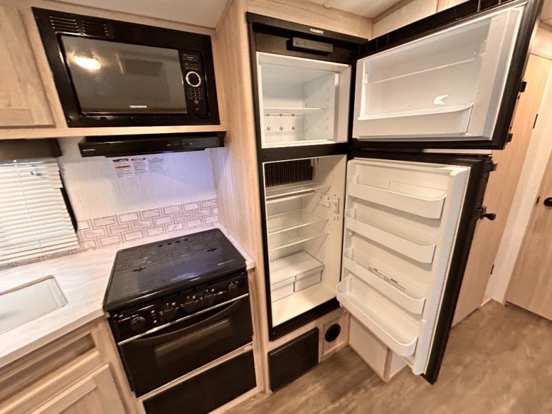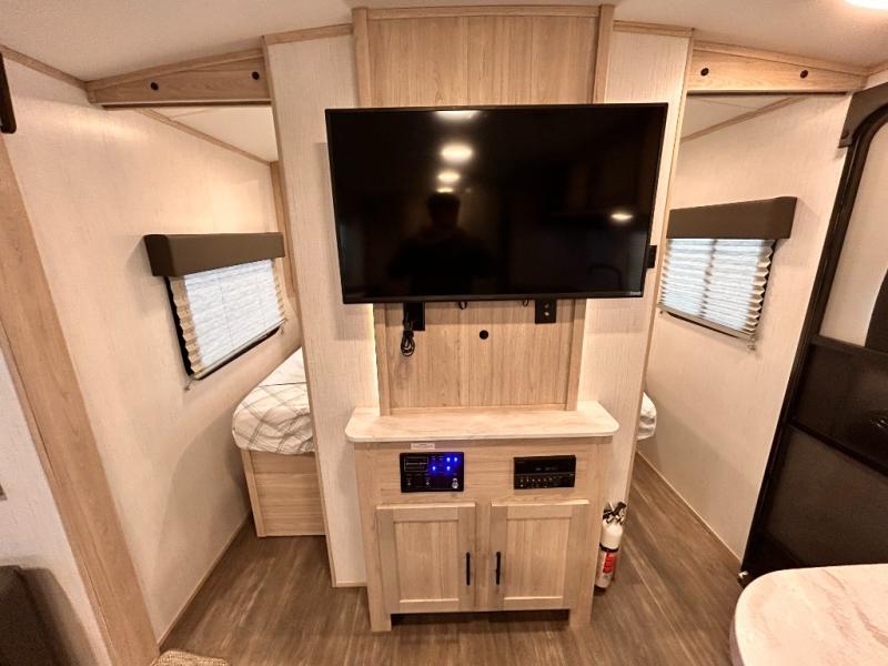 The kids or guests will love having their own privacy with the rear private bunkhouse in this travel trailer! The bunkhouse has a set of double bunk beds and a bunk above a dinette. The chef can prepare their best meals either indoors with the three burner cooktop or head to the outside kitchen and grill some burgers on the griddle. The sofa and booth dinette slide creates more walking around space, comfortable places to eat and socialize, and even extra sleeping spaces. The front private bedroom has a queen bed with wardrobes on either side to keep your clothes looking nice!