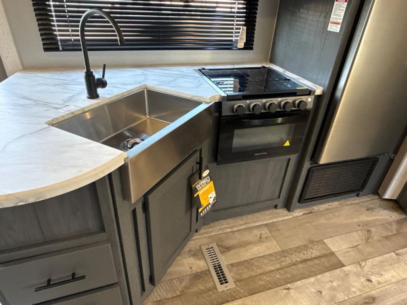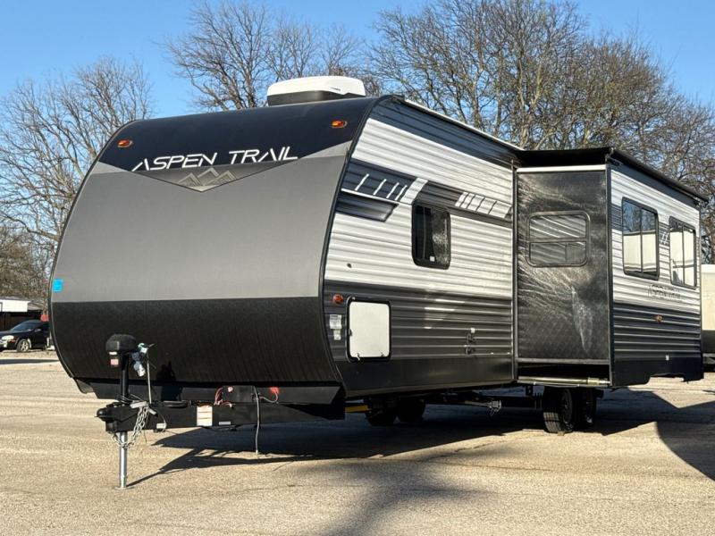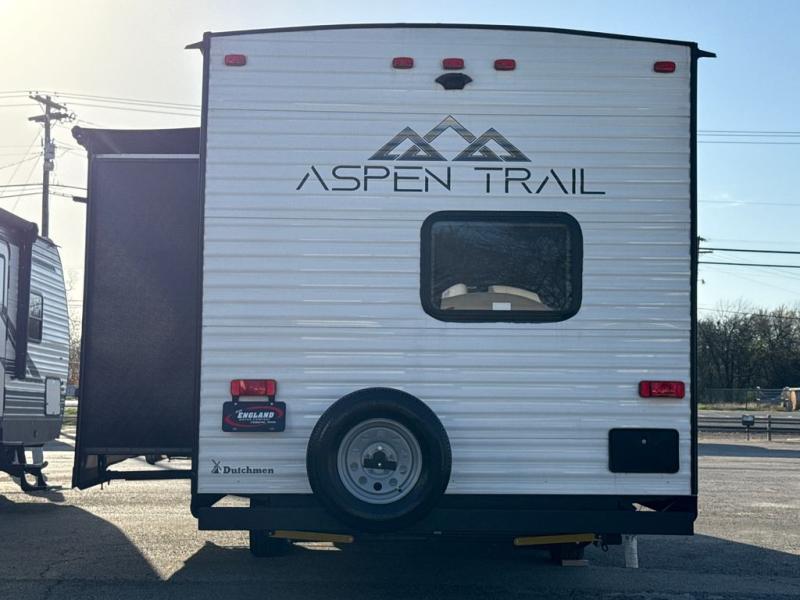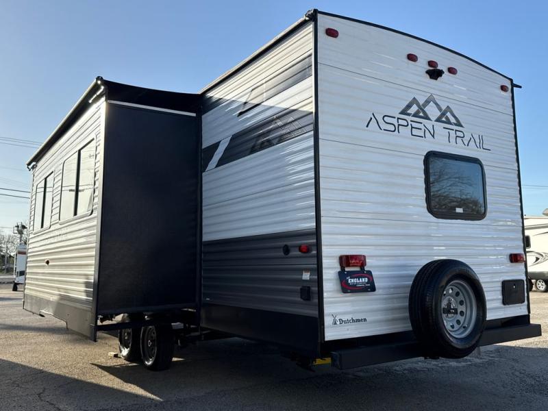 You will find more standard features and more value in each one of these Dutchmen RV Aspen Trail travel trailers! There is a smooth metal front end, diamond plate rock guard, a backup camera, plus many more exterior features. Experience all of the power with power stabilizers, a power awning, and a power tongue jack for easy setting up and breaking down. The fully enclosed underbelly provides an extra layer of protection for your unit's vitals so you can camp further into the year. With aluminum steps at the main entry, you will have a solid platform of stability as you enter and exit, plus they are easy to expand or store away. And the hardwood cabinetry throughout, roller shades, and seamless countertops will have you feeling right at home!