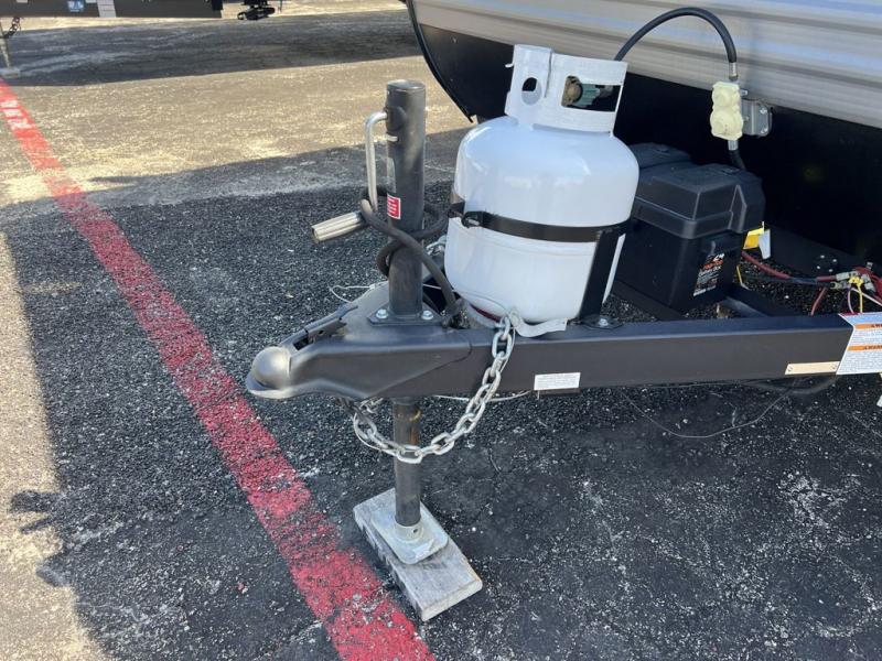 This compact trailer gives you all the conveniences you need while camping, plus comfort! The front queen bed, the bunk beds and the booth dinette offer sleeping space for five, the toilet and shower room offer privacy and a great place to change clothes, and the galley kitchen offers a two burner range top to make meals, a 3.3 cu. ft. refrigerator for cold items, and galley sink with high rise faucet. You can also enjoy the power awning with LED light when wanting some fresh air and protection from the sun.