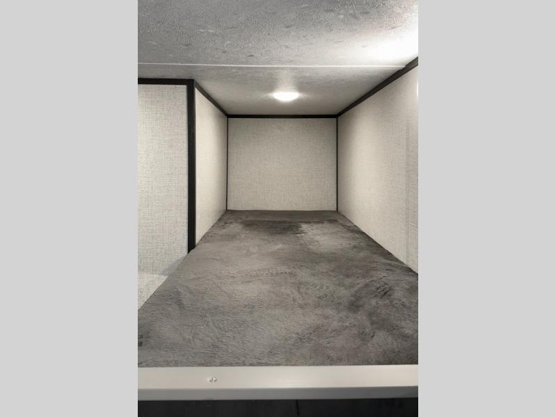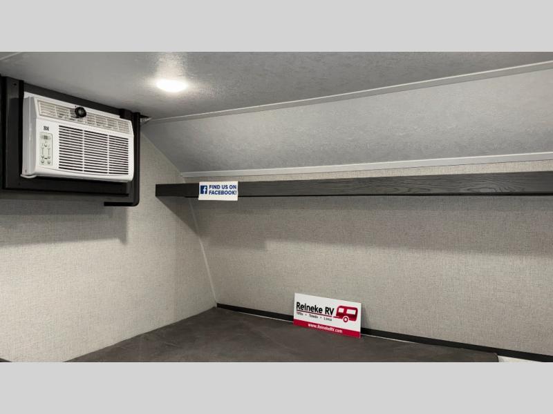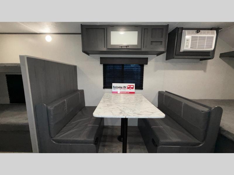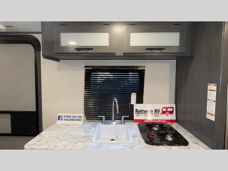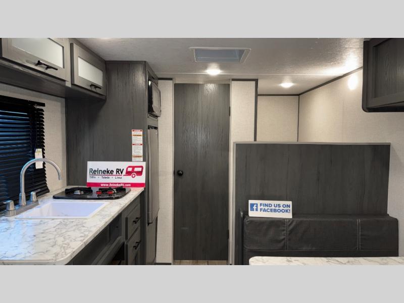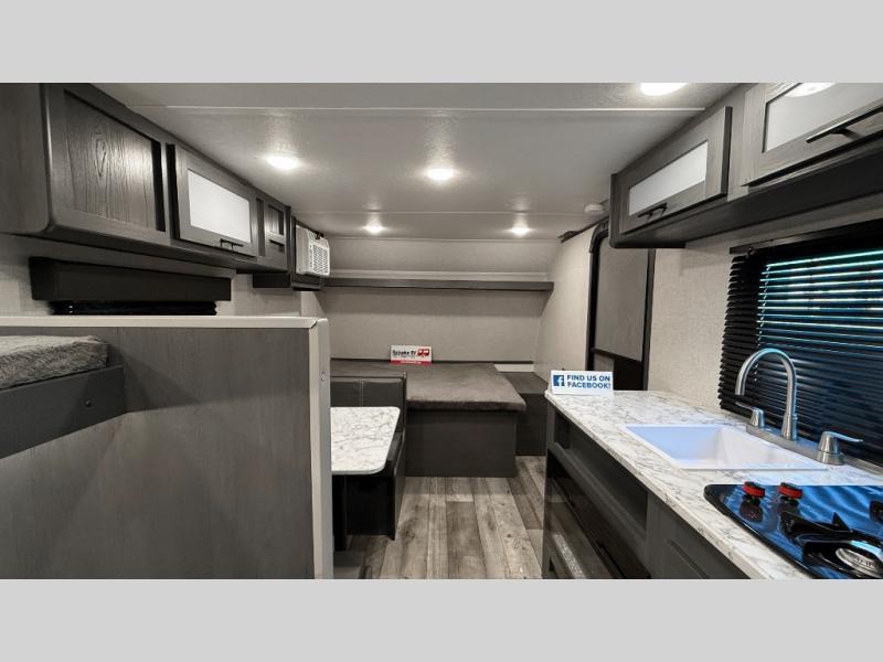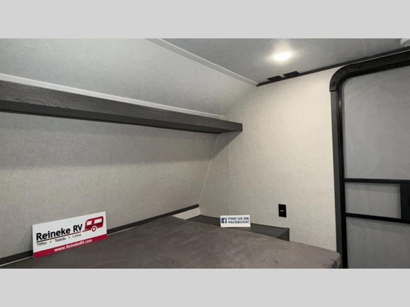 This compact trailer gives you all the conveniences you need while camping, plus comfort! The front queen bed, the bunk beds and the booth dinette offer sleeping space for five, the toilet and shower room offer privacy and a great place to change clothes, and the galley kitchen offers a two burner range top to make meals, a 3.3 cu. ft. refrigerator for cold items, and galley sink with high rise faucet. You can also enjoy the power awning when wanting some fresh air and protection from the sun.
