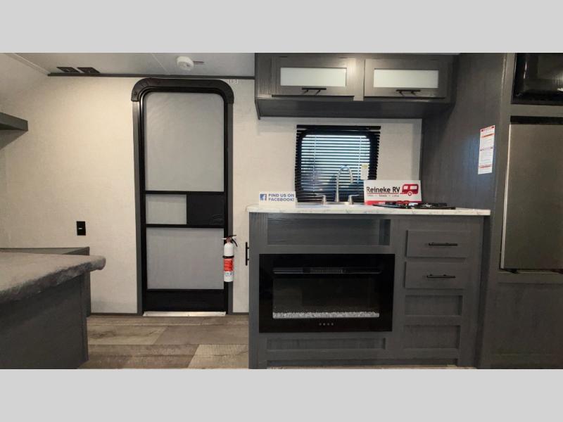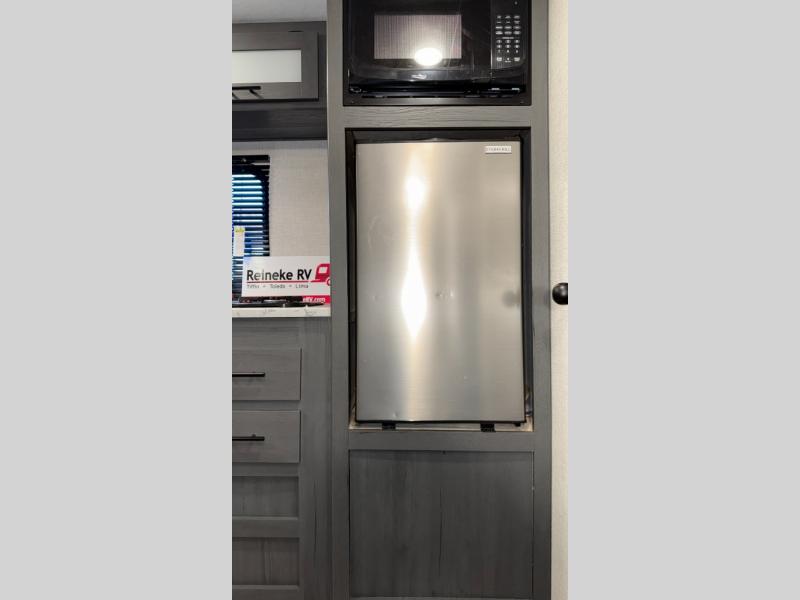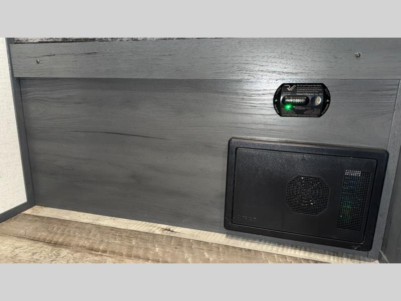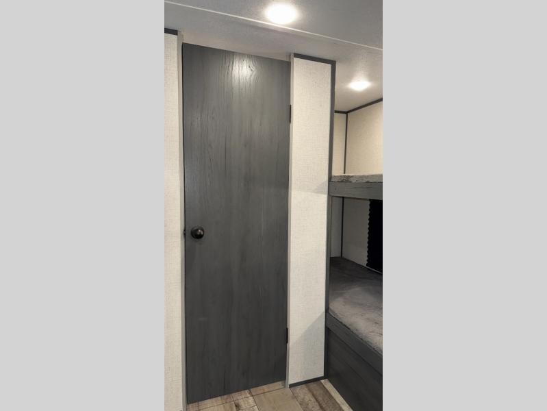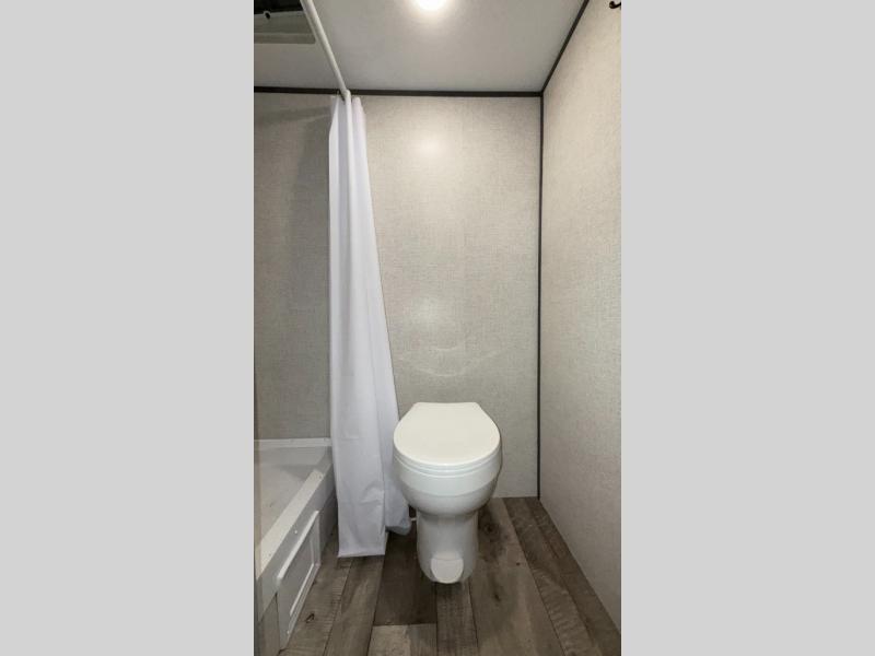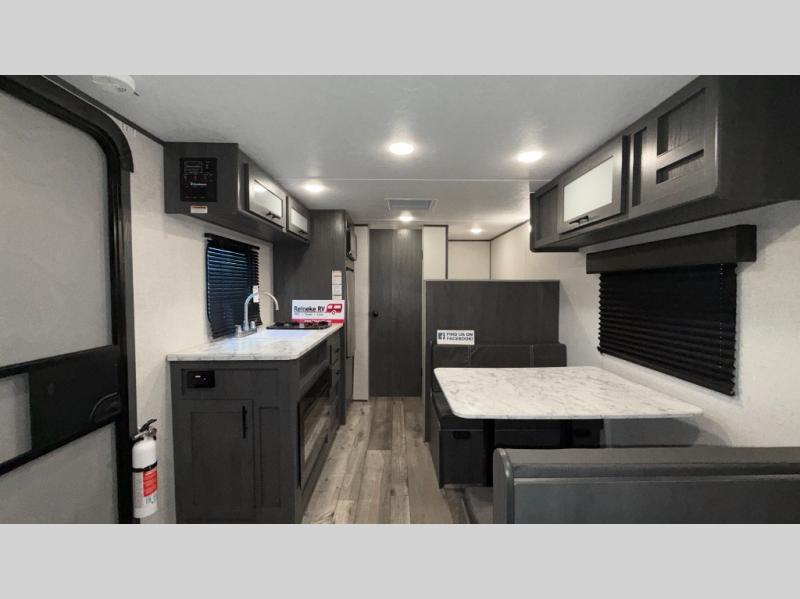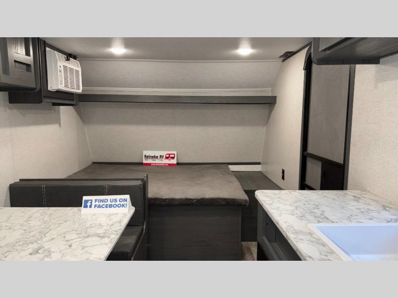 This compact trailer gives you all the conveniences you need while camping, plus comfort! The front queen bed, the bunk beds and the booth dinette offer sleeping space for five, the toilet and shower room offer privacy and a great place to change clothes, and the galley kitchen offers a two burner range top to make meals, a 3.3 cu. ft. refrigerator for cold items, and galley sink with high rise faucet. You can also enjoy the power awning when wanting some fresh air and protection from the sun.