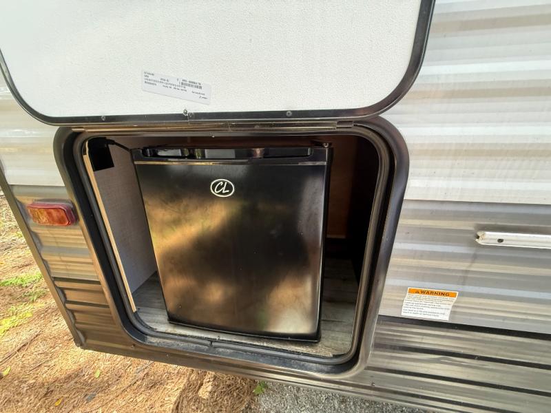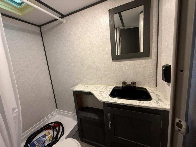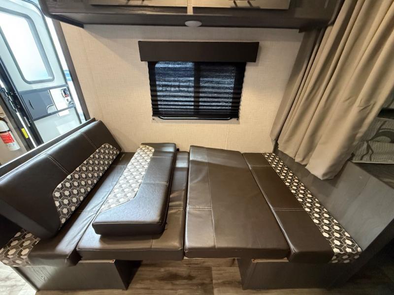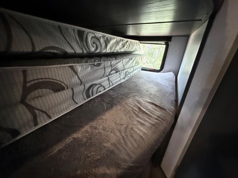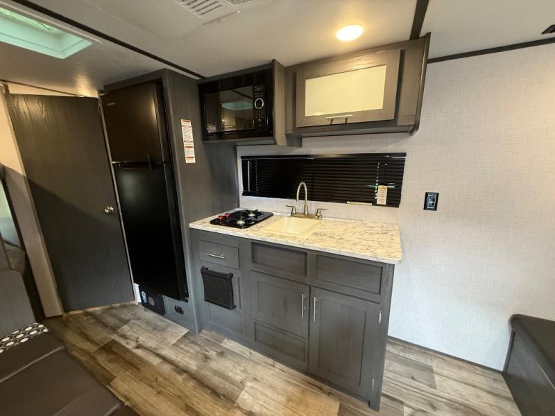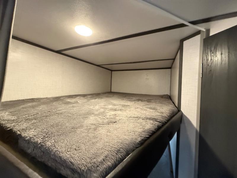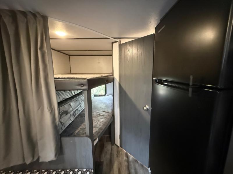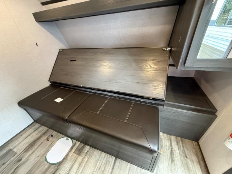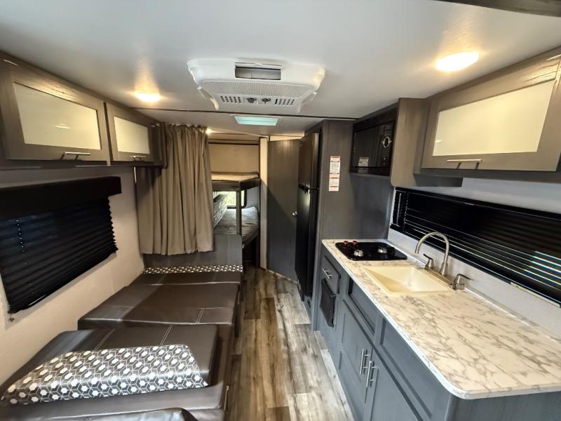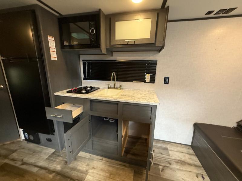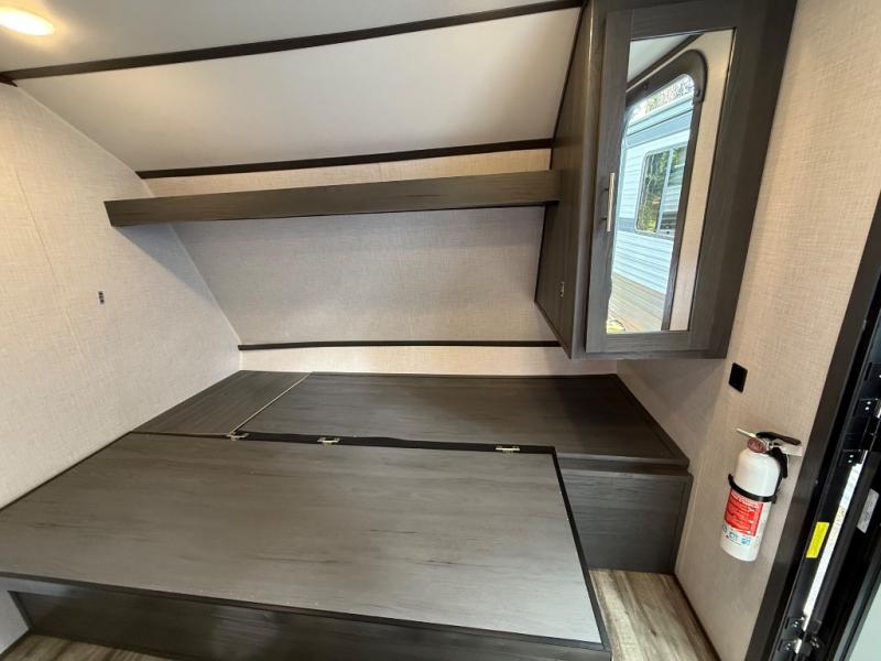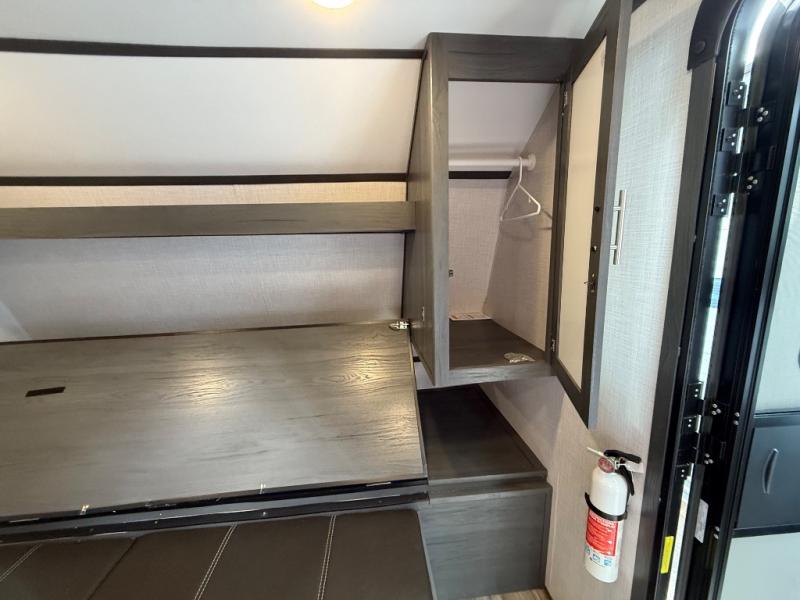 An inside kitchen, an outside refrigerator, a full bathroom and sleeping space for five to seven sound like the perfect RV for you? This trailer offers all that with bunk beds, a residential queen bed and the booth dinette, plus you will have storage in the wardrobe, the overhead cabinets and along the exterior for the larger outdoor items. And the galley kitchen sink with high rise faucet makes cleanup easy.