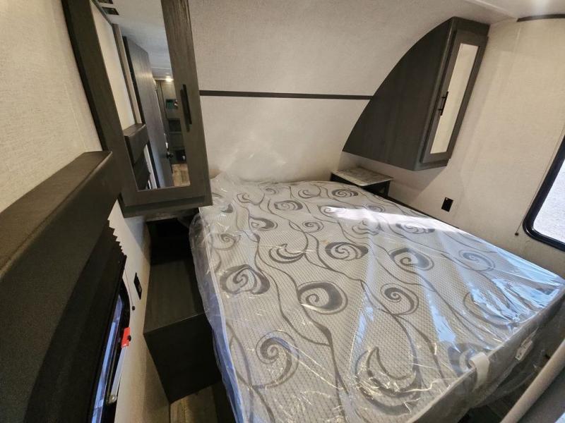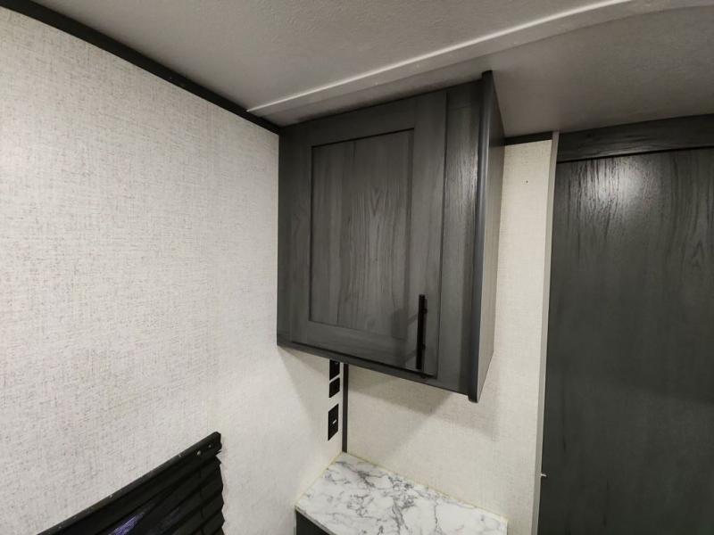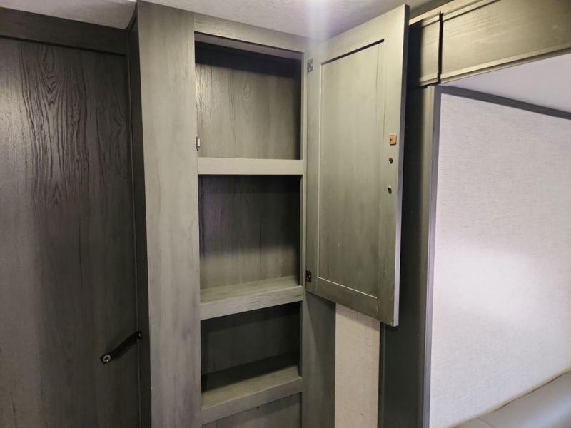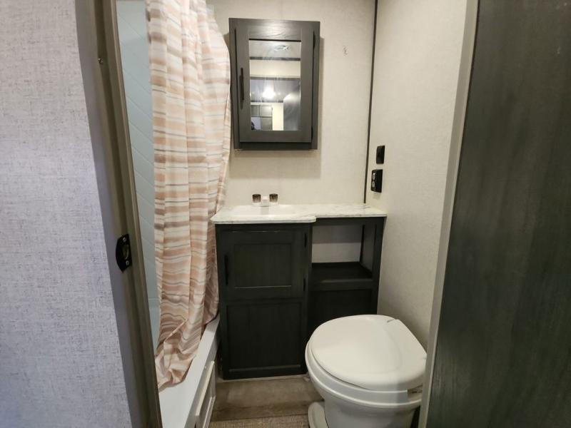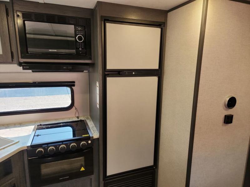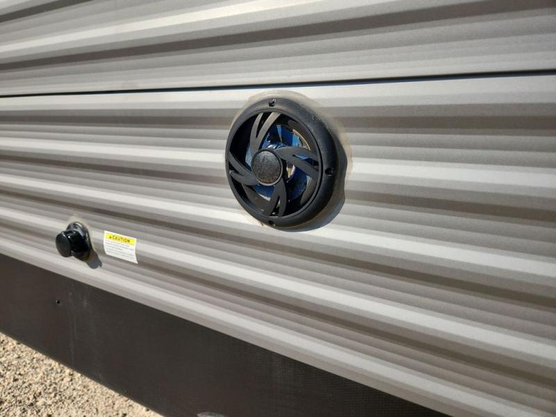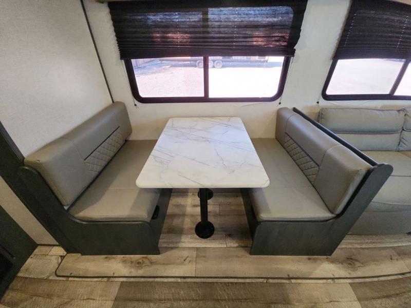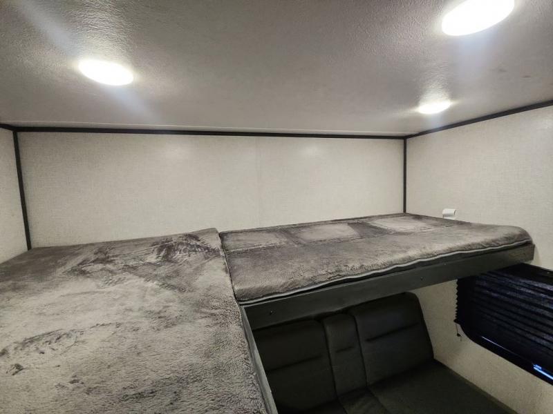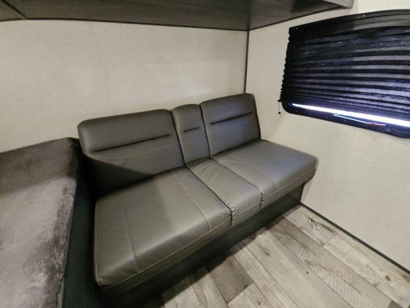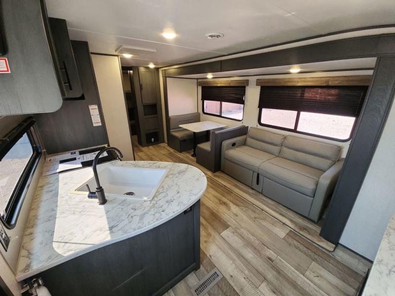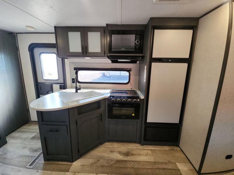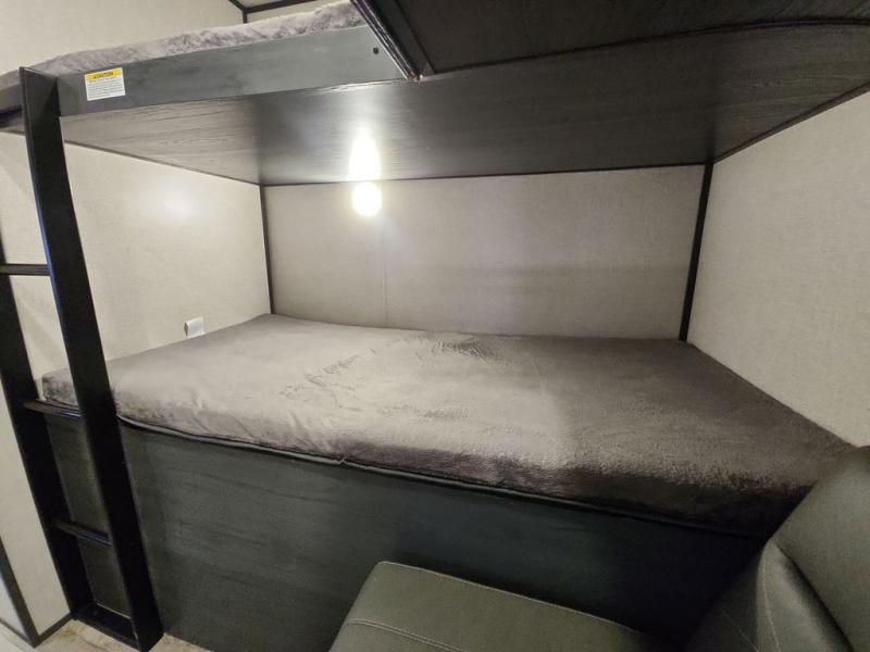 The private bunkhouse might be the main reason you chose this trailer or maybe it was the outside kitchen, either way you will enjoy camping with your family and friends every chance you get. The bunkhouse offers triple bunk beds and a sofa, allowing four people to sleep in privacy. You will have your own bedroom up front to sleep on a residential queen bed with dual access, wardrobes and windows to enjoy the campsite view. The full bathroom offers convenience, and the slide out offers more floor space to move about. There is a booth dinette and sofa to relax on as well as provide more sleeping space for friends and family. The cook will have full amenities including a three burner range top, a galley sink with high rise faucet, plus a 7 cu. ft. refrigerator to store the cold items.