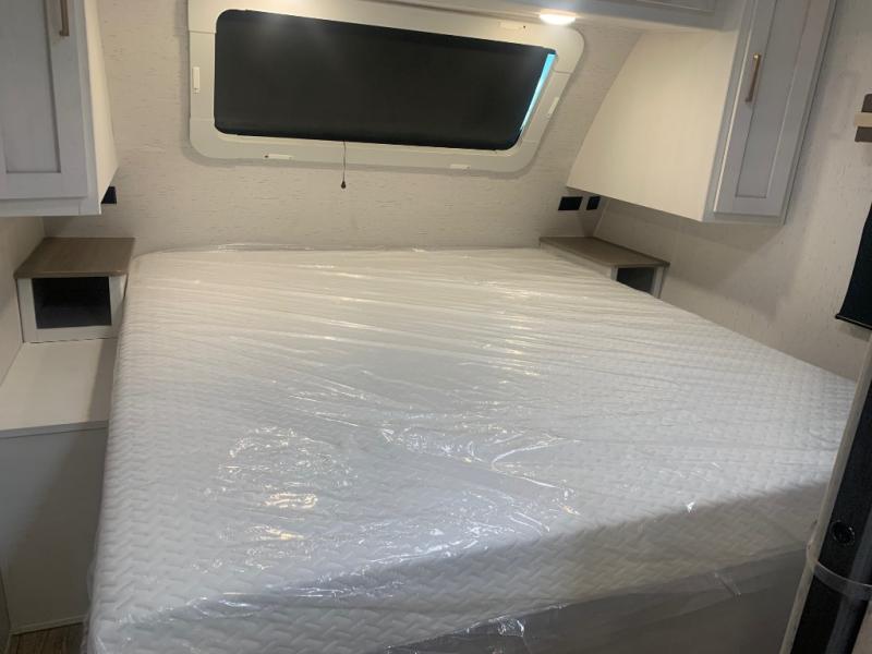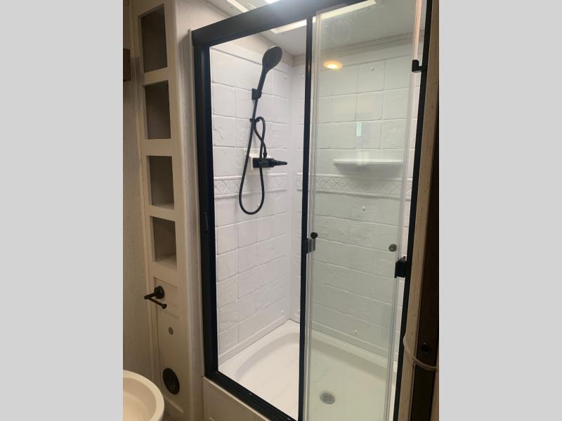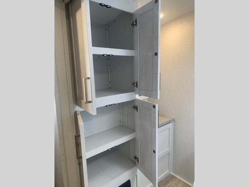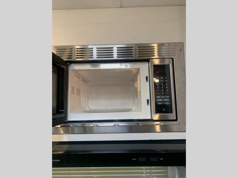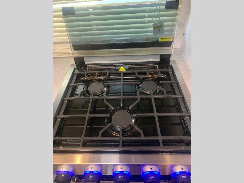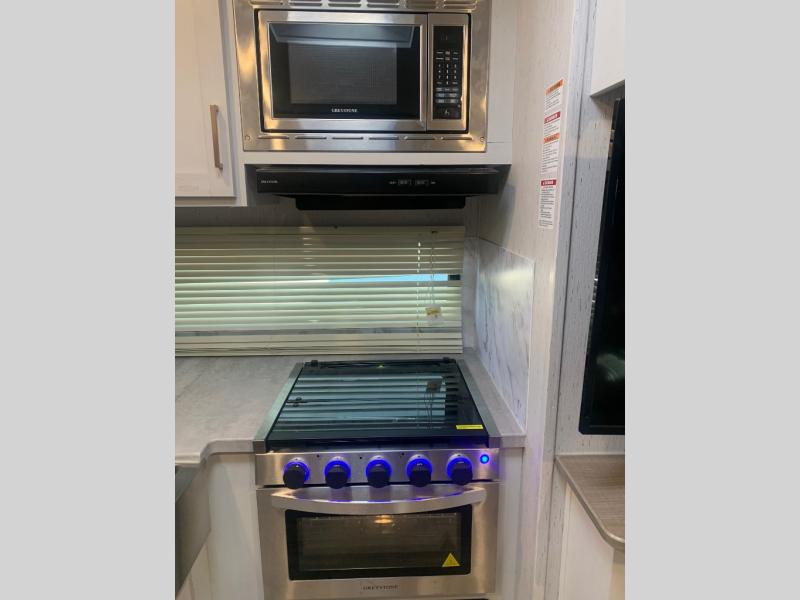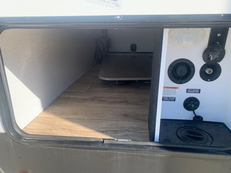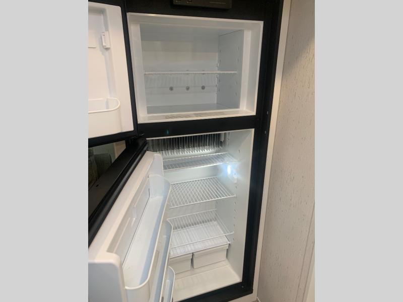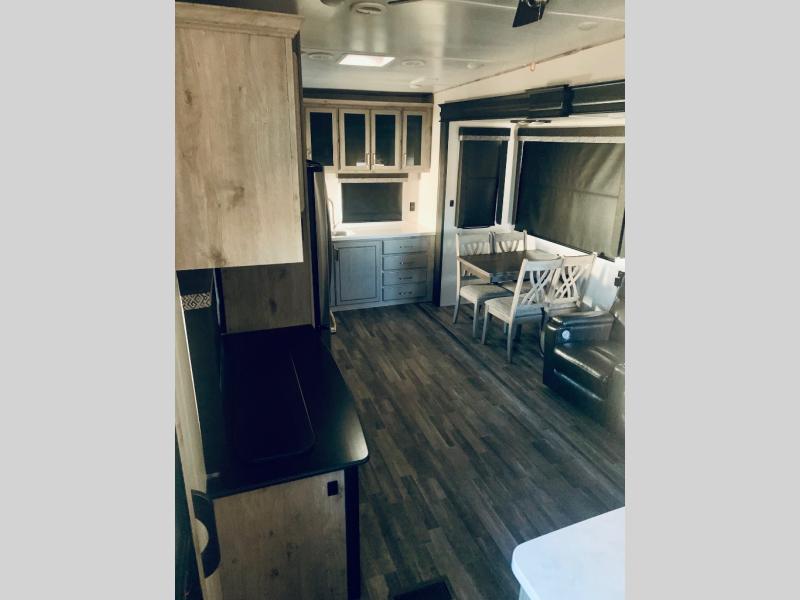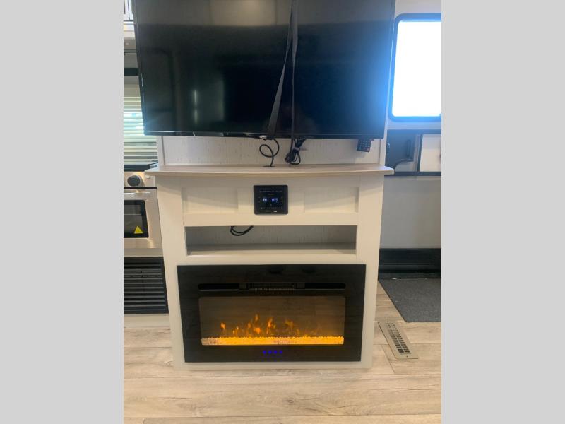 This travel trailer is perfect for two people looking to getaway for the weekend! It features a front private bedroom with a king bed to lay your head at night with wardrobes and nightstands on either side. You can prepare your best meals with the glass top three burner cooktop with a 21" oven and the 10 cu. ft. double door refrigerator then enjoy them at the 78" chaise lounge with a removeable table. The lounge is also conveniently across from an entertainment center with a fireplace and a HD LED TV. Inside the full rear bathroom is a walk-in shower to freshen up in each morning and a closet to keep your linens close.