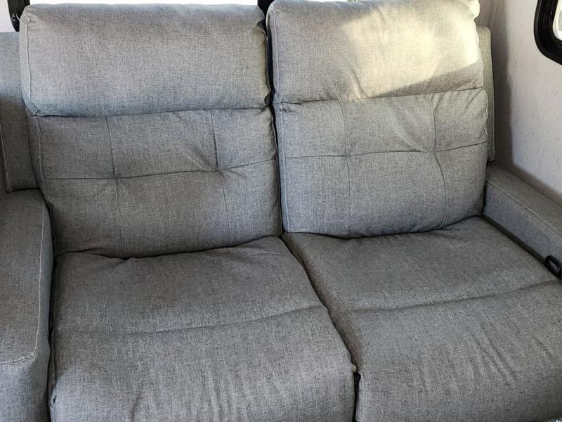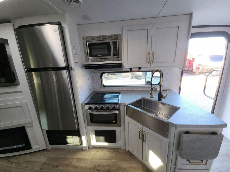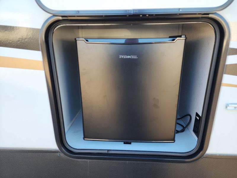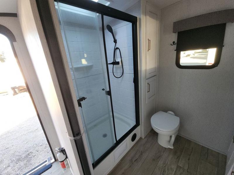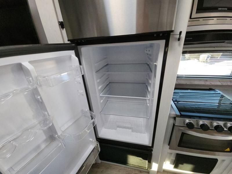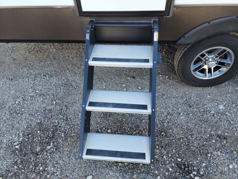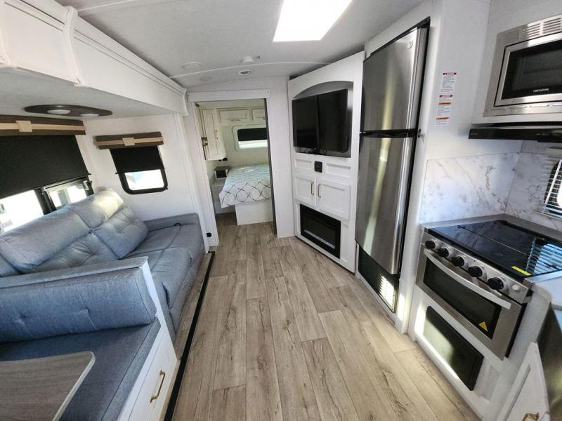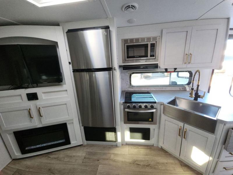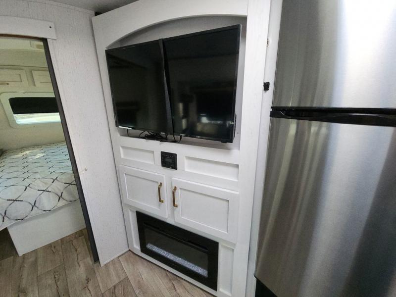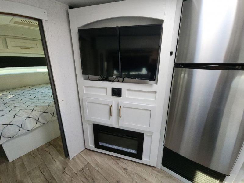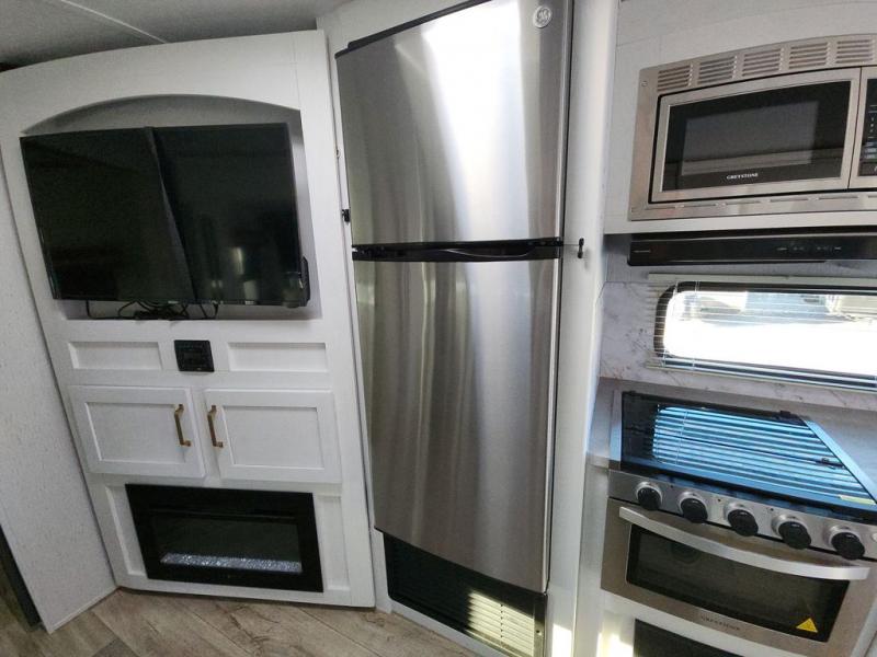 Enjoy relaxing weekends at the campground in this cozy travel trailer for five to six. The large slide will provide a spacious living area, and there is a U-shaped dinette and tri-fold sofa within the slide for seating and sleeping space. The hinged entertainment center hides the pantry, and the fireplace will make it feel more like home. Prepare home cooked meals on the three burner range, or use the microwave oven. You'll find the countertop extension will provide more space to prep meals, and the 10 cu. ft. double door refrigerator can store your perishables for the whole weekend. This model also includes a spacious full rear bath with dual bath sinks so two can get ready at the same time, and you'll love the front private bedroom with a king bed for all-around comfort!